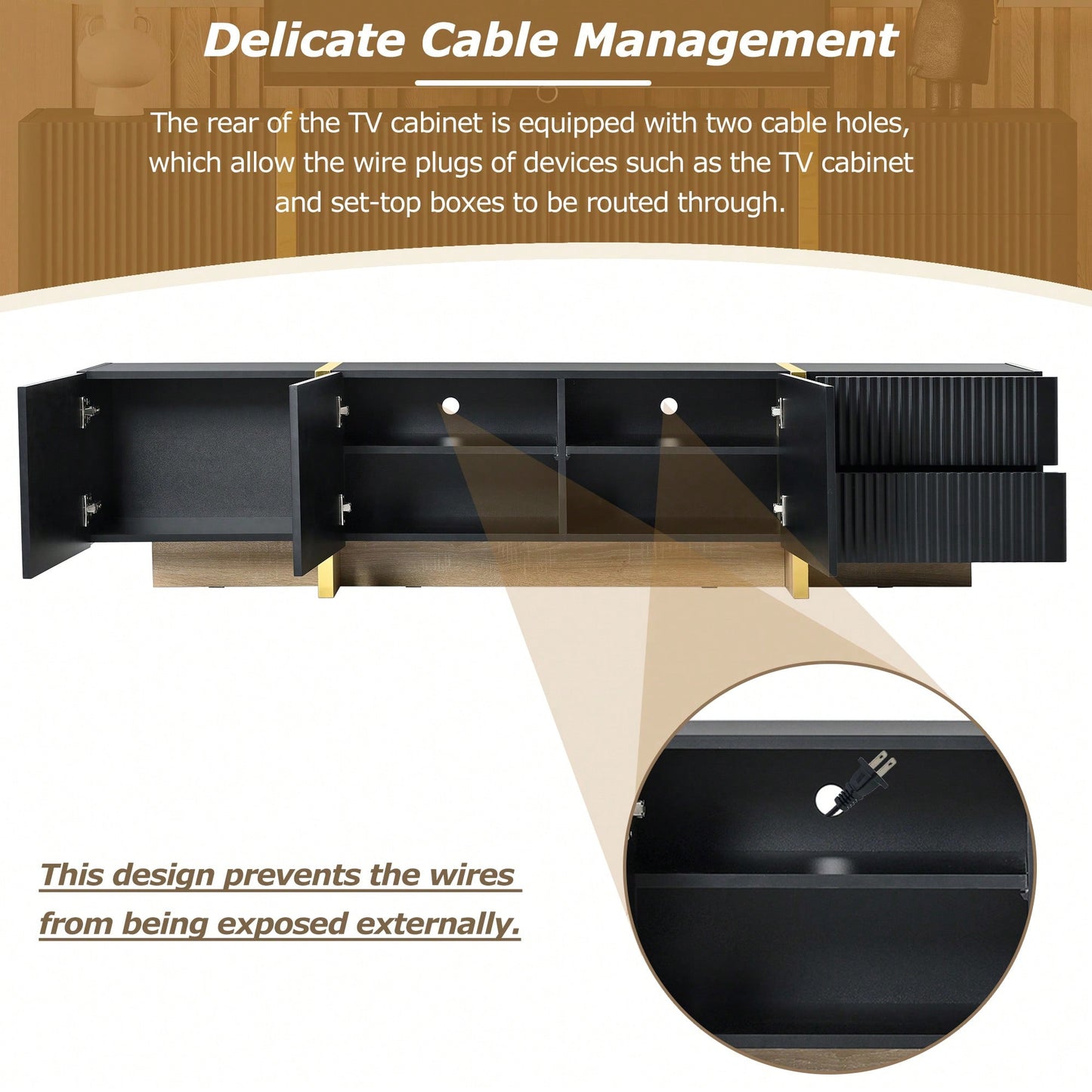 The thoughtful design includes multiple storage spaces with cabinets and drawers, perfect for organizing magazines, remote controls, and other essentials, ensuring your living area remains tidy and stylish. Designed with cable management in mind, the unit features cable holes at the back to neatly route wires, creating a clean and uncluttered look.