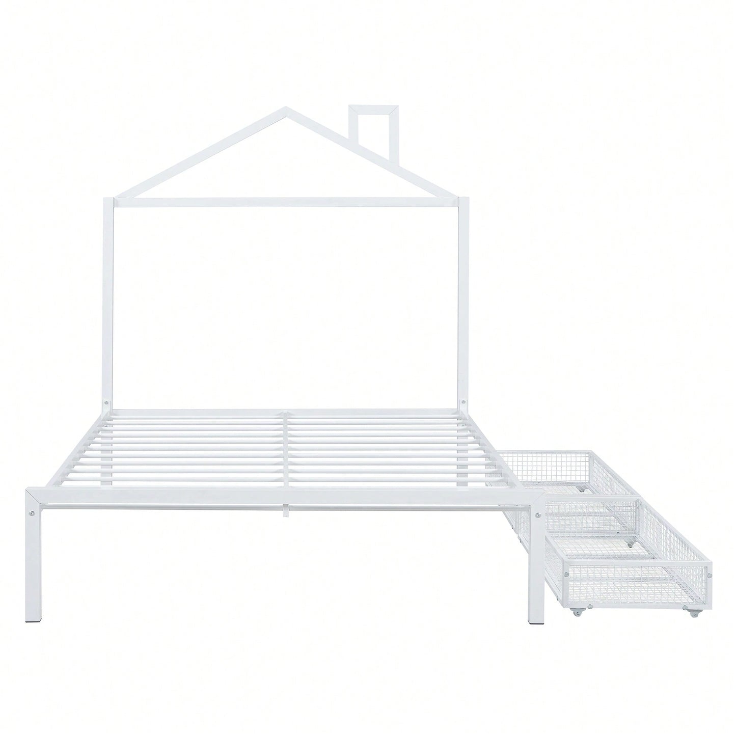 Stylish Full Size Metal Platform Bed With Storage Drawers And House-Shaped Headboard In White