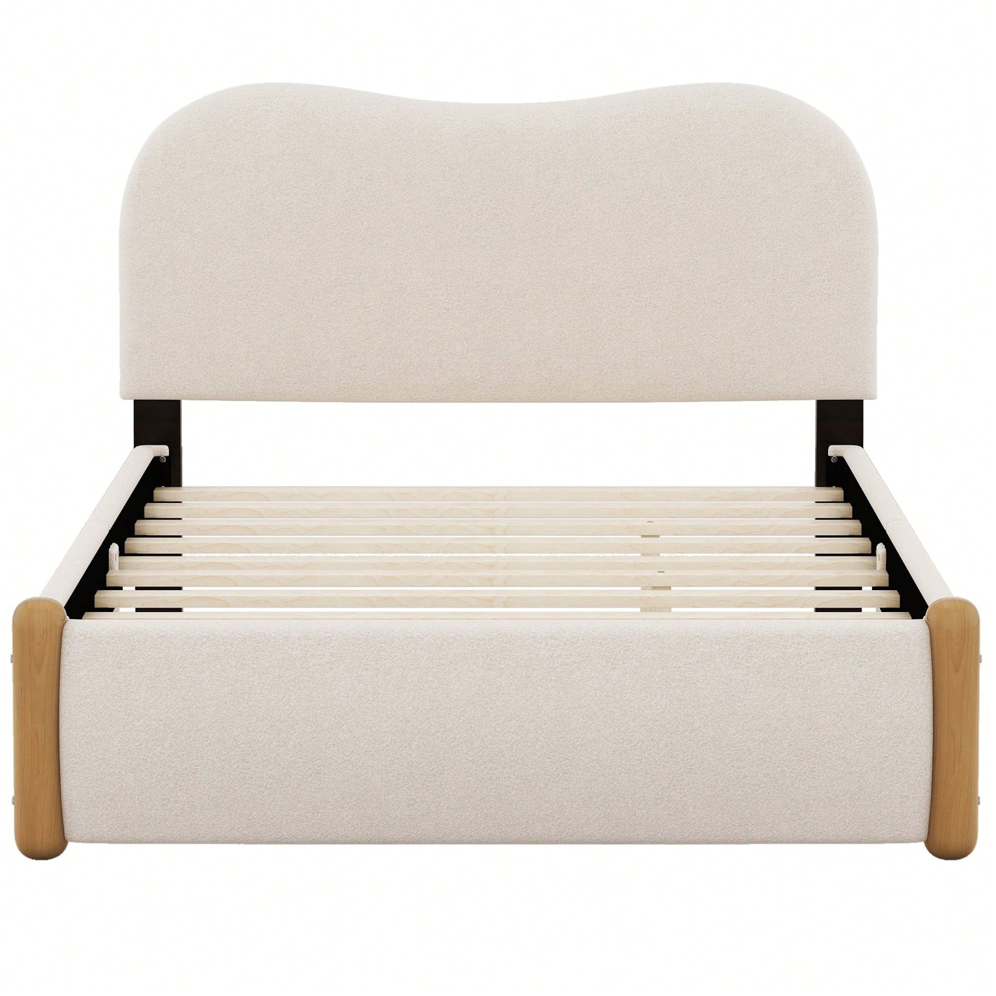 This platform bed features an elegant arc-shaped headboard that adds a touch of warmth and style to any bedroom decor. The soft beige Berber fleece covering provides a comfortable and inviting atmosphere, ideal for relaxation. Its solid construction using pine wood and MDF ensures a high level of durability and support, accommodating a mattress without the need for a box spring.
