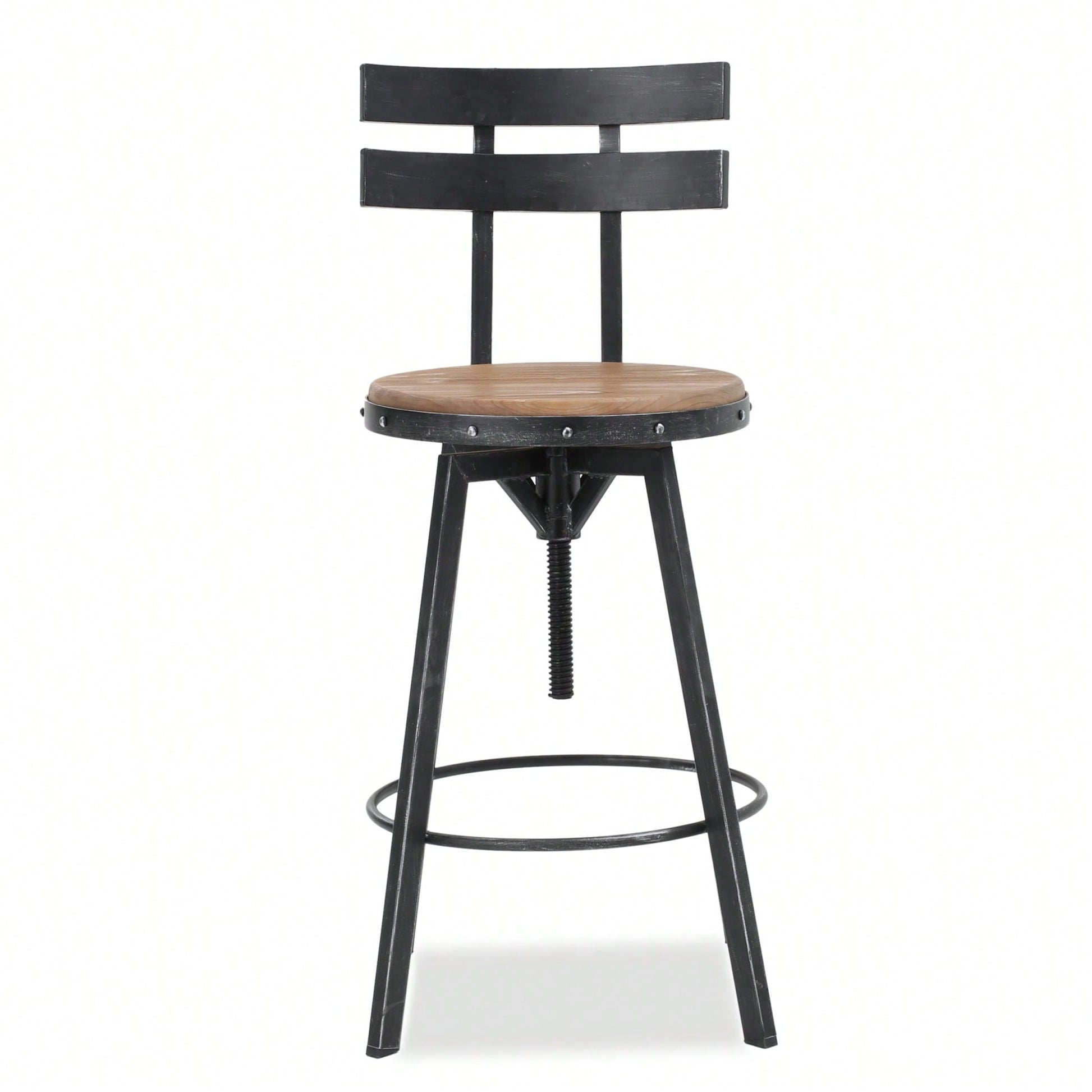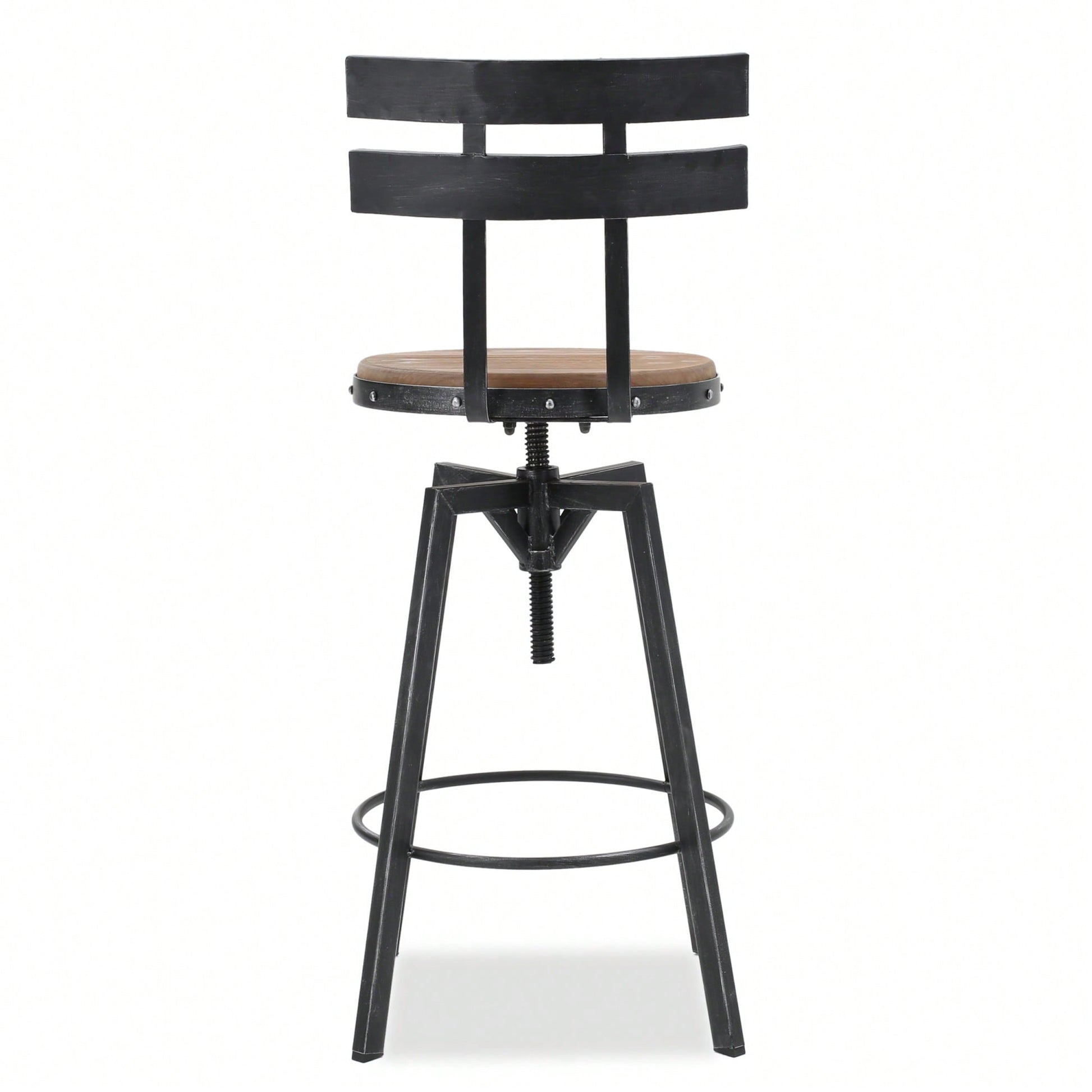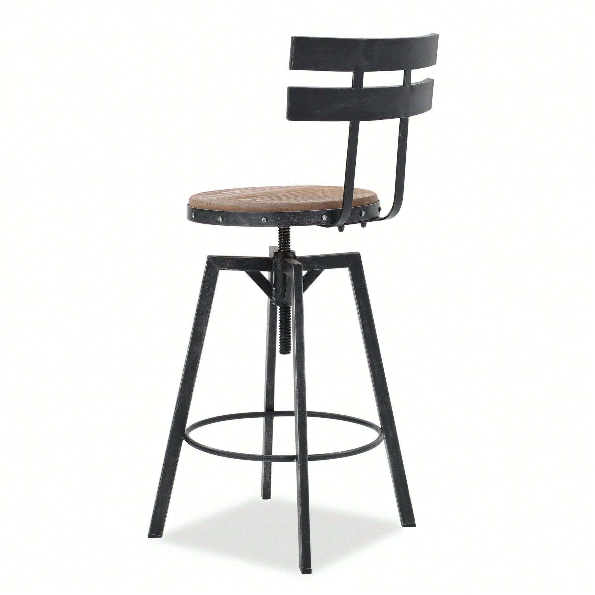 This barstool combines a sleek metal seat backing with a wood-like finish, making it an attractive addition to any kitchen or dining area. The black brush silver metal framework complements the antique finish of the firwood seat, creating a stylish yet rustic look. With its smooth design on both sides of the seat backing, this barstool offers both comfort and aesthetic appeal.