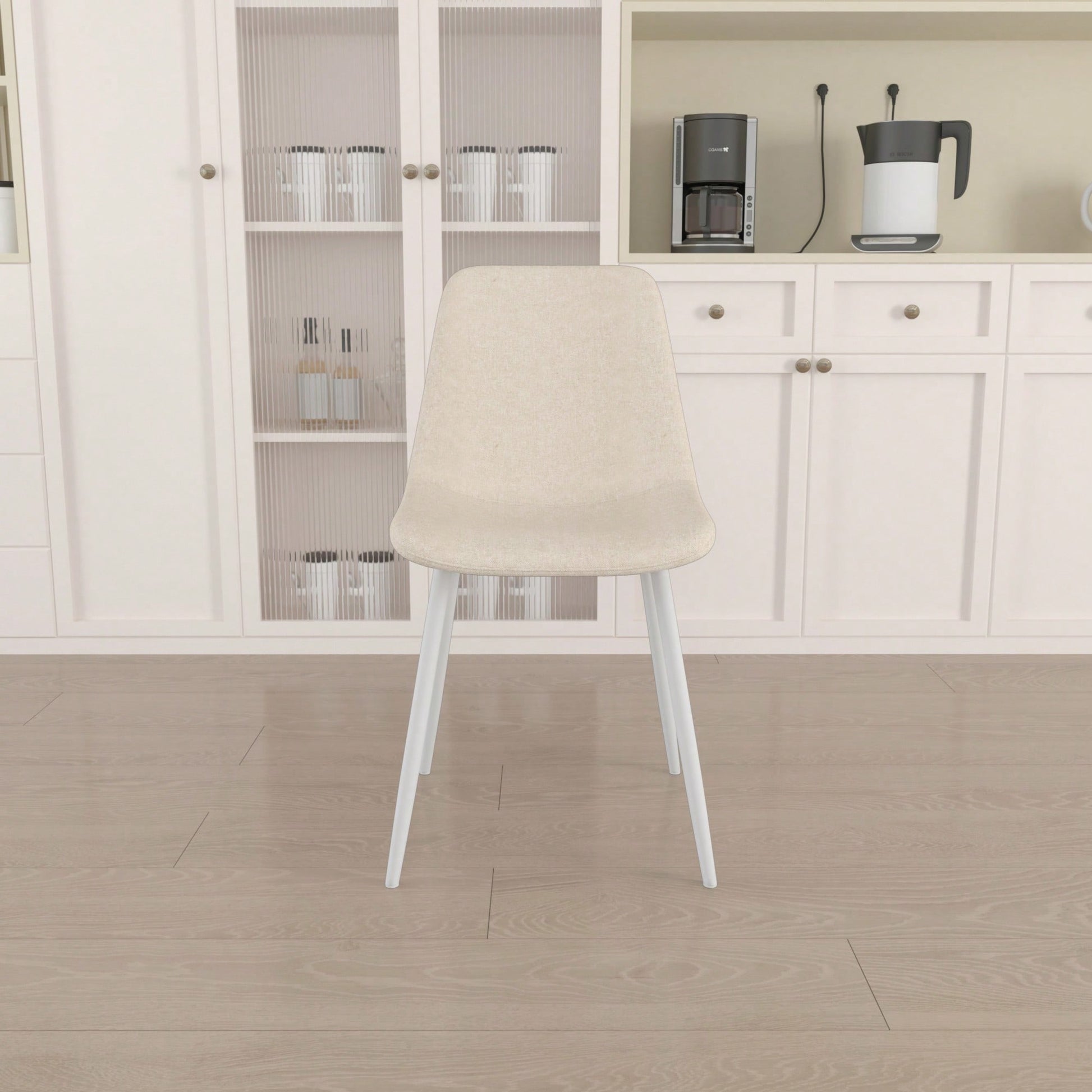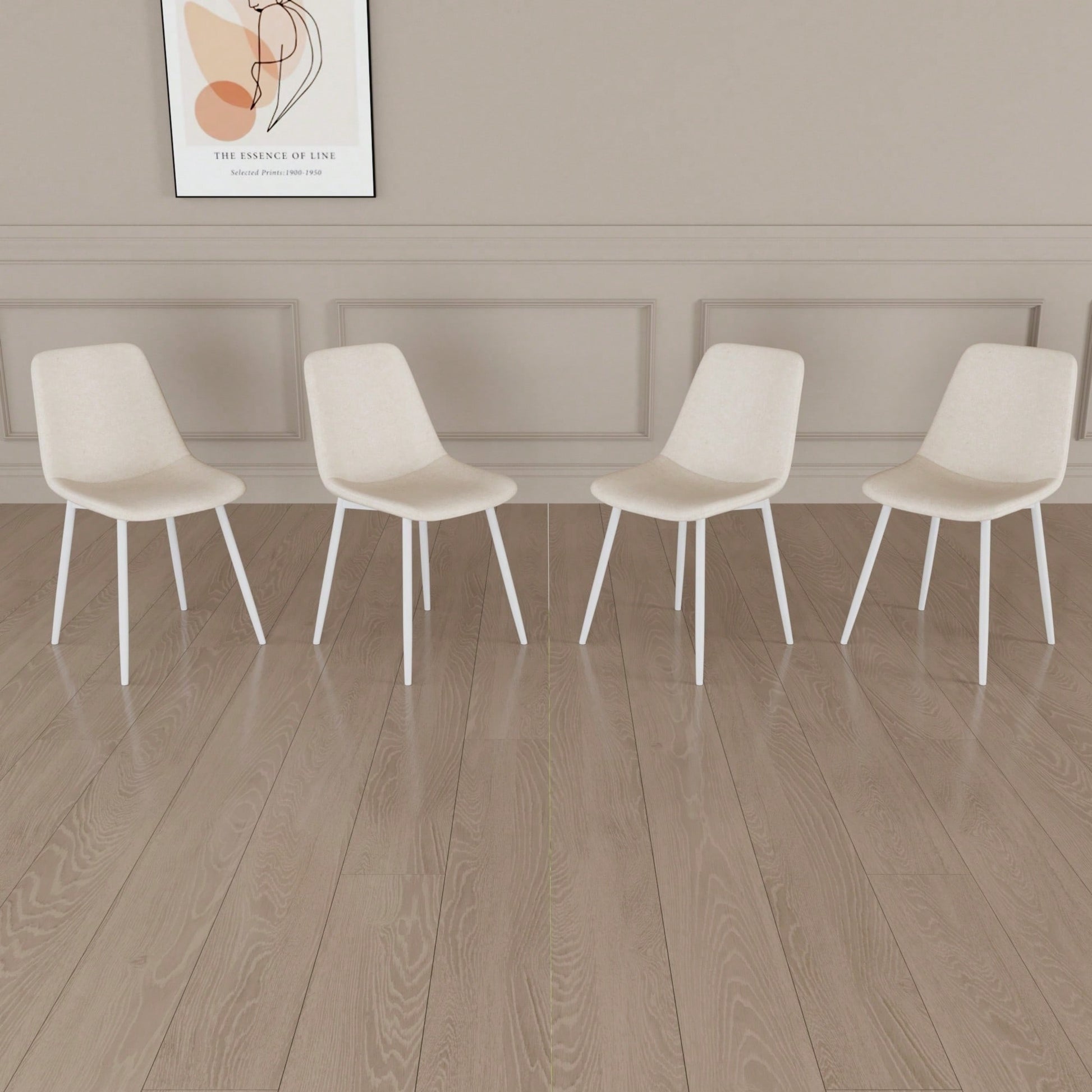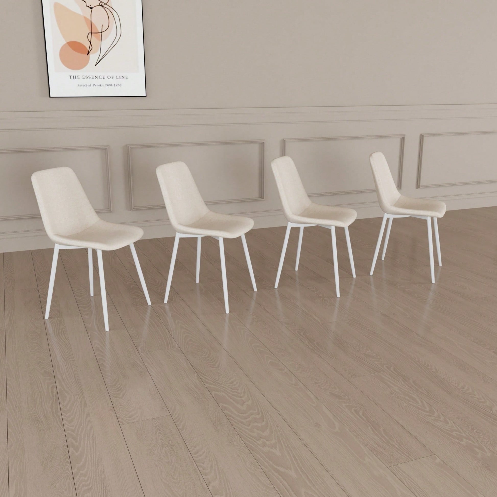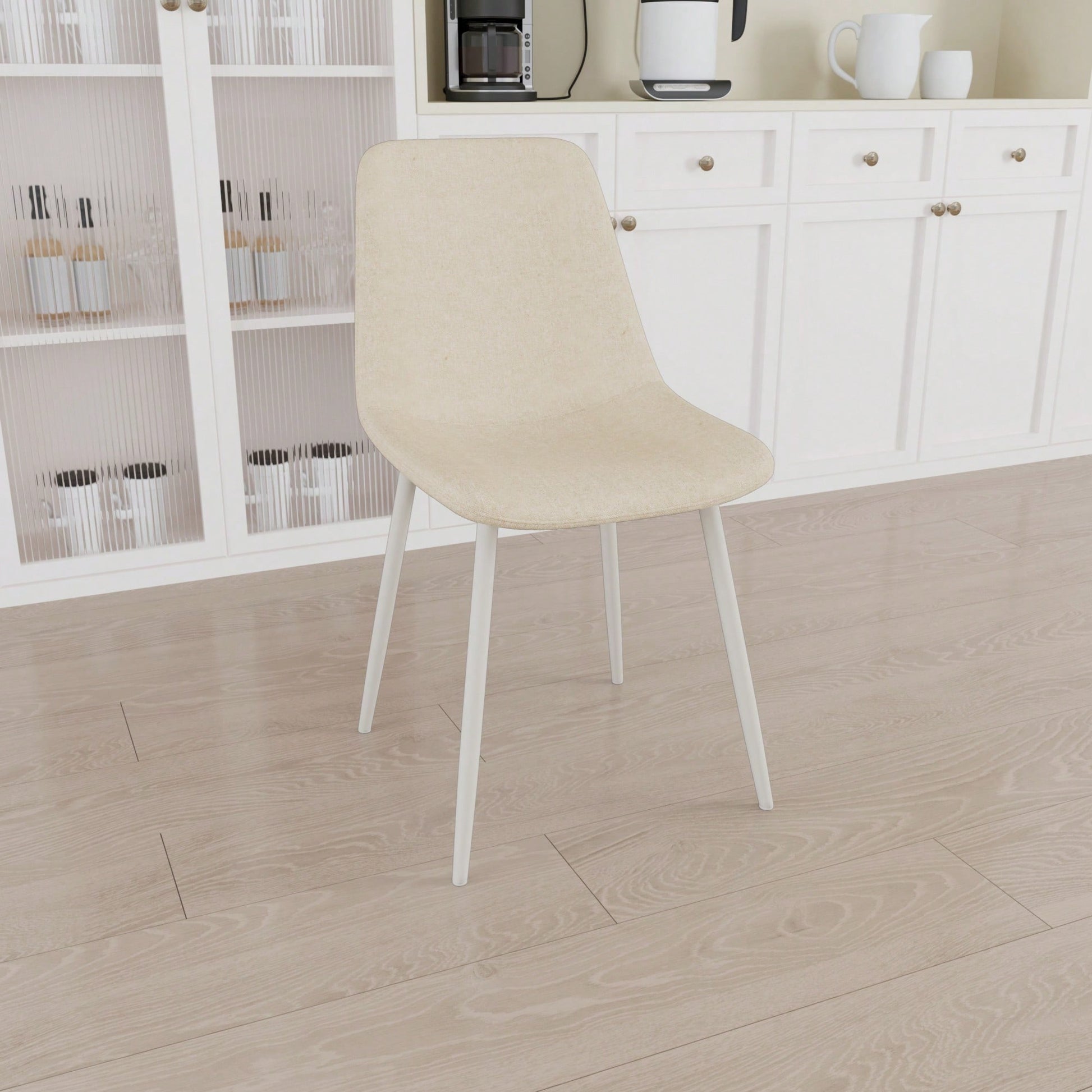 Stylish Set Of 4 Modern Linen Padded Dining Chairs With Sturdy White Metal Legs - Beige Fabric Seating For Kitchen And Dining Room