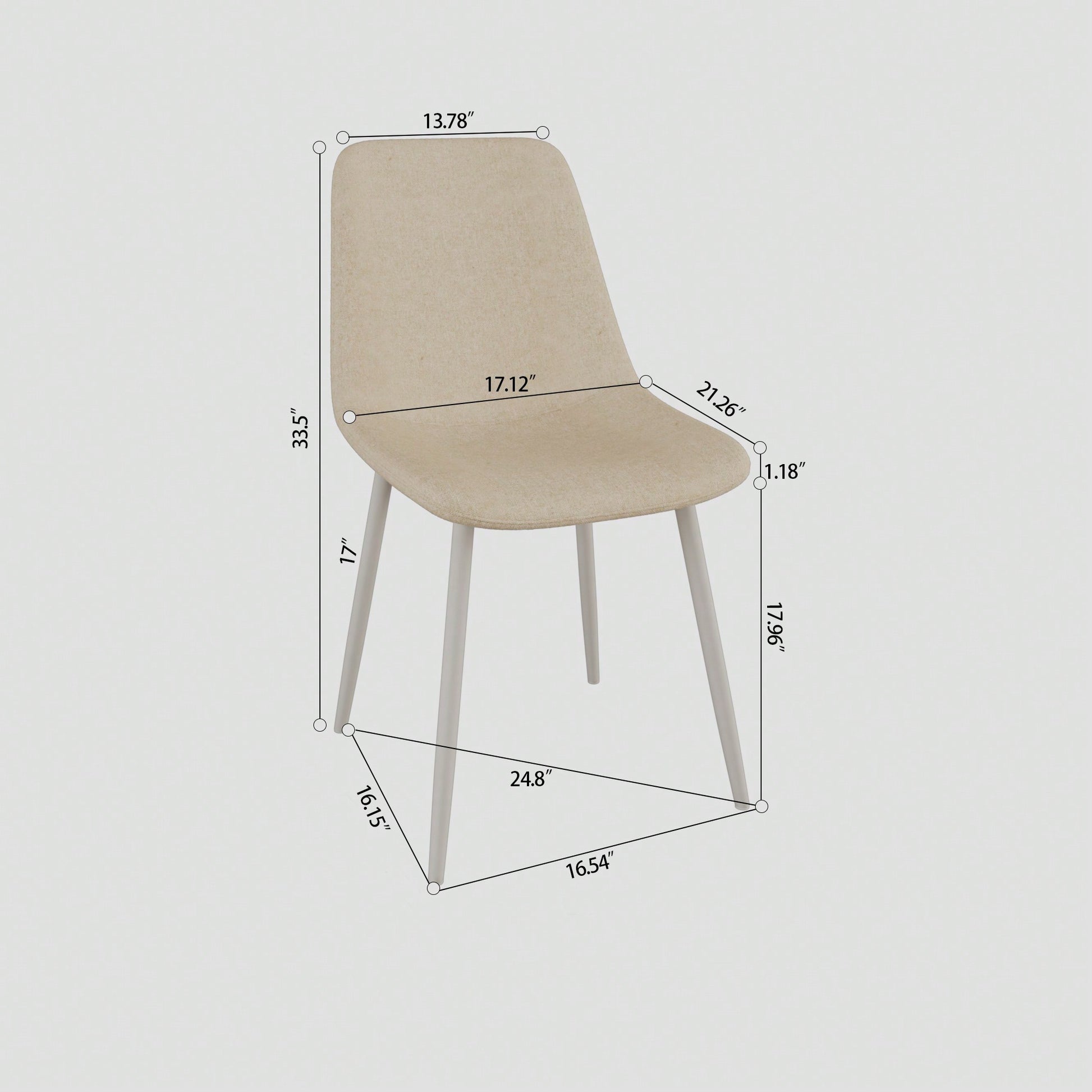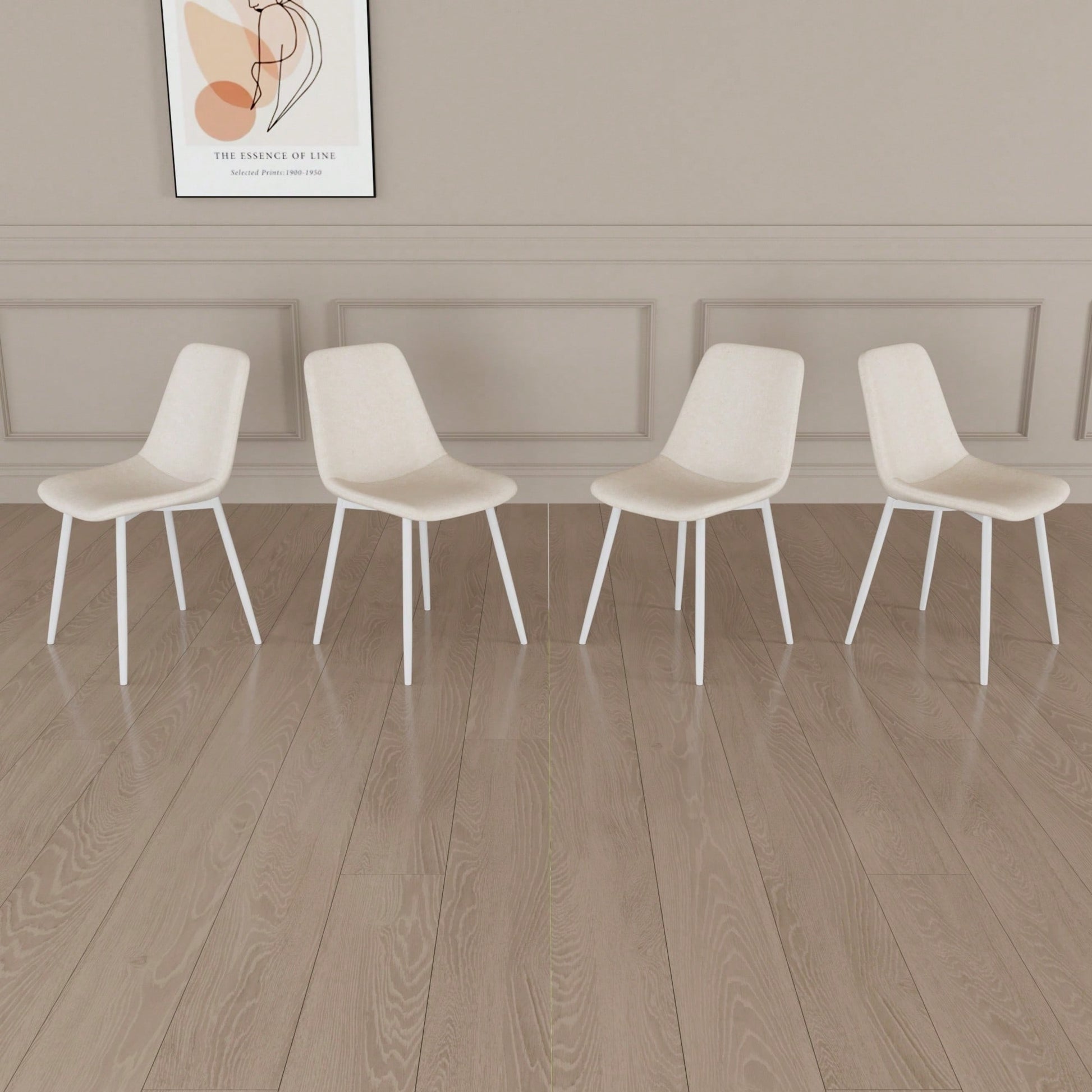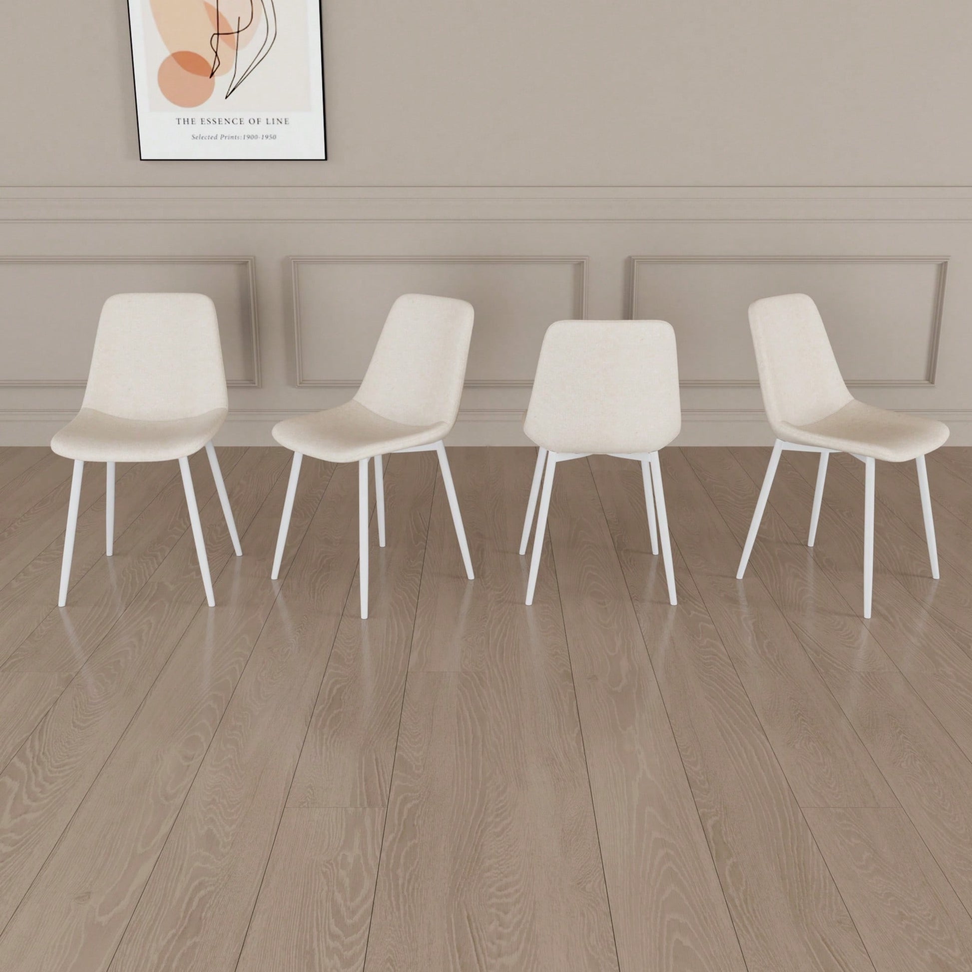 Stylish Set Of 4 Modern Linen Padded Dining Chairs With Sturdy White Metal Legs - Beige Fabric Seating For Kitchen And Dining Room