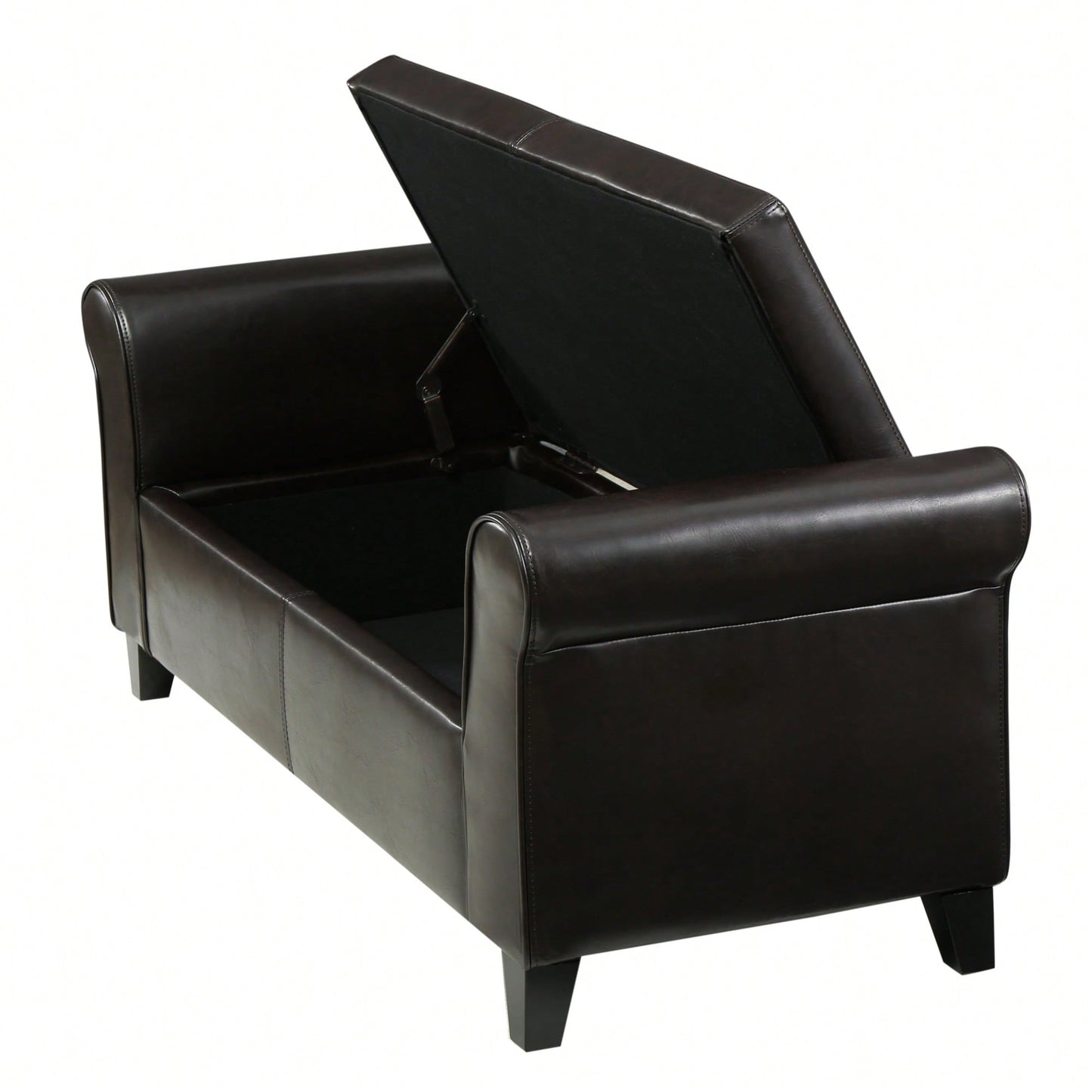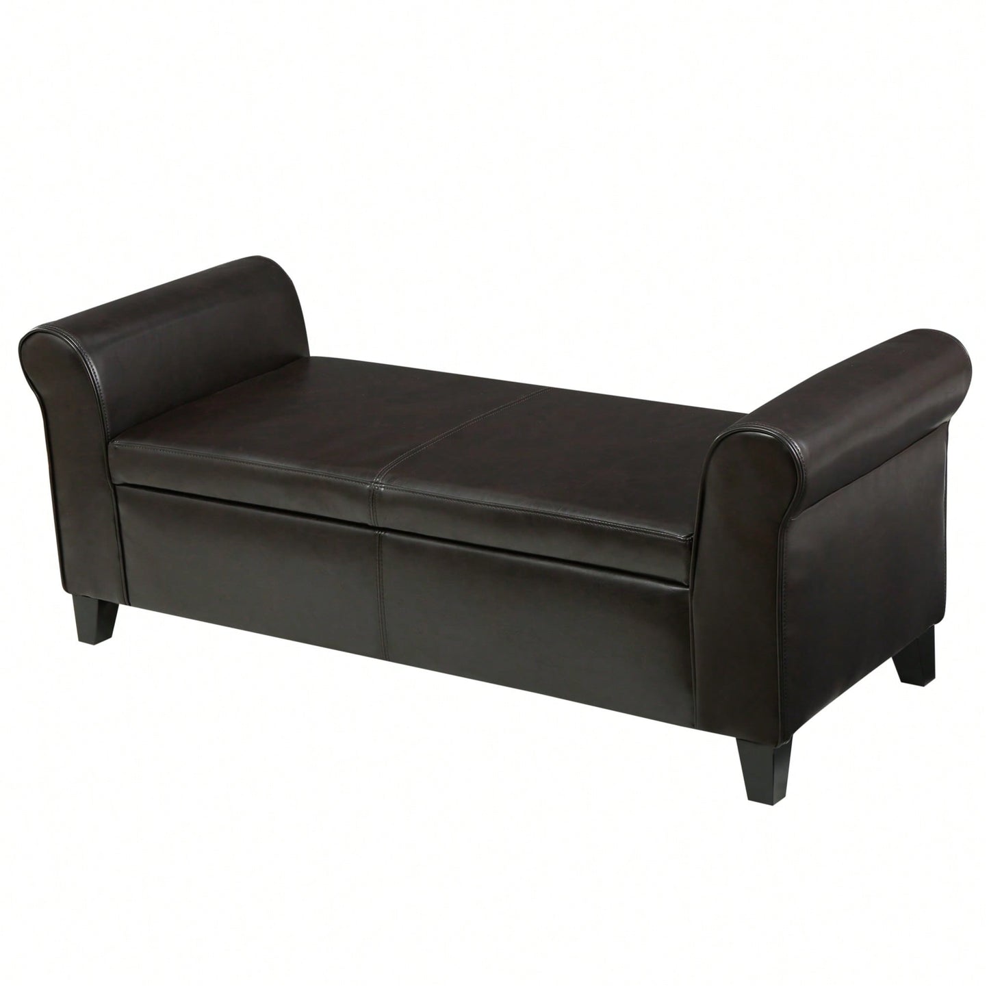 1. Features: - Constructed of wood with PU leather upholstery - Brown color complements most existing décor - Assembly required - Durable solid wood frame ensures longevity - Plush design with padded arms for added comfort 2. Product Description: This armed storage bench is designed to provide both style and functionality. The elegant PU leather exterior enhances any space while offering a comfortable seating option. With its solid wood construction, this bench is built to last, making it a practical addition to your home. The plush design and padded arms create a cozy spot to relax, while the storage feature adds convenience. Specifications: - Material: Wood, PU leather - Color: Brown - Assembly: Required