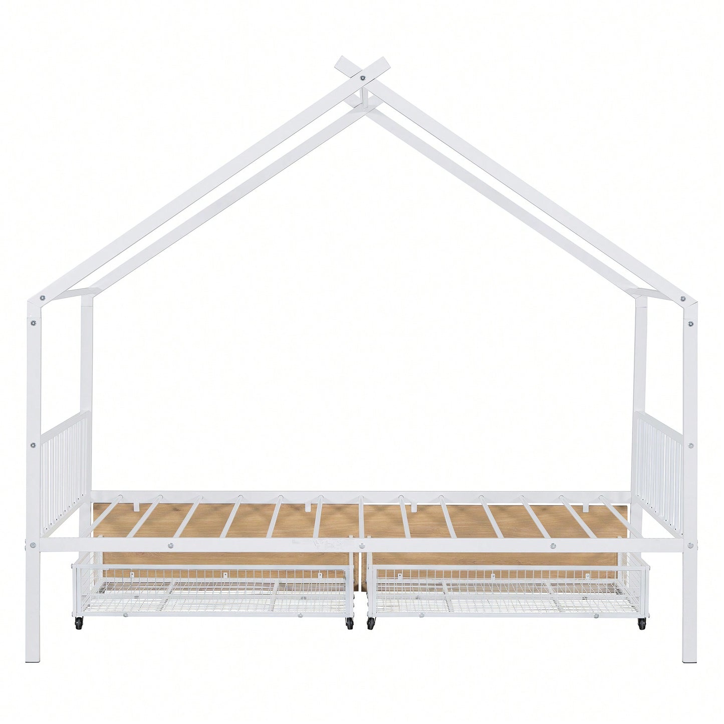 Transform your child's bedroom into a whimsical retreat with this house-shaped metal platform bed. The charming design not only adds a playful touch but also provides a comfortable and secure sleeping space. The bed features two roomy drawers underneath, perfect for keeping the room organized by storing clothing, toys, and other belongings. Crafted from sturdy metal, this bed is built to withstand daily use while supporting a weight capacity of up to 350 pounds.