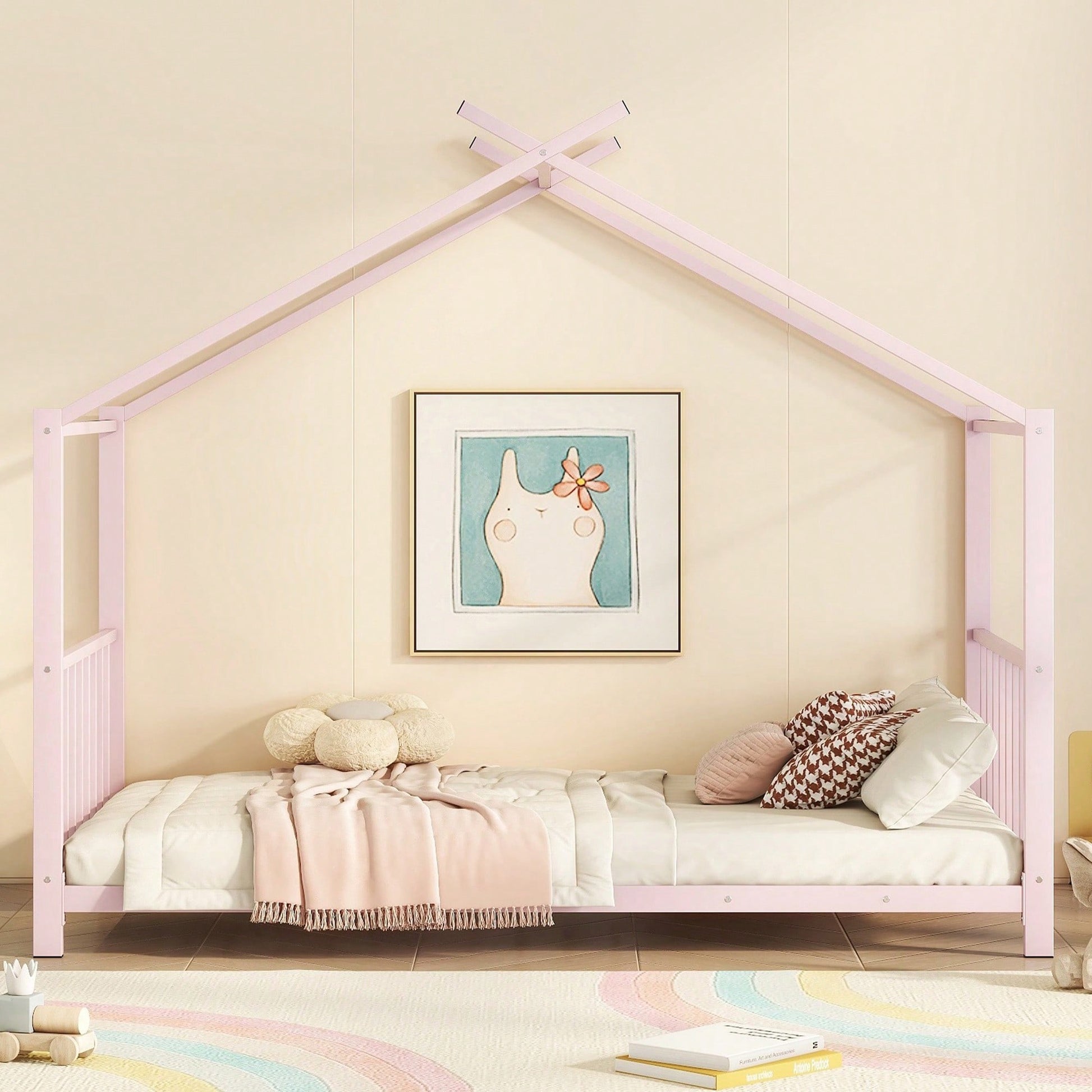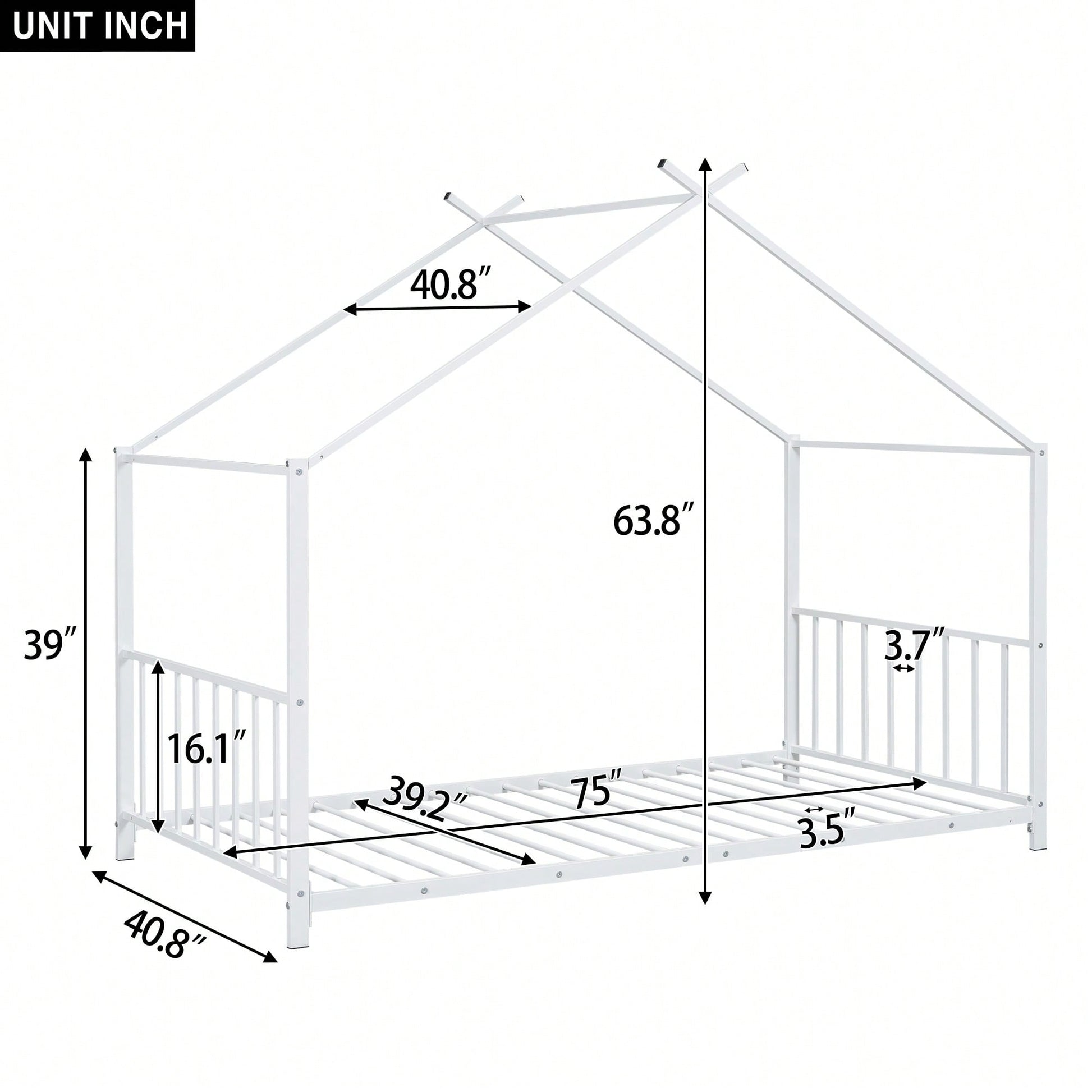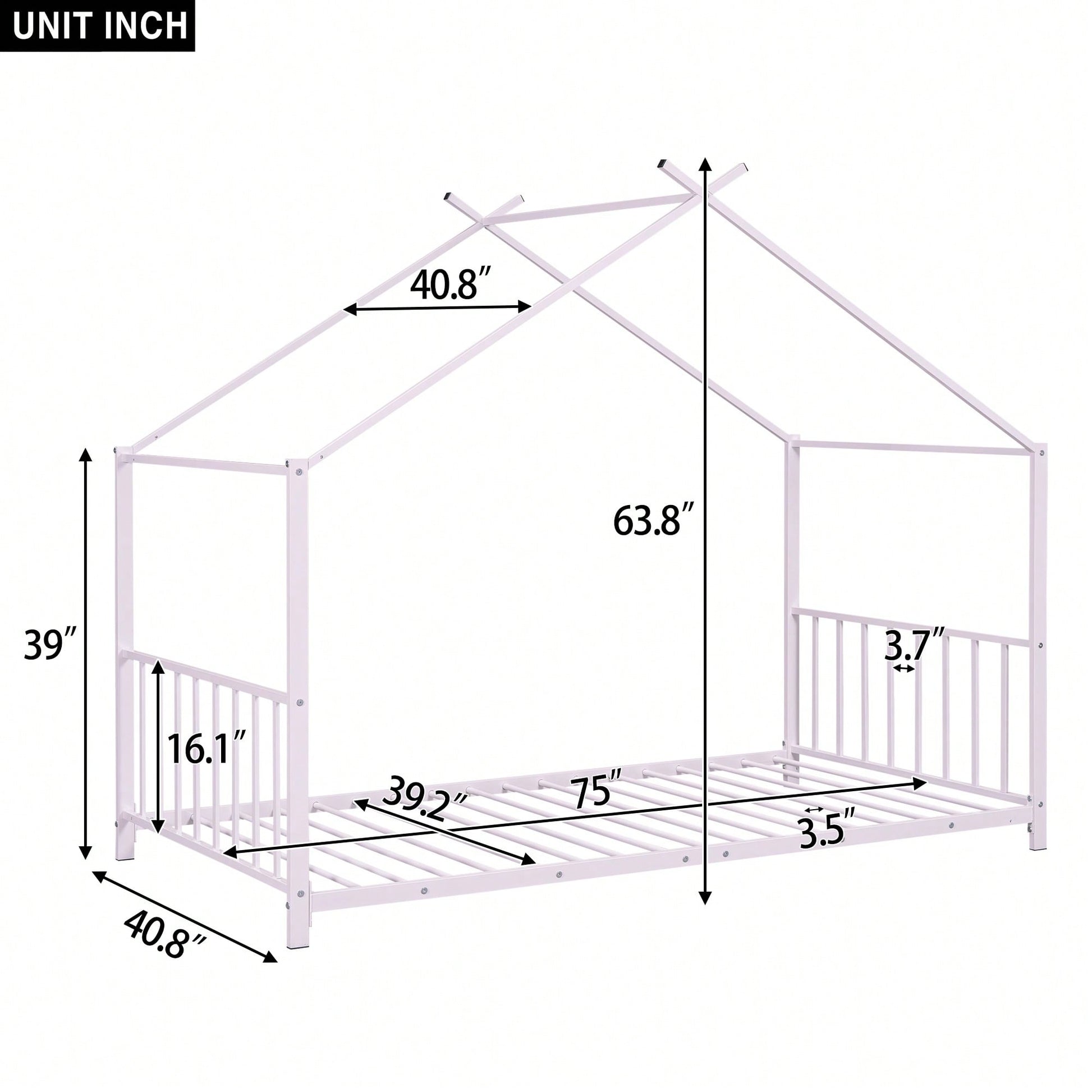 This twin size metal house platform bed features a whimsical design that brings character to your child's room. The classic house shape allows for creative decoration, making it a perfect fit for various styles while promoting imaginative play. Constructed from a durable metal frame, this bed is designed for stability and can withstand the rigors of daily use, providing a safe sleeping environment for kids. Assembly is straightforward, with all necessary parts included and clearly labeled, ensuring a hassle-free setup. The bed's slatted support system eliminates the need for a box spring, keeping the mattress secure and extending its lifespan.