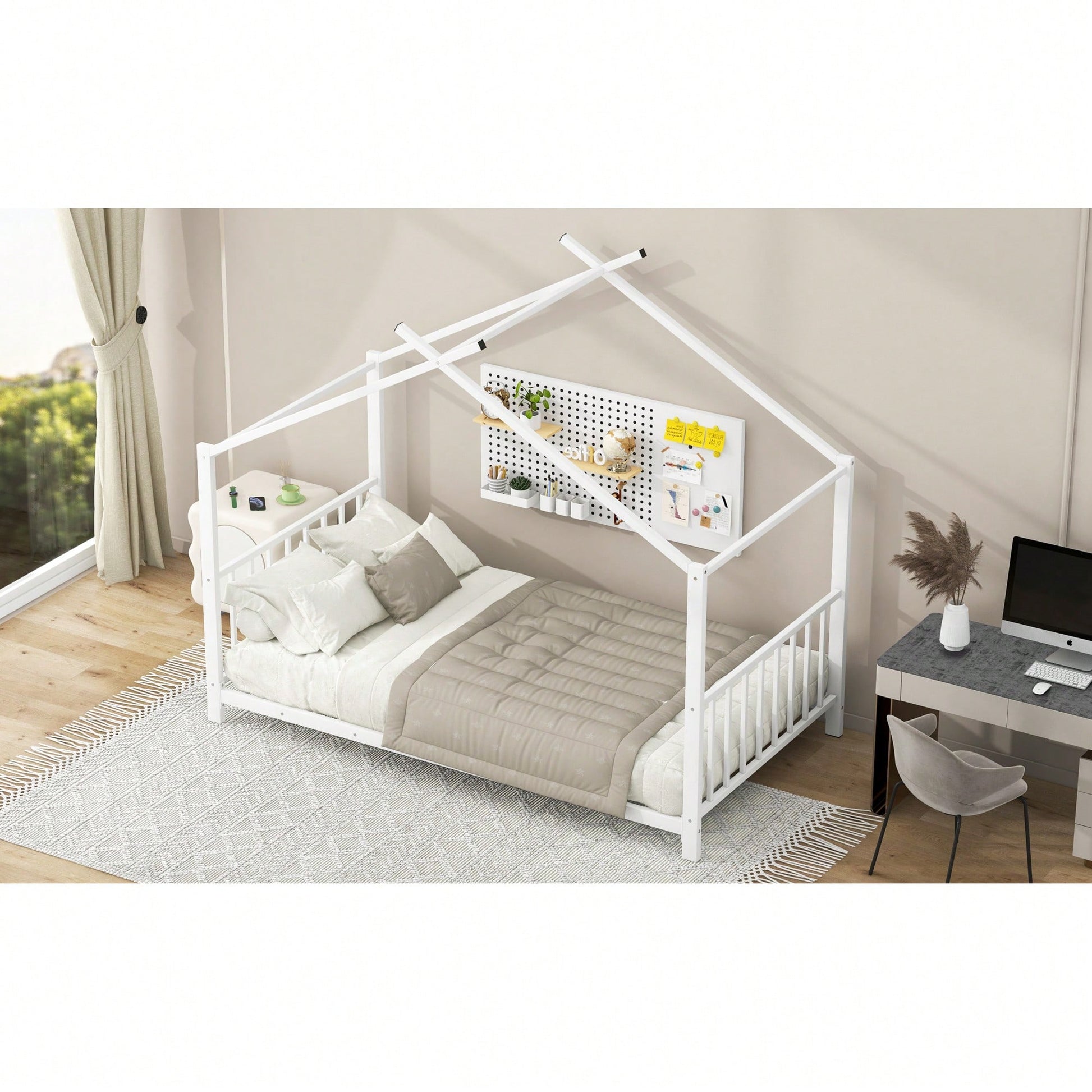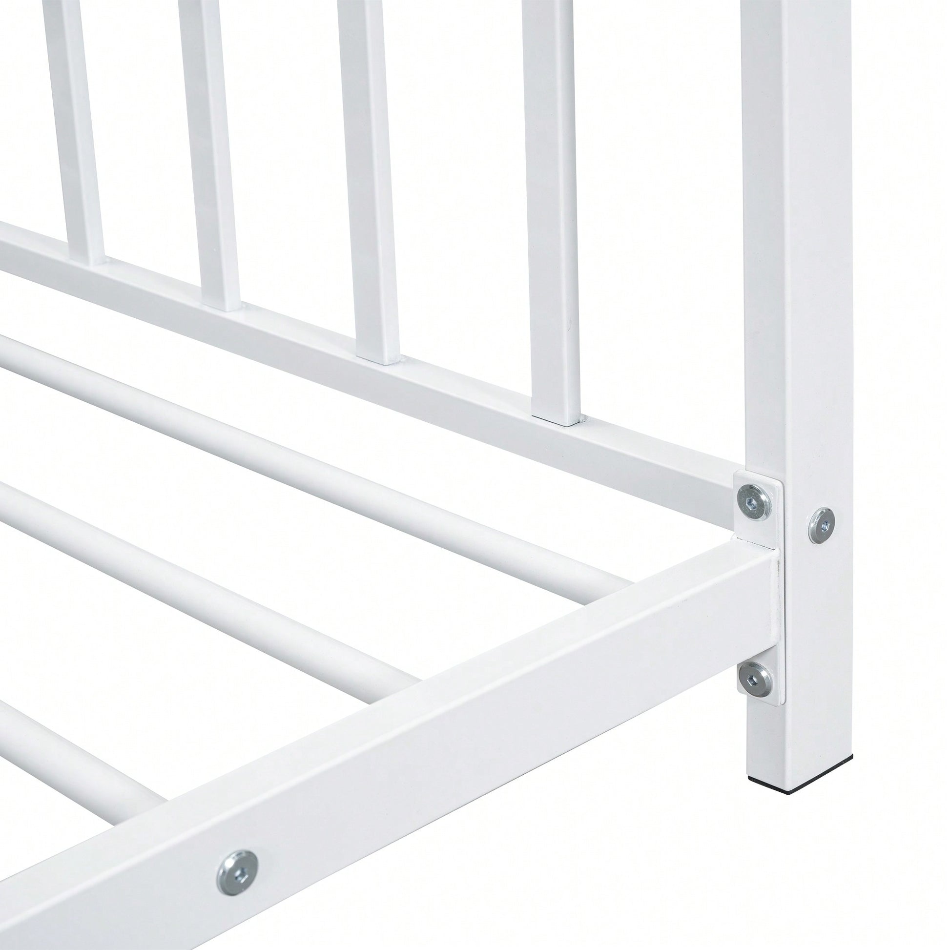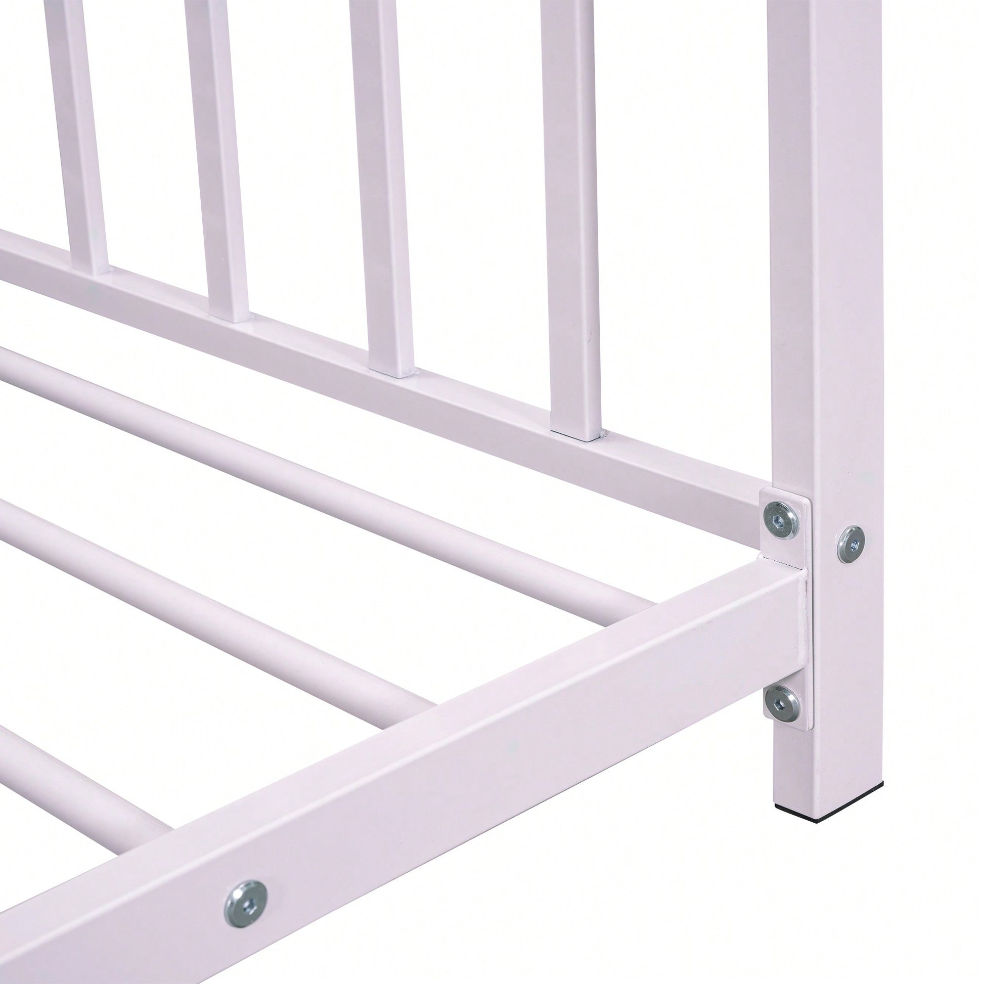 This twin size metal house platform bed features a whimsical design that brings character to your child's room. The classic house shape allows for creative decoration, making it a perfect fit for various styles while promoting imaginative play. Constructed from a durable metal frame, this bed is designed for stability and can withstand the rigors of daily use, providing a safe sleeping environment for kids. Assembly is straightforward, with all necessary parts included and clearly labeled, ensuring a hassle-free setup. The bed's slatted support system eliminates the need for a box spring, keeping the mattress secure and extending its lifespan.