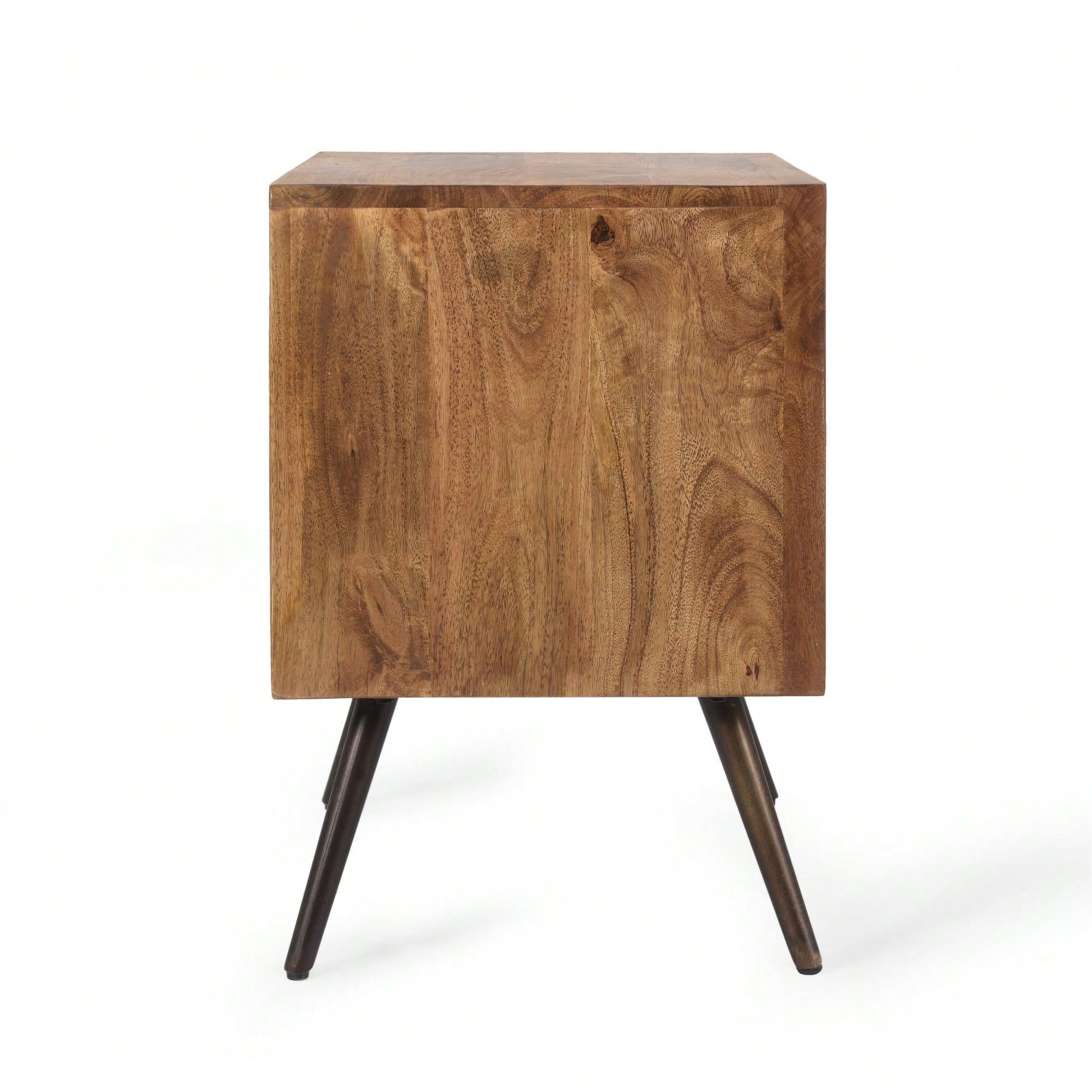 This beautifully crafted accent cabinet combines a mid-century modern aesthetic with a bohemian touch. The handmade chevron design on the cabinet doors not only adds visual interest but reflects the exceptional artisan craftsmanship. The cabinet is made from mango wood, known for its stunning golden browns and unique patterns, which are complemented by a robust iron framework. Its design includes splayed legs that provide both style and stability. With a thoughtful layout that maximizes storage, this piece is perfect for keeping your space tidy while making a design statement. The dimensions of the cabinet are 17.50" W x 15.00" D x 21.50" H, making it an ideal addition to various room settings.