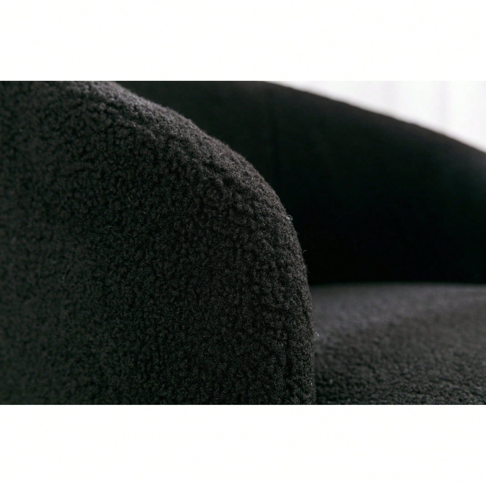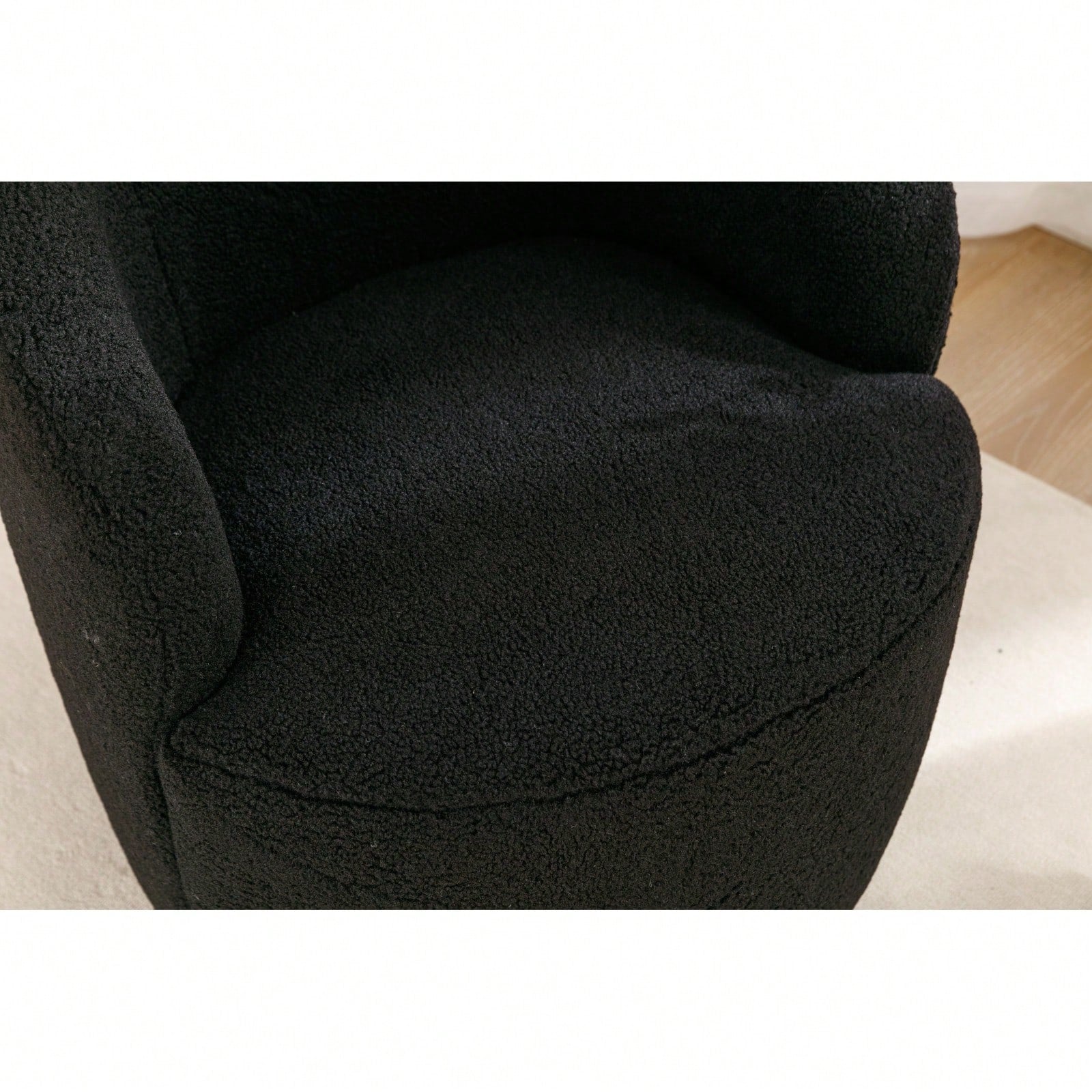 This swivel accent armchair features a cozy teddy fabric material and foam filling for ultimate comfort. The chair is supported by a sturdy wooden frame and a sleek black powder coating metal ring base. With its barrel design and upholstered finish, this chair adds a touch of modern style to any room.