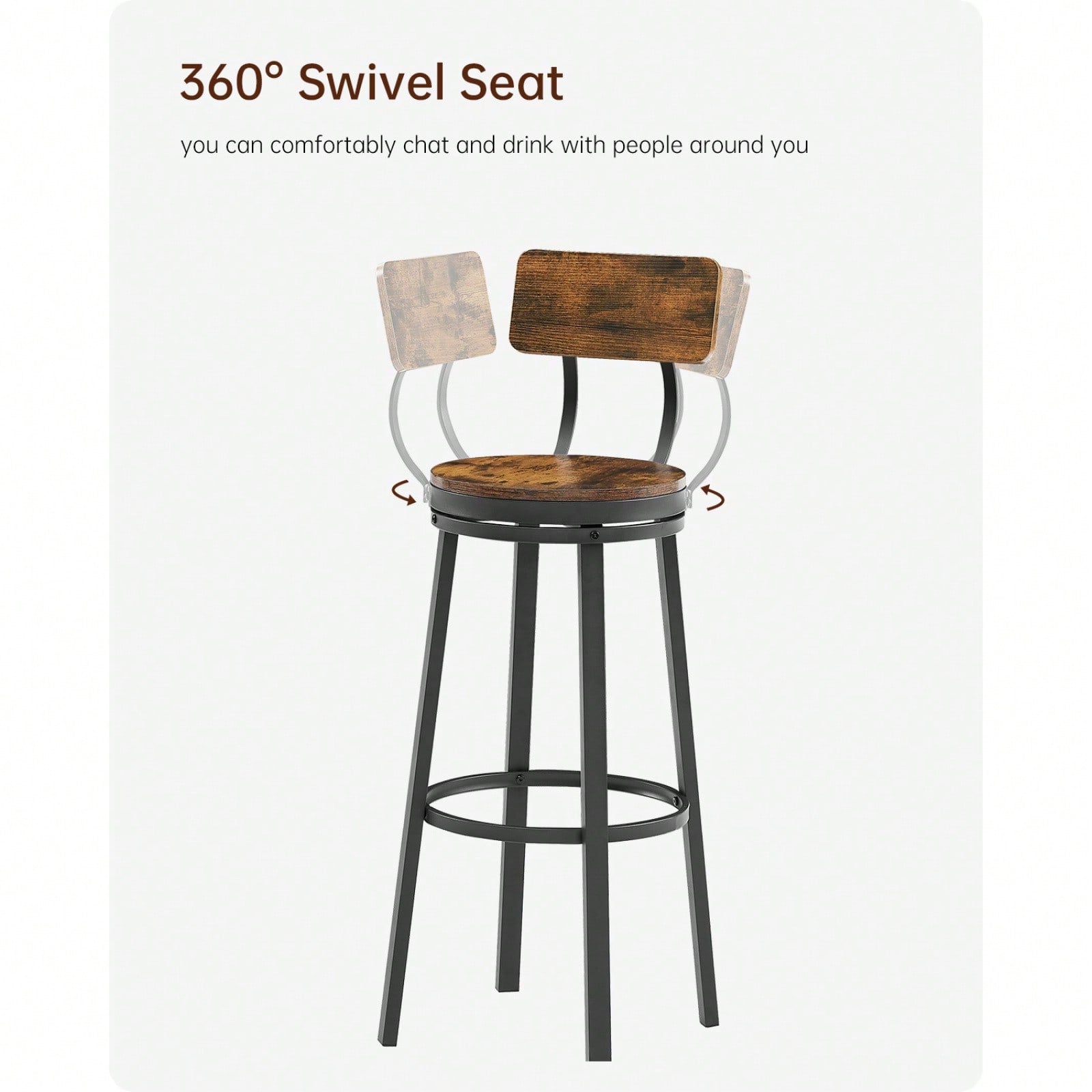 This swivel bar stool set of 2 with backrest in an industrial style is perfect for adding a touch of rustic charm to your dining room. The 360° rotation feature allows for easy movement and convenience. The ergonomically designed curved backrest provides comfort and support. The sturdy steel frame ensures stability, with a maximum static load capacity of 440 lb per stool. The minimalist design with rustic brown particleboard and black iron frames adds a stylish touch to any space.