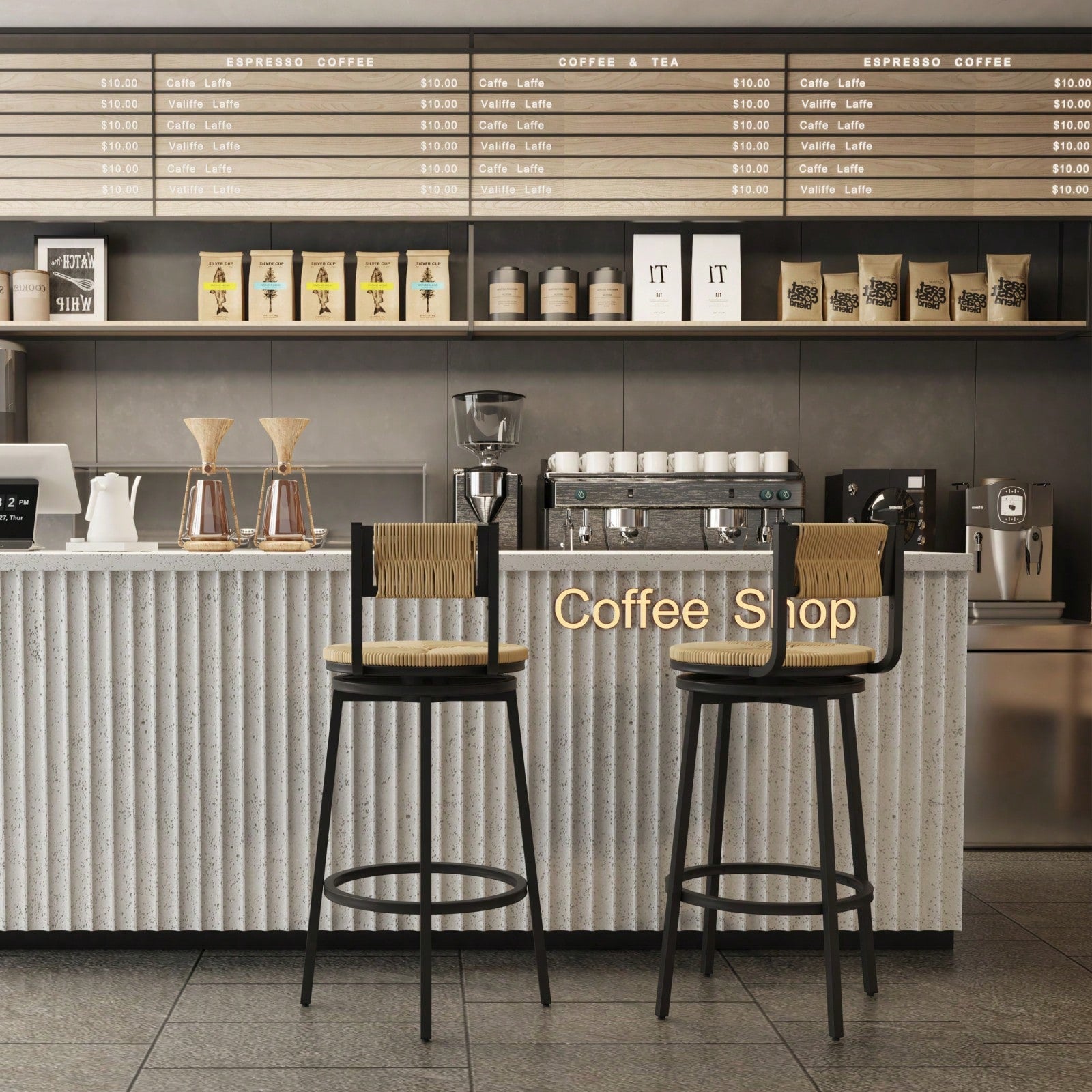 Add a touch of rustic style and comfort to your space with this set of two hand-woven bar stools. Featuring a thickened paper rope seat and backrest in a natural color, these barstools offer a breathable sitting experience for maximum comfort. The black powder-coated metal base and legs provide durability and stability, while the ergonomic design promotes better posture and relaxation during long sitting sessions. With non-slip protectors and a 360° swivel seat, these barstools are both stylish and functional additions to any dining room or kitchen island.