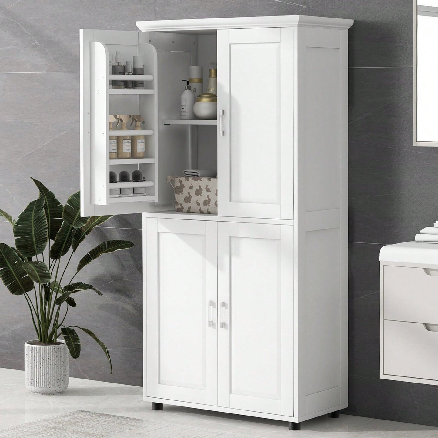 Tall Bathroom Floor Cabinet With Adjustable Shelves And 4 Doors, Freestanding Storage Organizer Unit For Bathroom Essentials, White