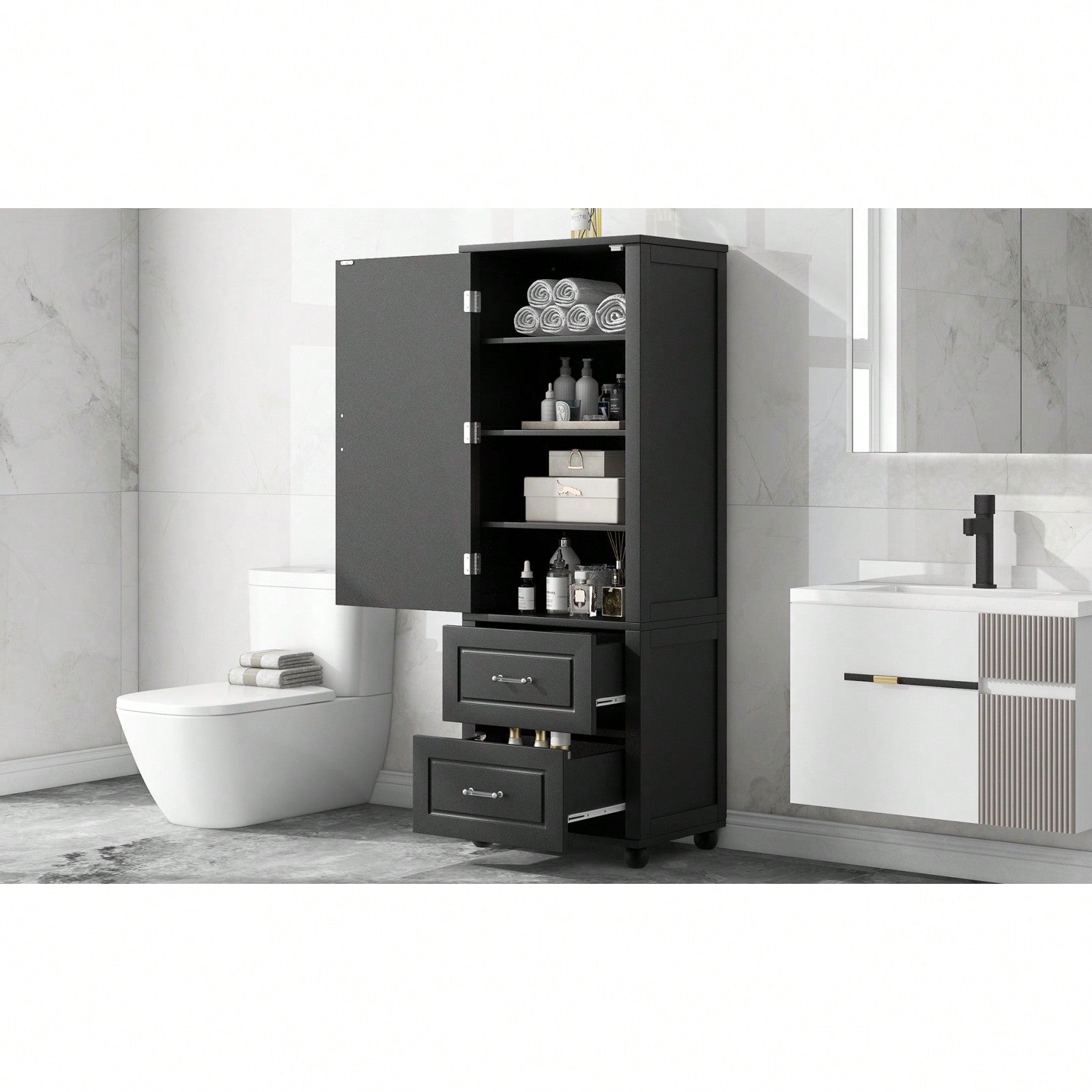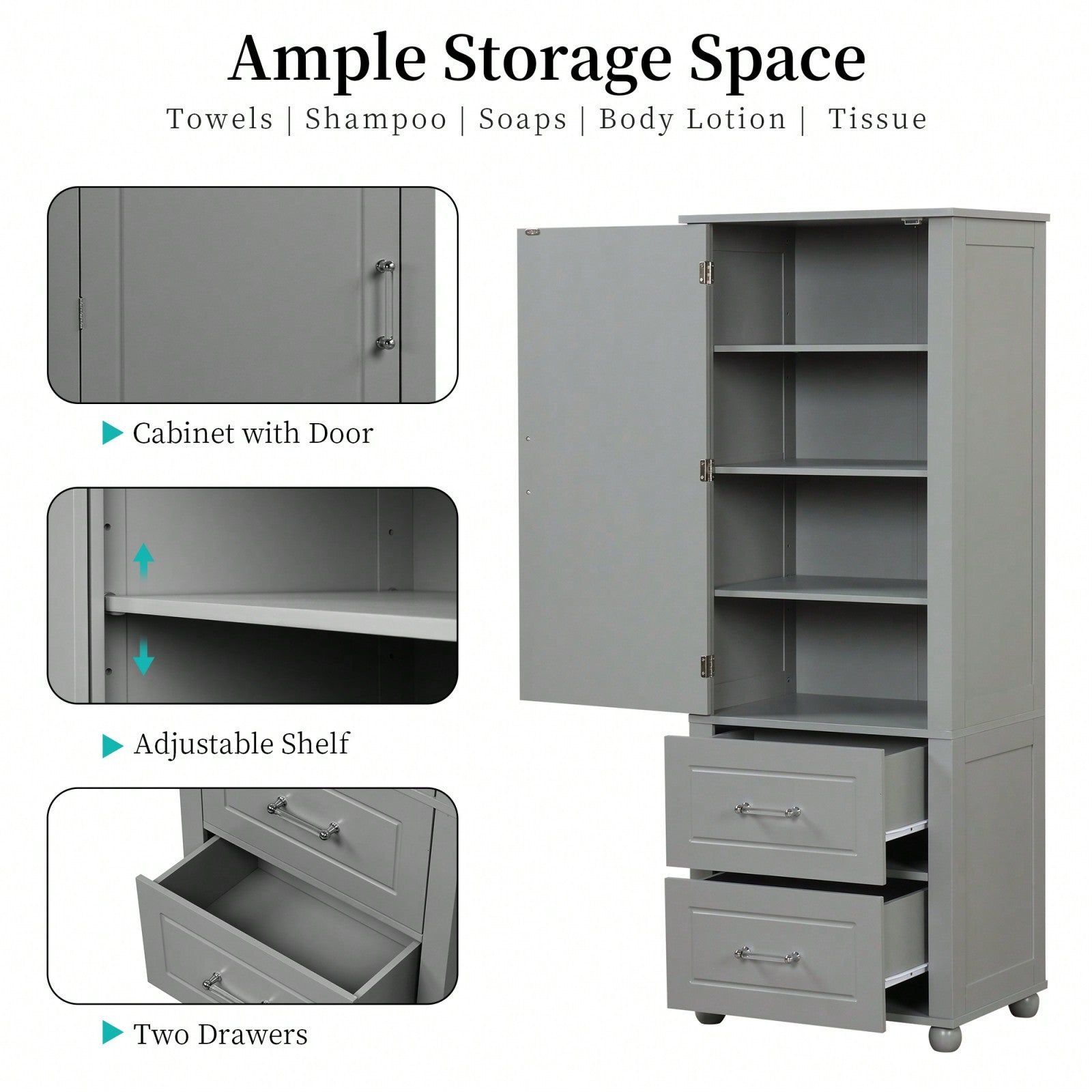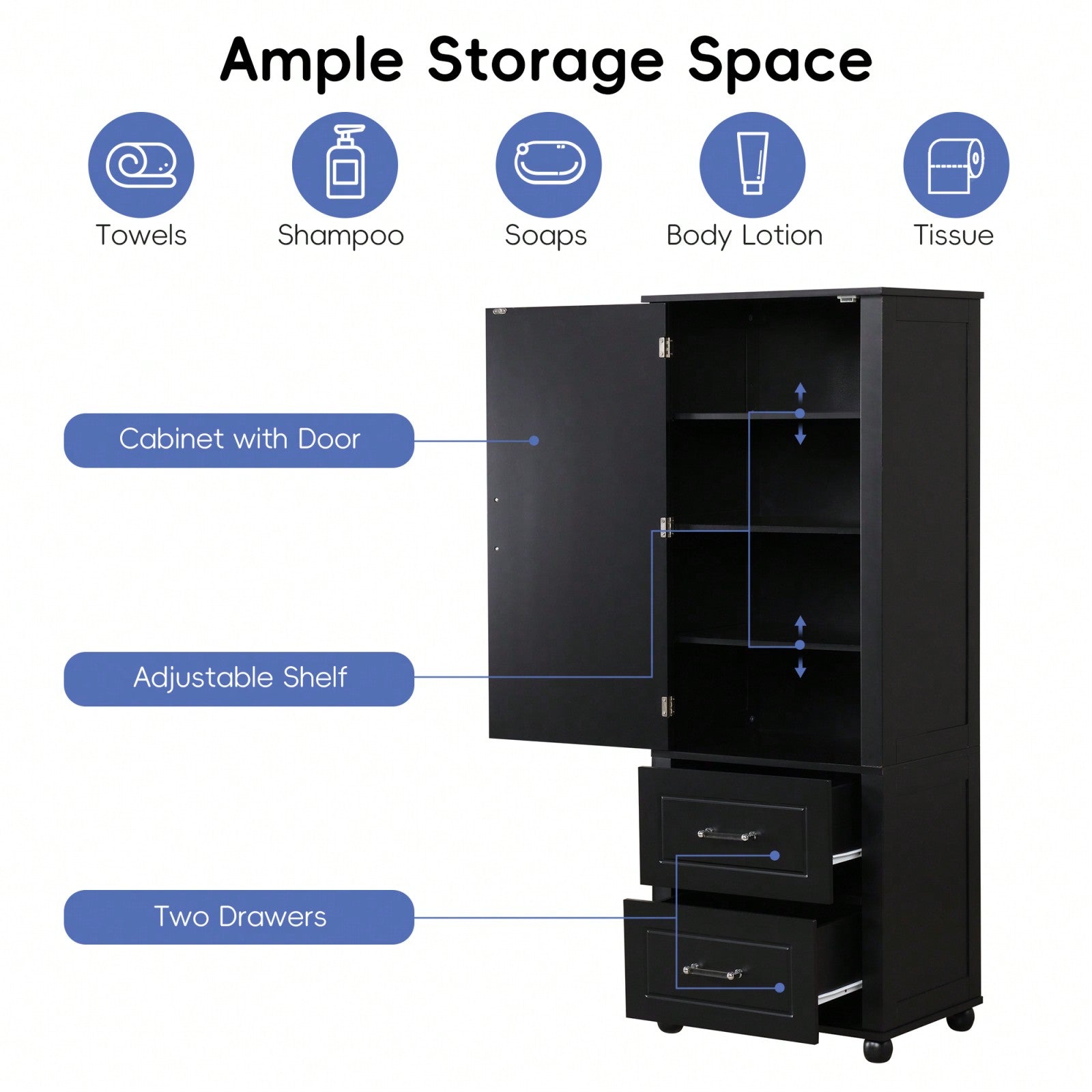 1.Maximize Bathroom Storage: Organize toiletries, linens, and more with this tall bathroom storage cabinet featuring two spacious drawers and an adjustable shelf.