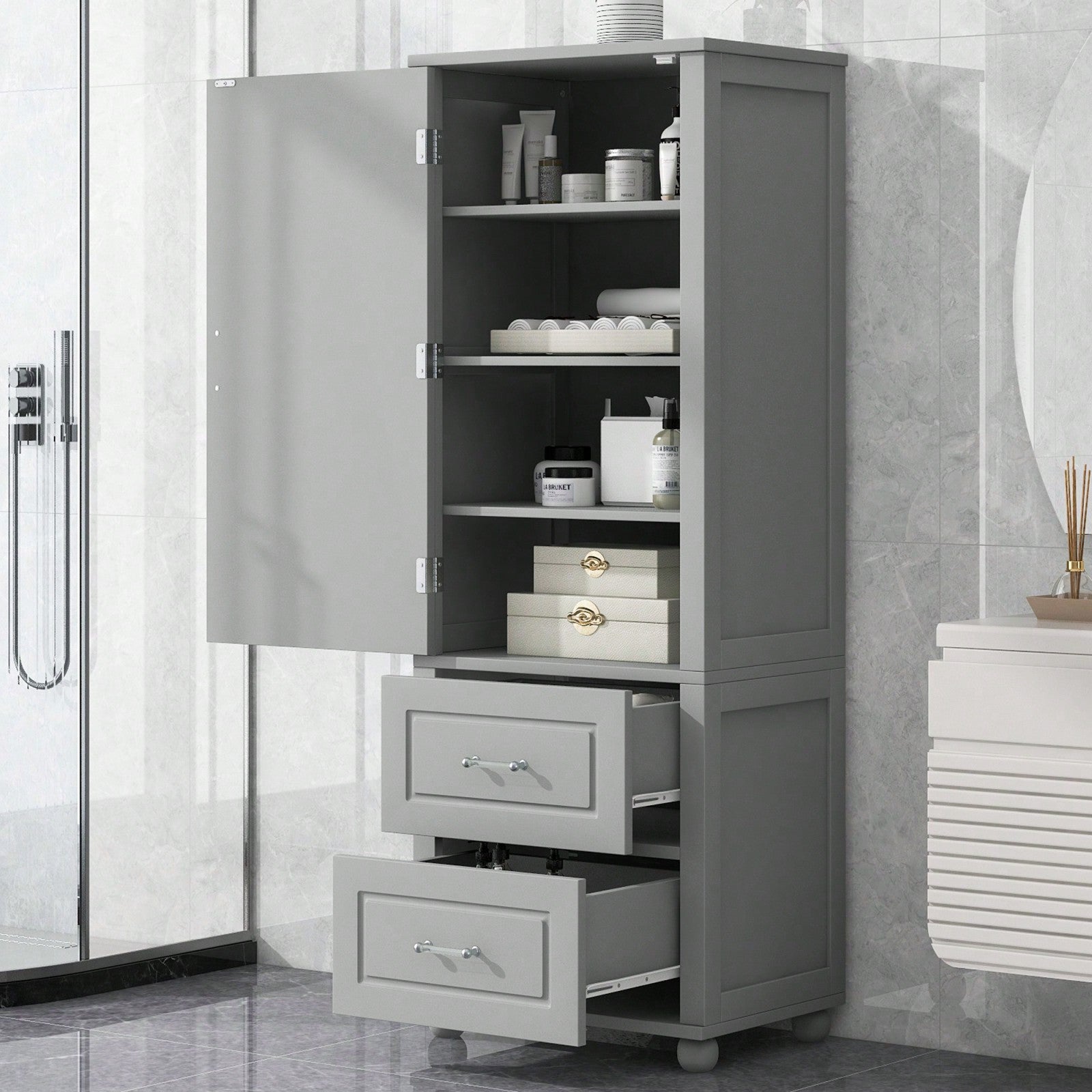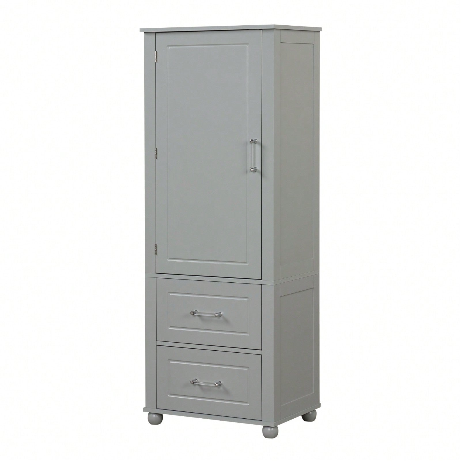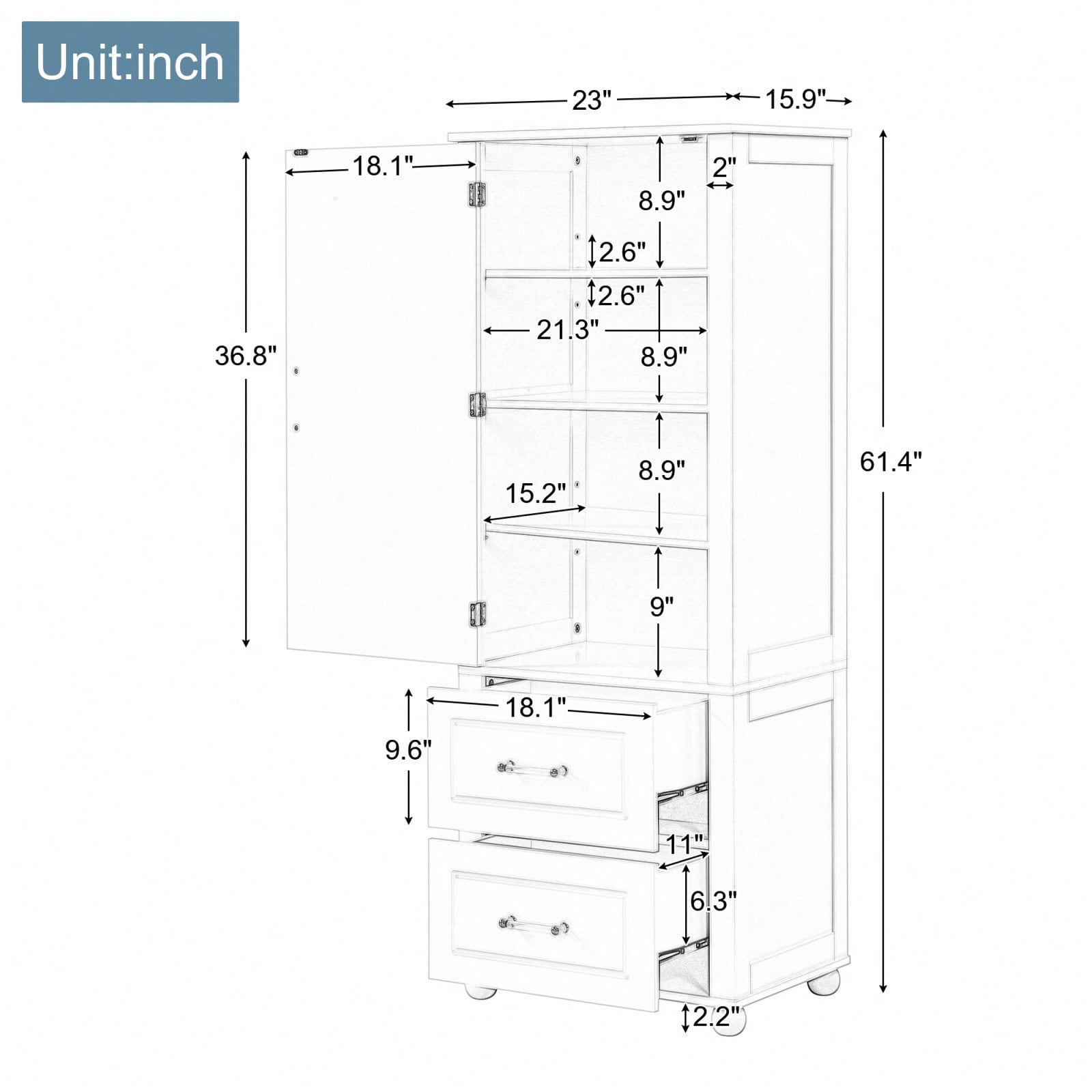1.Maximize Bathroom Storage: Organize toiletries, linens, and more with this tall bathroom storage cabinet featuring two spacious drawers and an adjustable shelf.