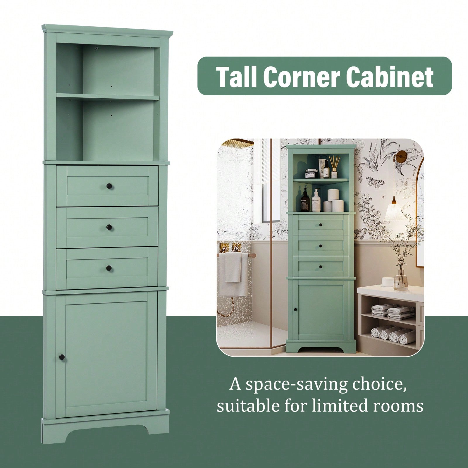 Green Tall Corner Storage Cabinet with Adjustable Shelves and Drawers for Bathroom Kitchen or Living Room