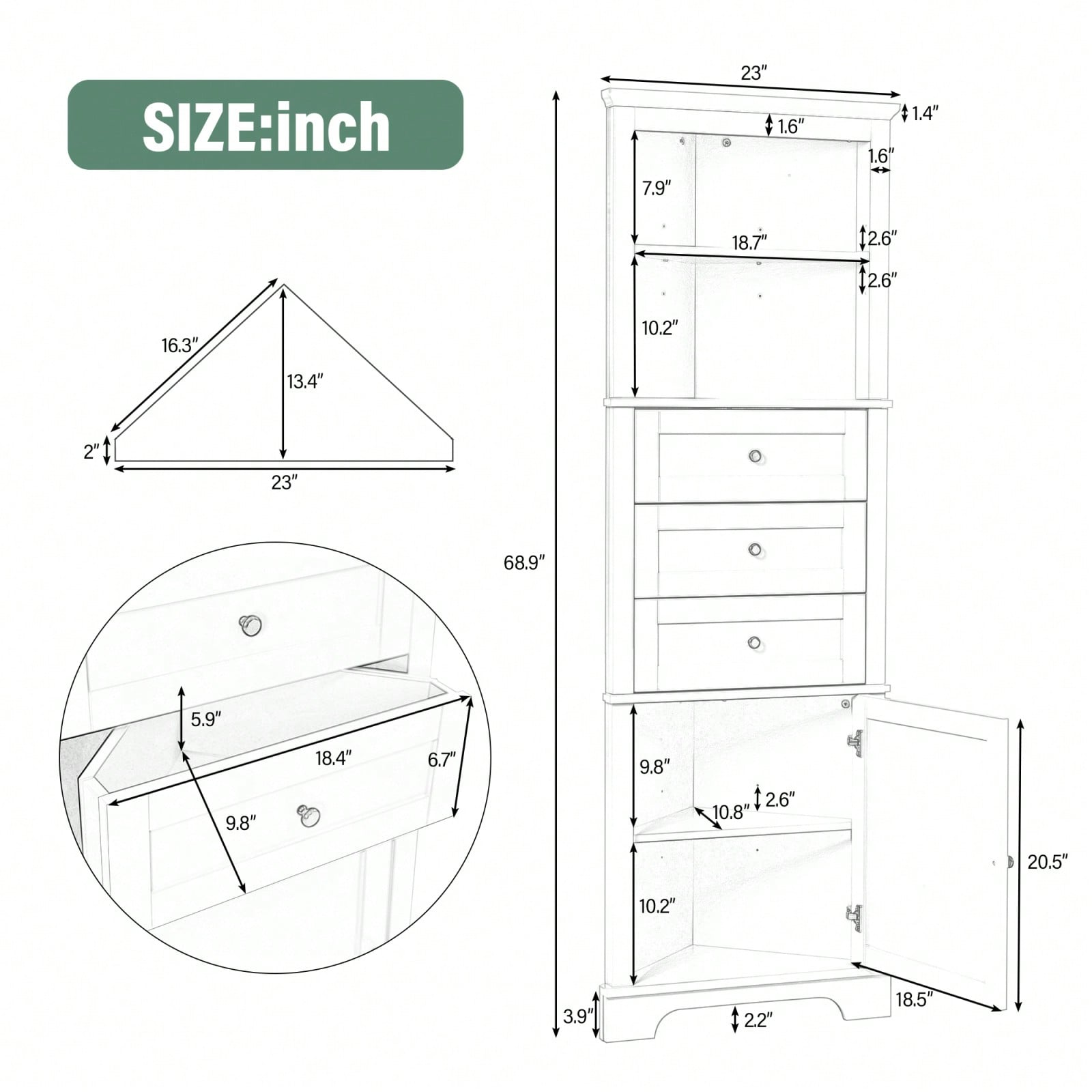 This elegant and practical corner cabinet offers a stylish and efficient storage solution for any room. Crafted from durable MDF with a smooth painted finish, it's easy to clean and complements a variety of decor styles. The cabinet features an open shelf for easy access, three drawers for discreet storage, and a lower cabinet with a door for concealing larger items. The adjustable shelf allows for versatile storage options, accommodating items of different sizes. It's ideal for maximizing space in bathrooms, kitchens, living rooms, or any area where efficient storage is desired.