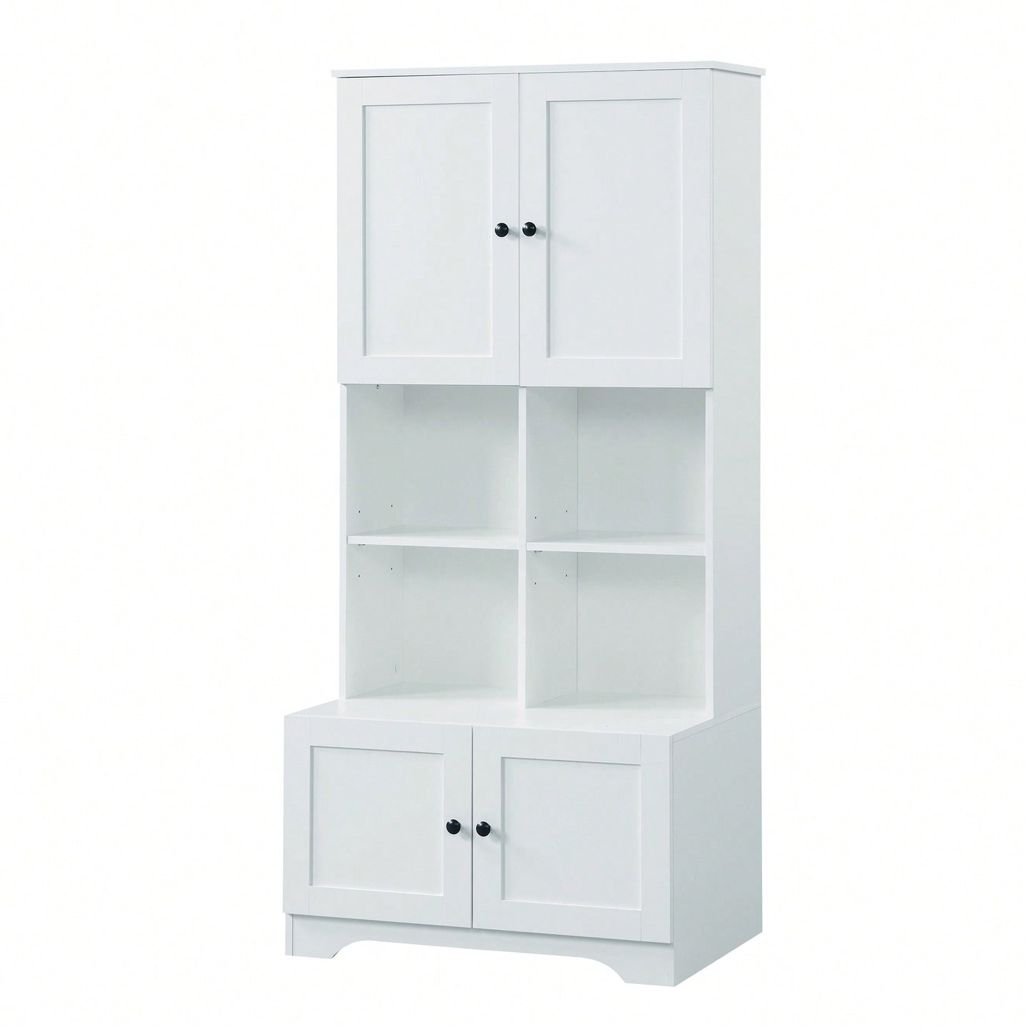 Tall White Freestanding Bathroom Storage Cabinet With 4 Doors Adjustable Shelves And Open Multi-Layer Design