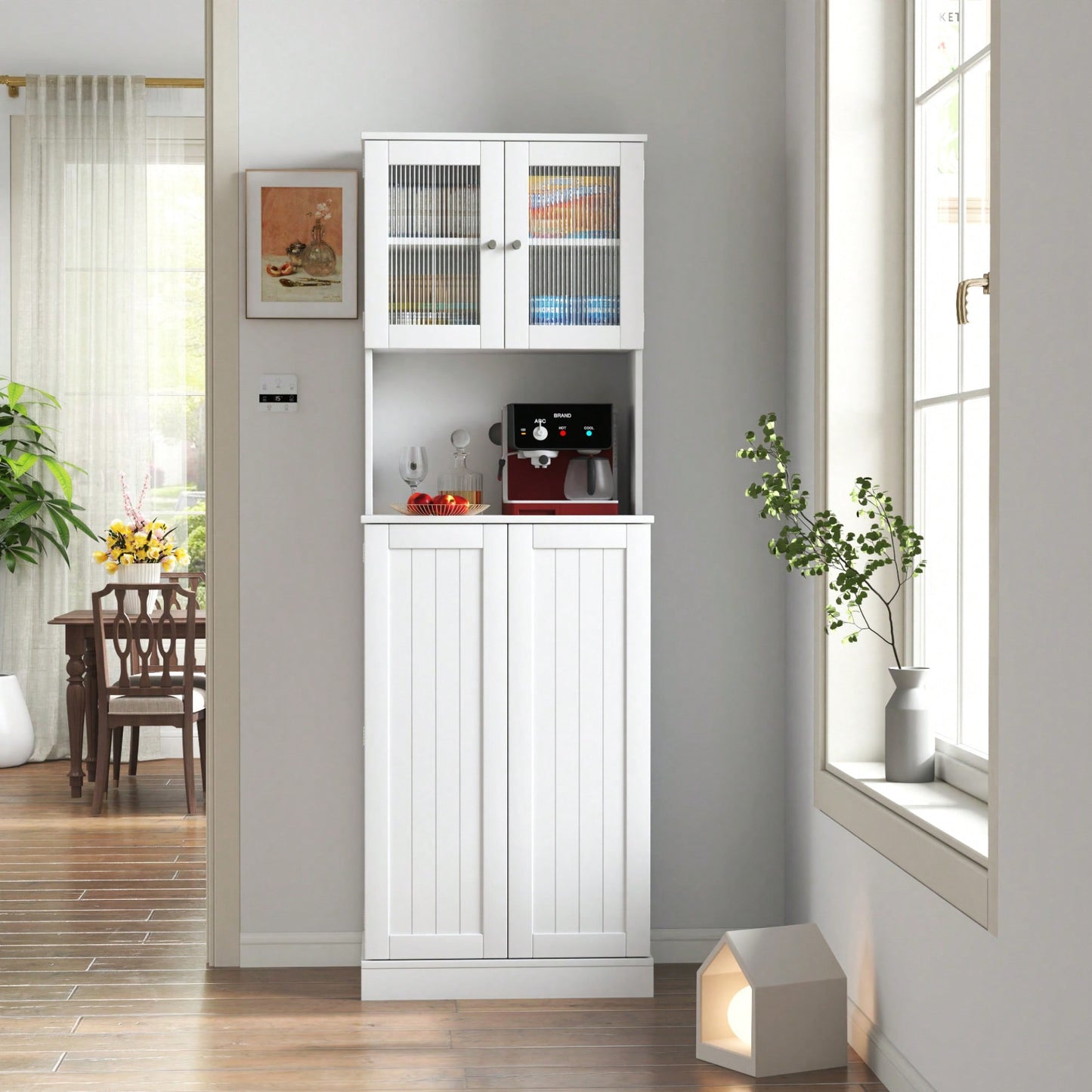 Tall White Pantry Cabinet With Adjustable Shelves And Microwave Stand For Kitchen And Dining Room Storage