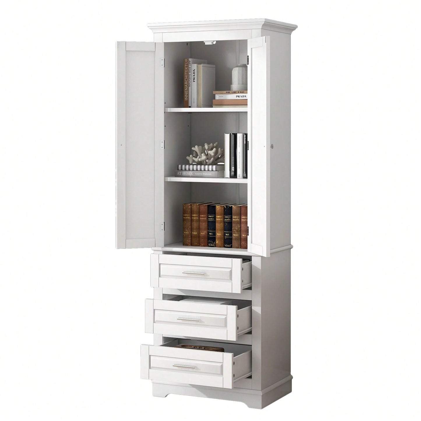 This tall storage cabinet is designed for versatility and organization. With a sleek white finish, it fits seamlessly into any room, whether in the bathroom, office, or kitchen. The upper cabinet features three tiers for displaying decorations or storing everyday items, while three spacious drawers below provide ample space for miscellaneous items, helping to keep your area tidy. The adjustable shelf allows for customization based on your storage needs, accommodating items of various sizes. Constructed from high-quality MDF with a smooth, waterproof surface, this cabinet is easy to clean and maintain. The included anti-tipping device ensures safety, making it a practical choice for homes with children. Assembly is required, but the product comes with pre-drilled holes and a detailed instruction manual for easy setup.