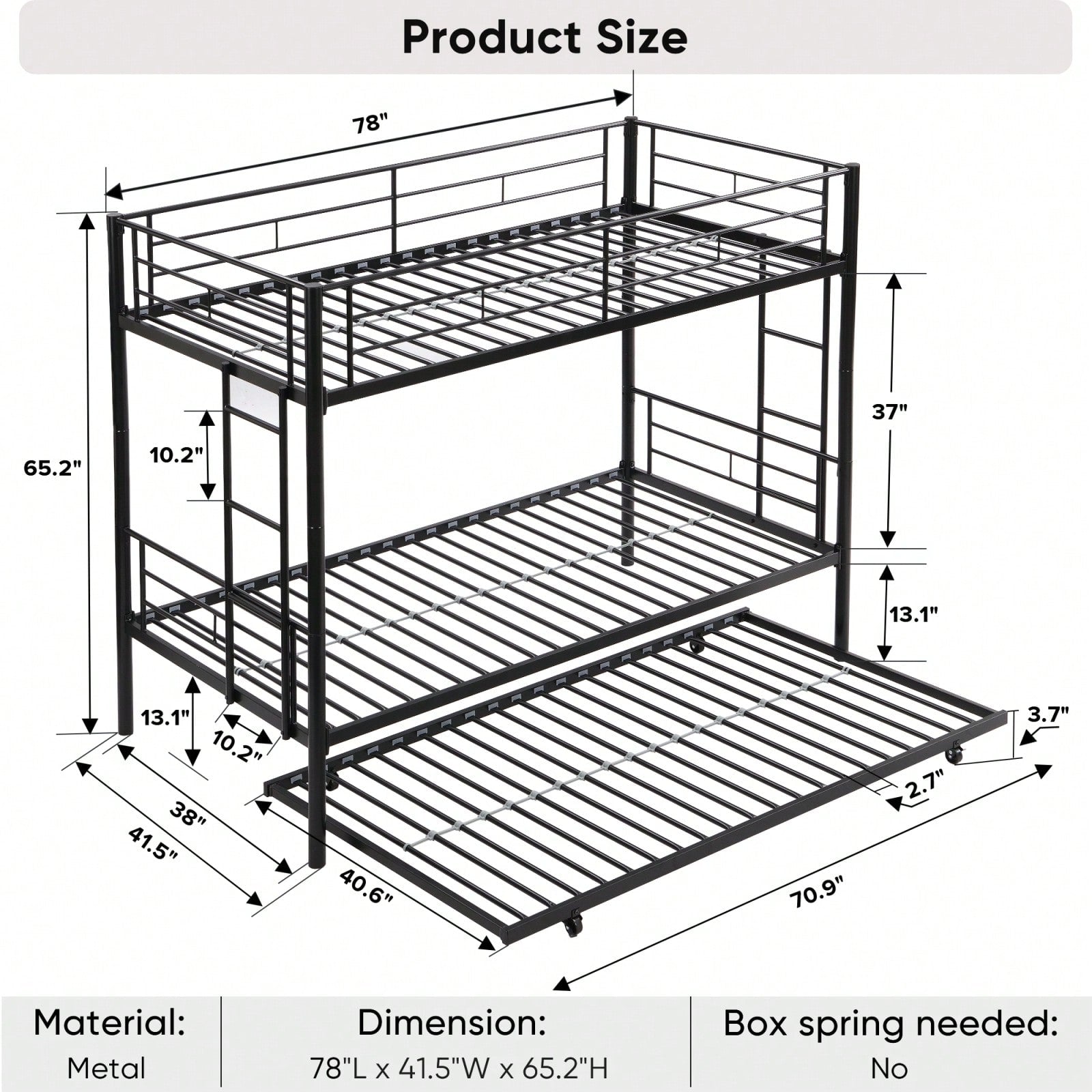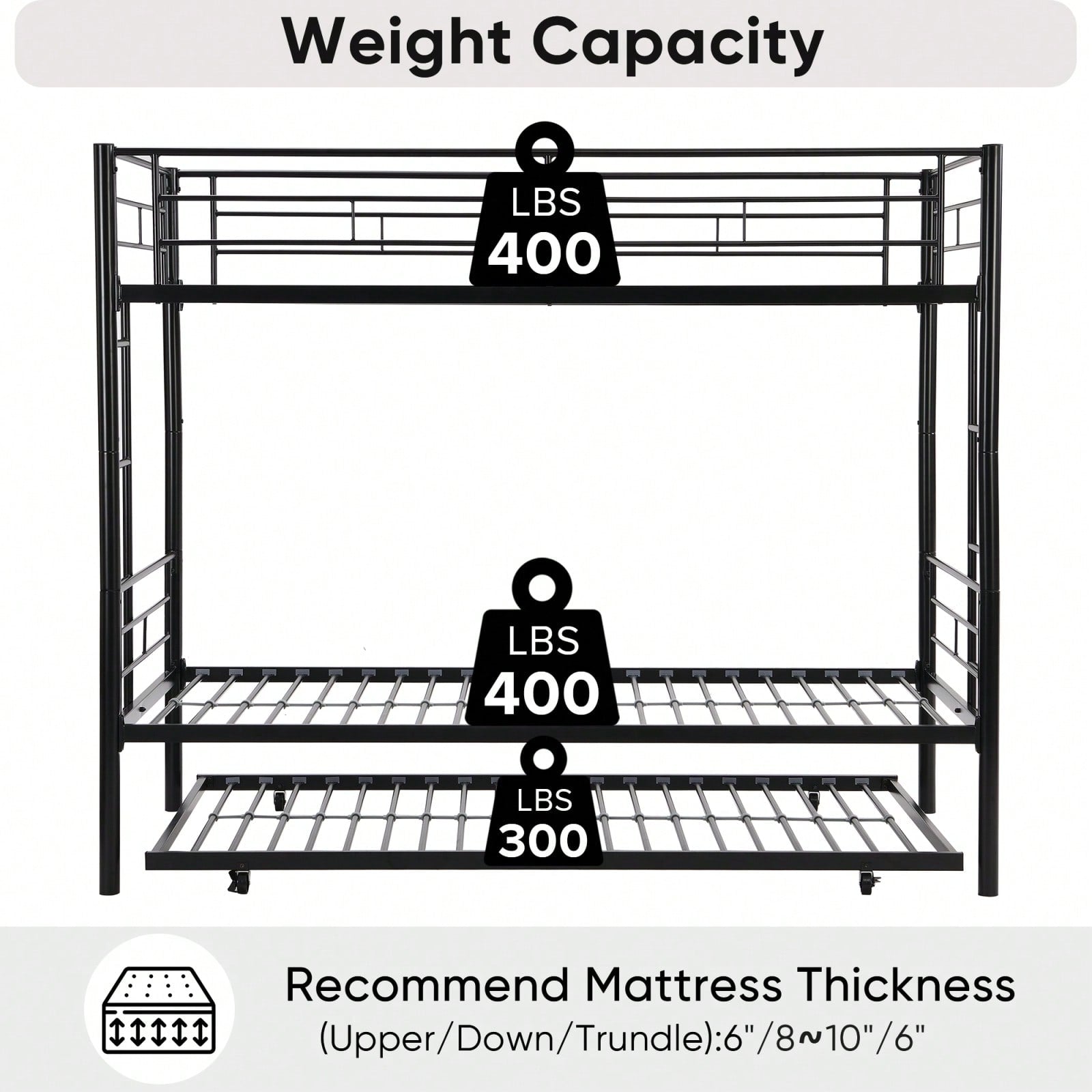 Space-Saving Metal Twin Bunk Bed Frame with Trundle for Kids and Adults Easy Assembly Sturdy Design with Guard Rails and Ladders Black