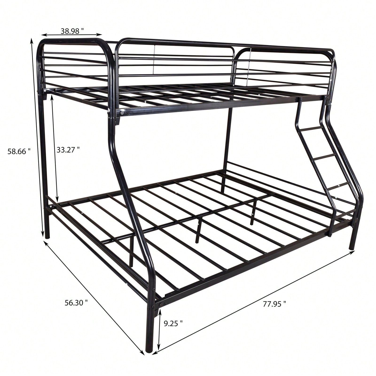 This heavy-duty metal bunk bed offers a secure and stylish sleeping solution, featuring a sturdy frame with reinforced strength for exceptional stability and durability. Designed to accommodate both twin and full-size mattresses, its integrated platform eliminates the need for box springs while providing ample under-bed storage. The upper bunk is equipped with a heightened guardrail for enhanced safety, while an inclined ladder ensures easy access. The bed's sleek black finish with a classic headboard and footboard complements various bedroom decors.