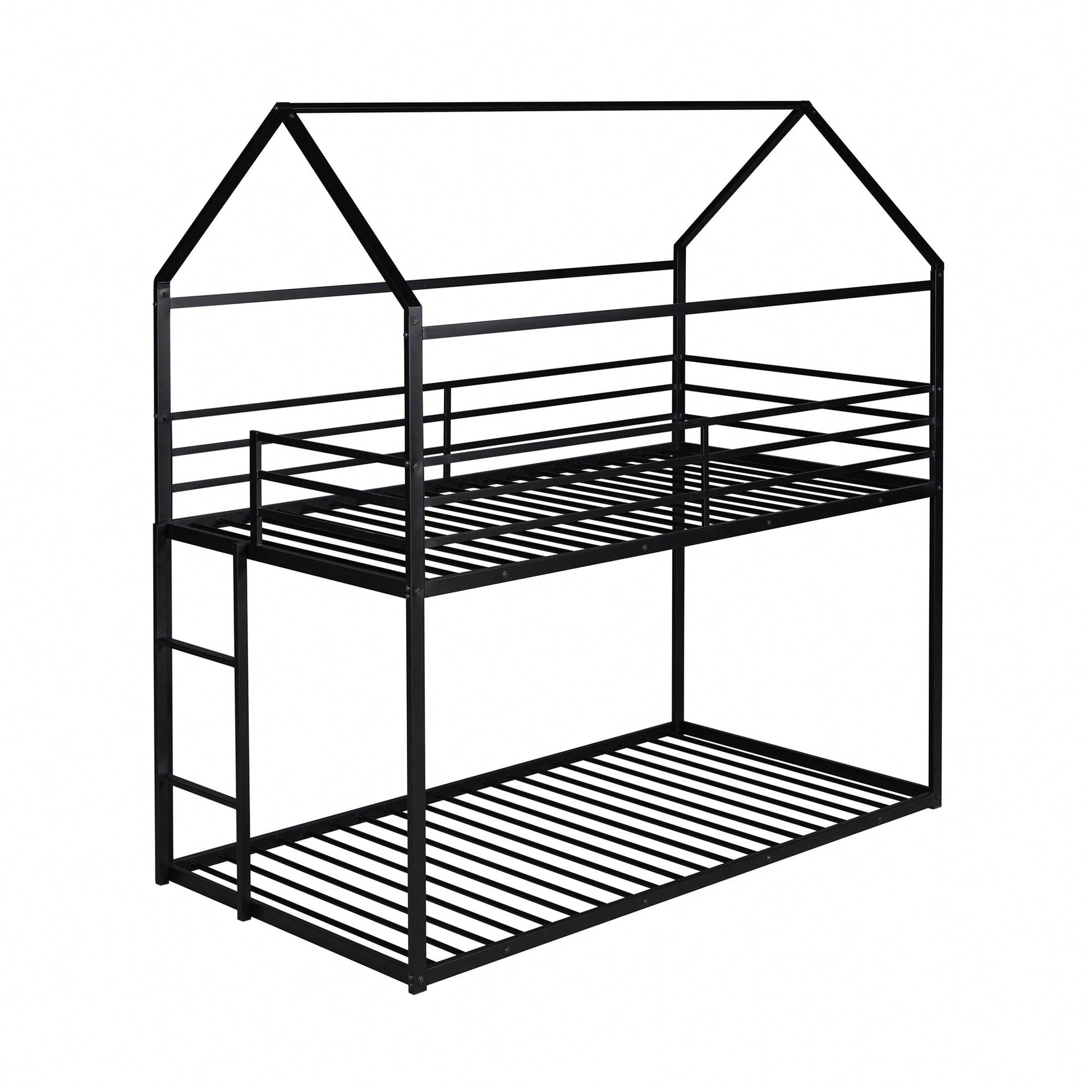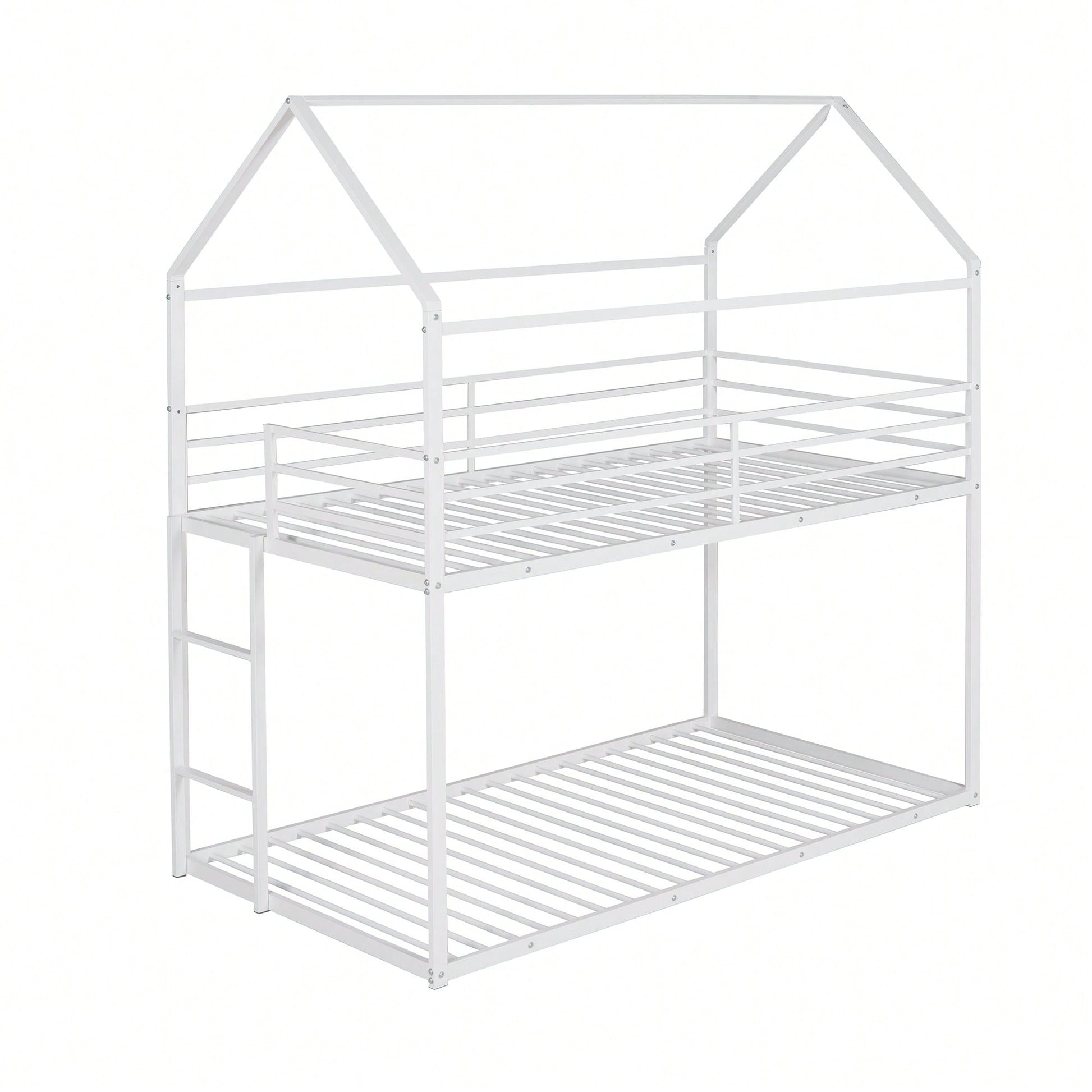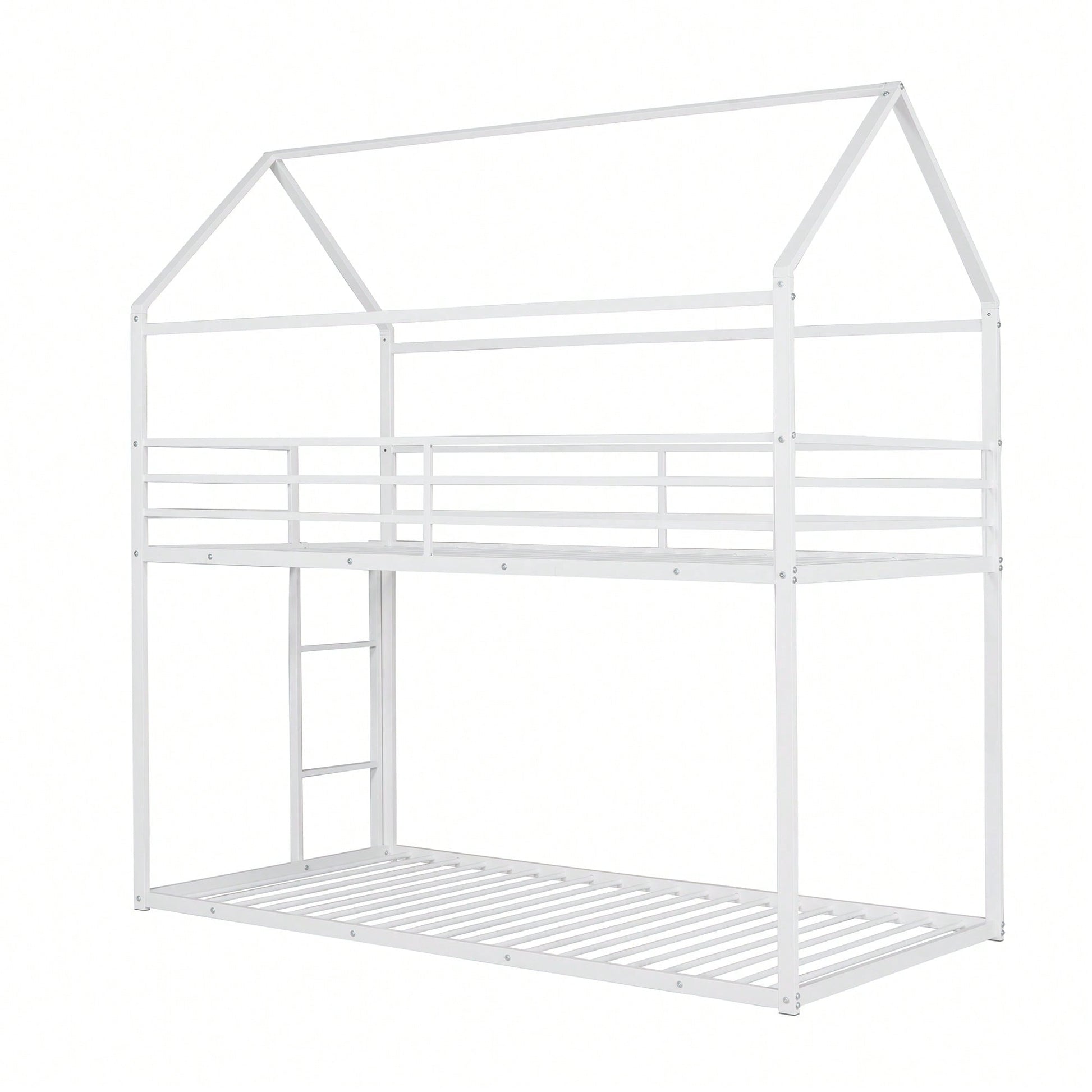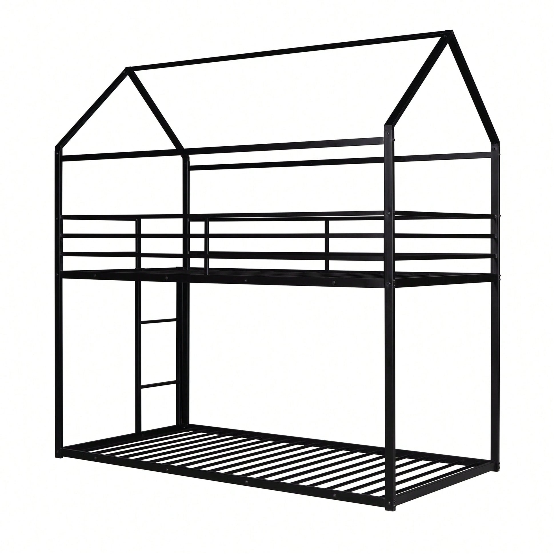 1. Key Features: - Practical and fun house-style design - Suitable for various occasions like living rooms and children's rooms - Sturdy metal construction with high bearing capacity - Child-safe features including guardrails and a built-in ladder - Easy assembly with all parts and tools included 2. Product Description: This twin over twin bunk bed combines practicality with a playful house design, making bedtime enjoyable for kids. Ideal for multiple occupants, it fits perfectly in living rooms, game rooms, or children's rooms. The sturdy metal frame ensures durability and safety, with a load-bearing capacity of 350 lbs for the lower bunk and 250 lbs for the upper bunk. The built-in ladder and full-length guardrails enhance safety, while the smooth finish adds to the overall appeal. Assembly is straightforward, as all necessary tools and instructions are provided. Specifications: - Size: 78.11"L x 40.15"W x 81.72"H - Upper bunk weight capacity: 250 lbs - Lower bunk weight capacity: 350 lbs - Number of metal bed slats: 20