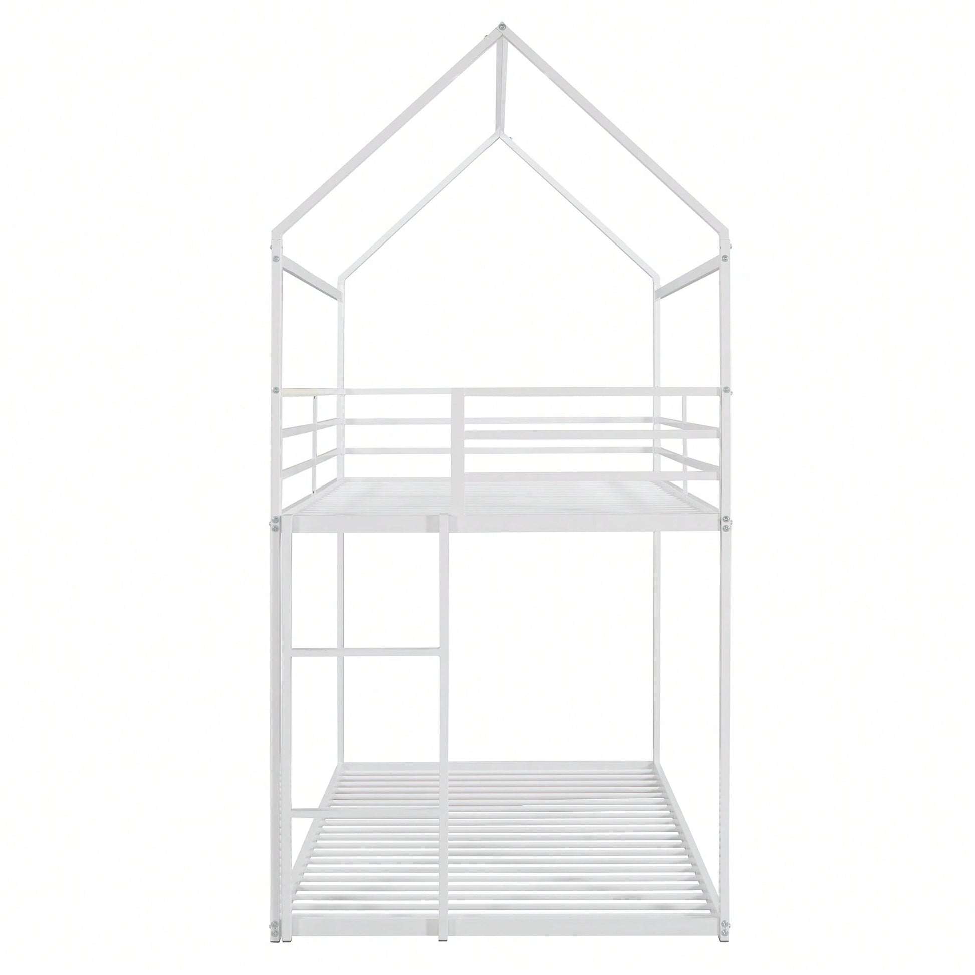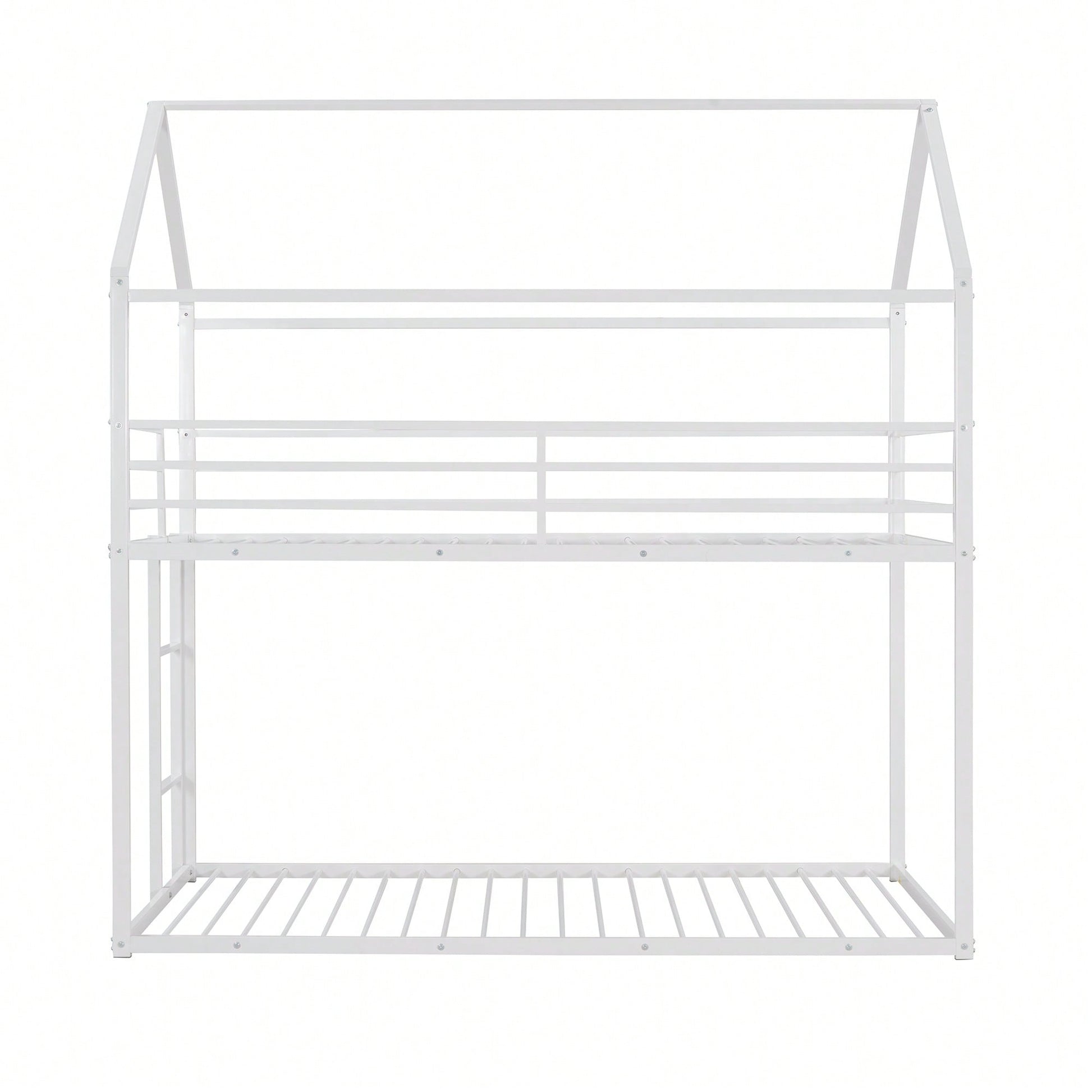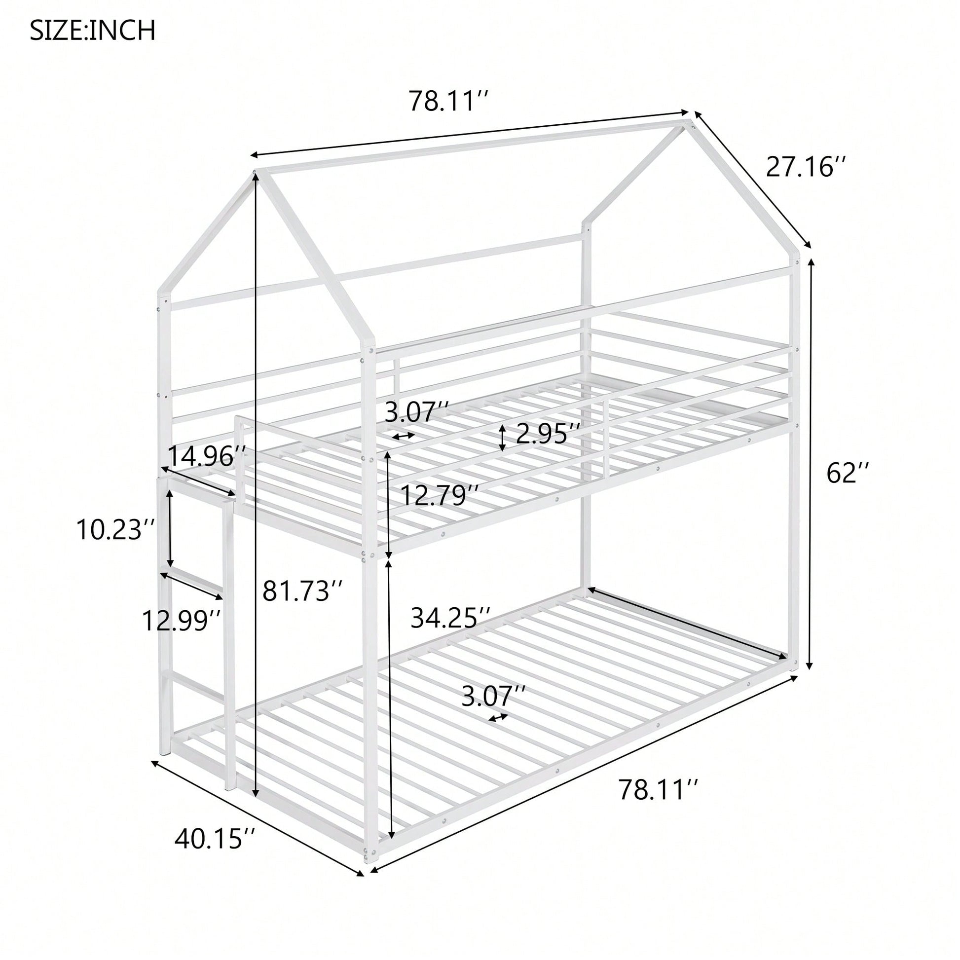1. Key Features: - Practical and fun house-style design - Suitable for various occasions like living rooms and children's rooms - Sturdy metal construction with high bearing capacity - Child-safe features including guardrails and a built-in ladder - Easy assembly with all parts and tools included 2. Product Description: This twin over twin bunk bed combines practicality with a playful house design, making bedtime enjoyable for kids. Ideal for multiple occupants, it fits perfectly in living rooms, game rooms, or children's rooms. The sturdy metal frame ensures durability and safety, with a load-bearing capacity of 350 lbs for the lower bunk and 250 lbs for the upper bunk. The built-in ladder and full-length guardrails enhance safety, while the smooth finish adds to the overall appeal. Assembly is straightforward, as all necessary tools and instructions are provided. Specifications: - Size: 78.11"L x 40.15"W x 81.72"H - Upper bunk weight capacity: 250 lbs - Lower bunk weight capacity: 350 lbs - Number of metal bed slats: 20