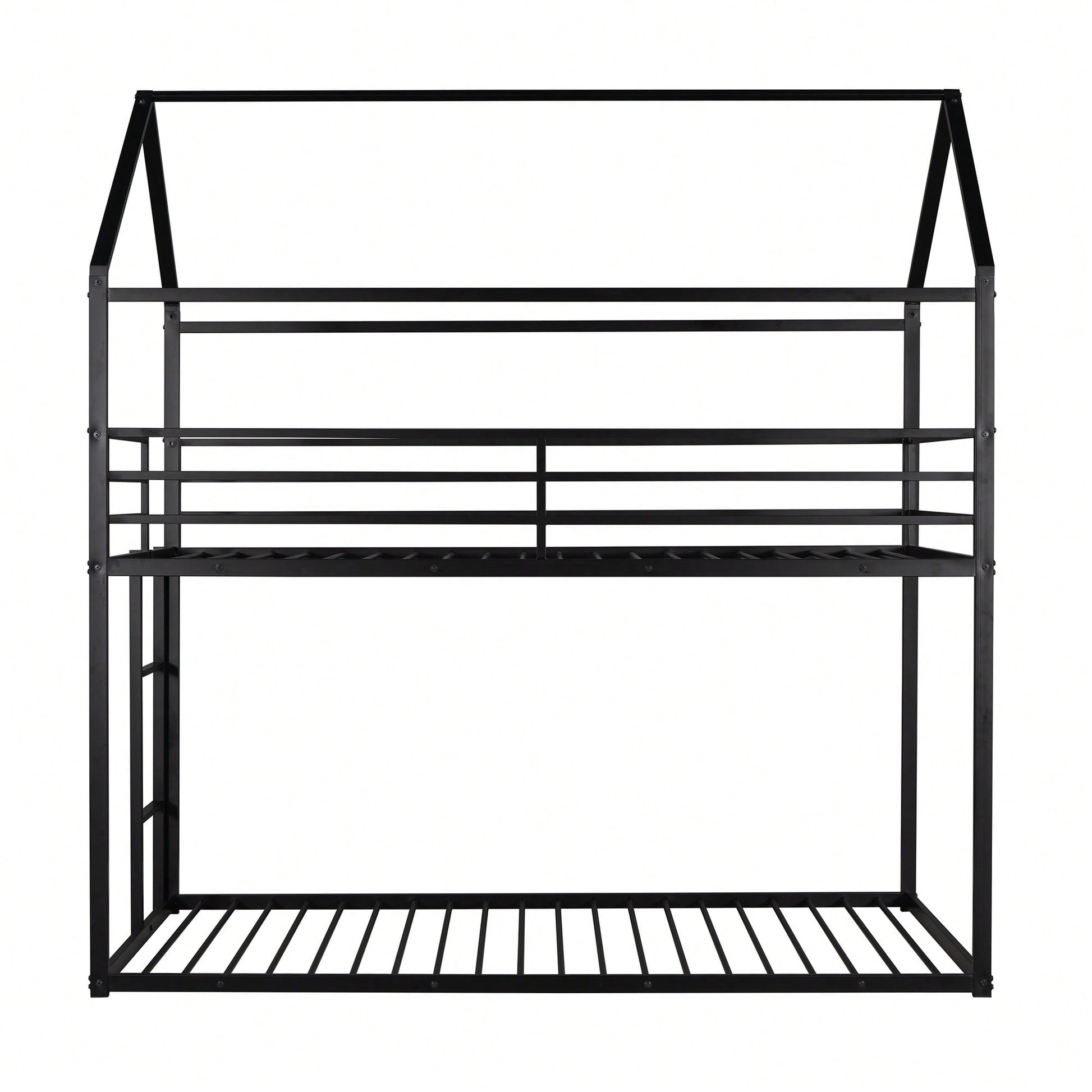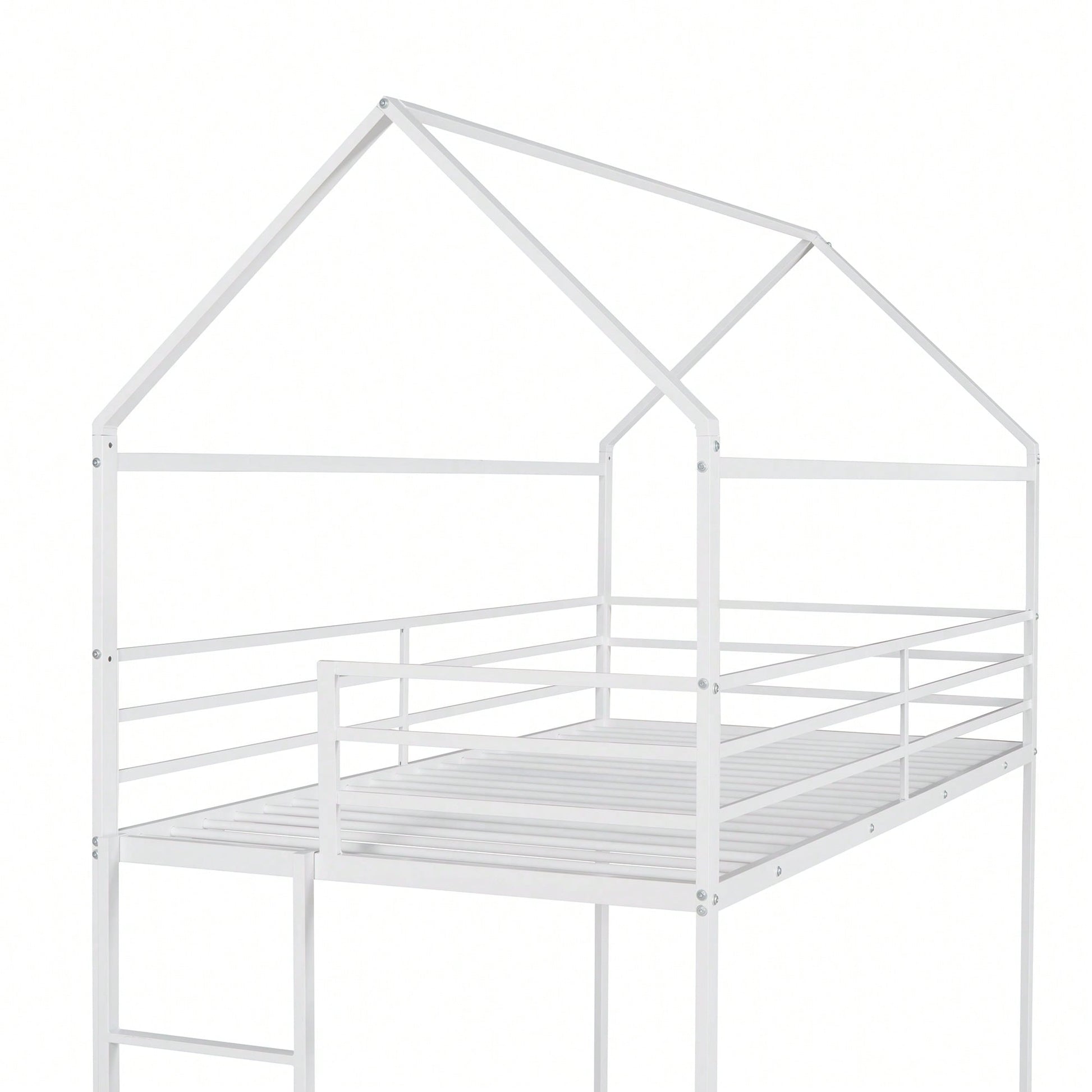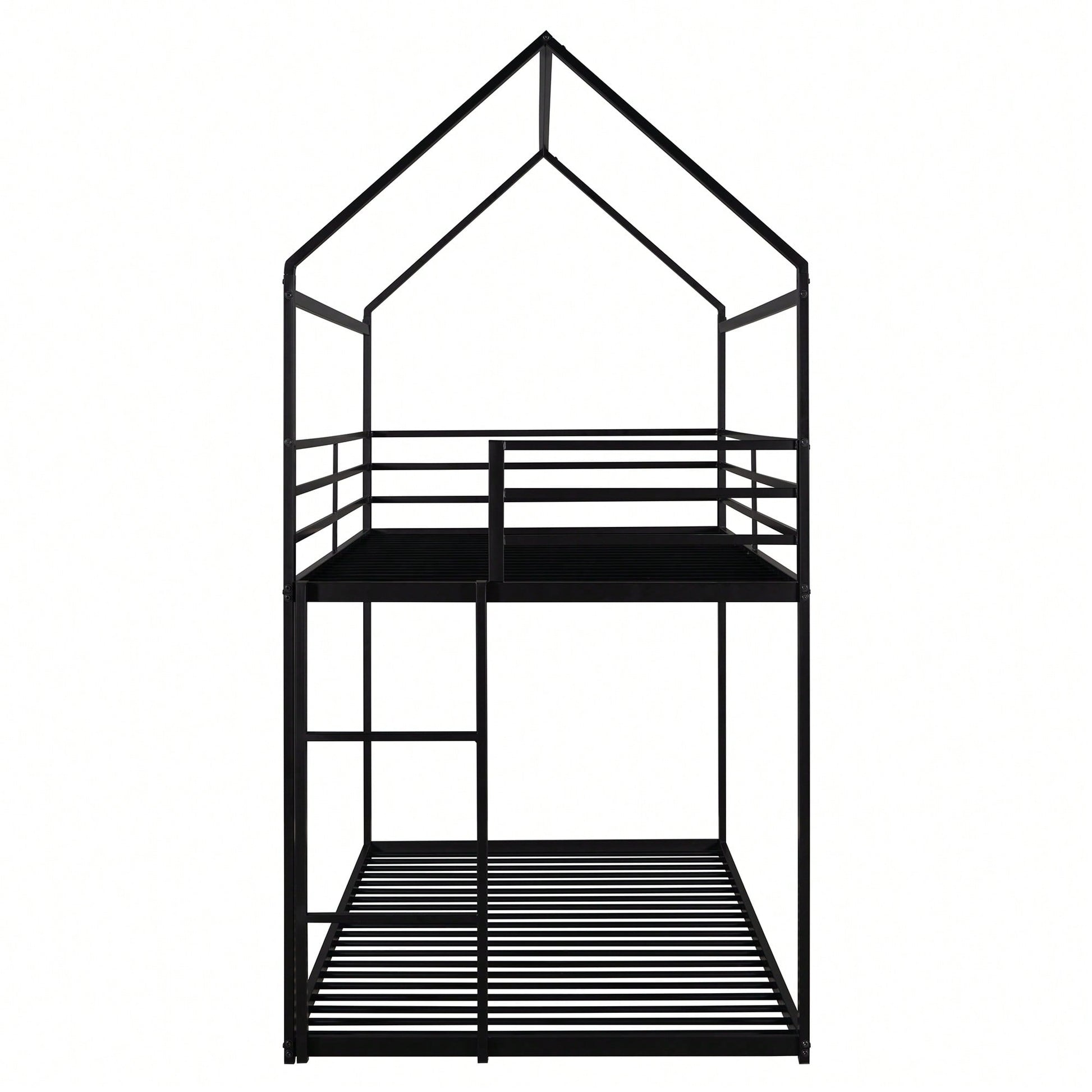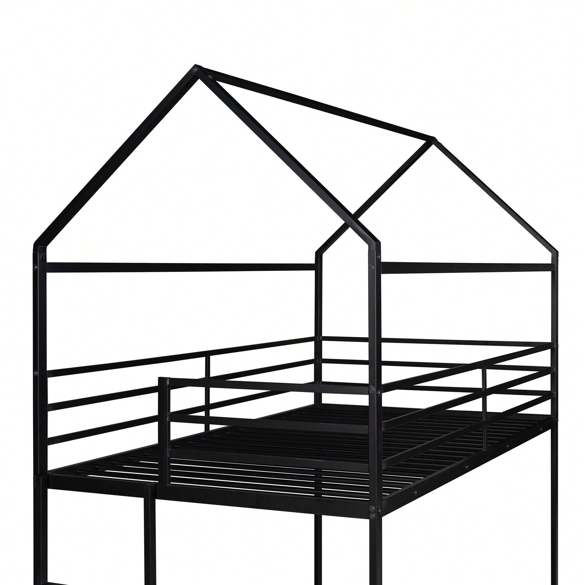 1. Key Features: - Practical and fun house-style design - Suitable for various occasions like living rooms and children's rooms - Sturdy metal construction with high bearing capacity - Child-safe features including guardrails and a built-in ladder - Easy assembly with all parts and tools included 2. Product Description: This twin over twin bunk bed combines practicality with a playful house design, making bedtime enjoyable for kids. Ideal for multiple occupants, it fits perfectly in living rooms, game rooms, or children's rooms. The sturdy metal frame ensures durability and safety, with a load-bearing capacity of 350 lbs for the lower bunk and 250 lbs for the upper bunk. The built-in ladder and full-length guardrails enhance safety, while the smooth finish adds to the overall appeal. Assembly is straightforward, as all necessary tools and instructions are provided. Specifications: - Size: 78.11"L x 40.15"W x 81.72"H - Upper bunk weight capacity: 250 lbs - Lower bunk weight capacity: 350 lbs - Number of metal bed slats: 20