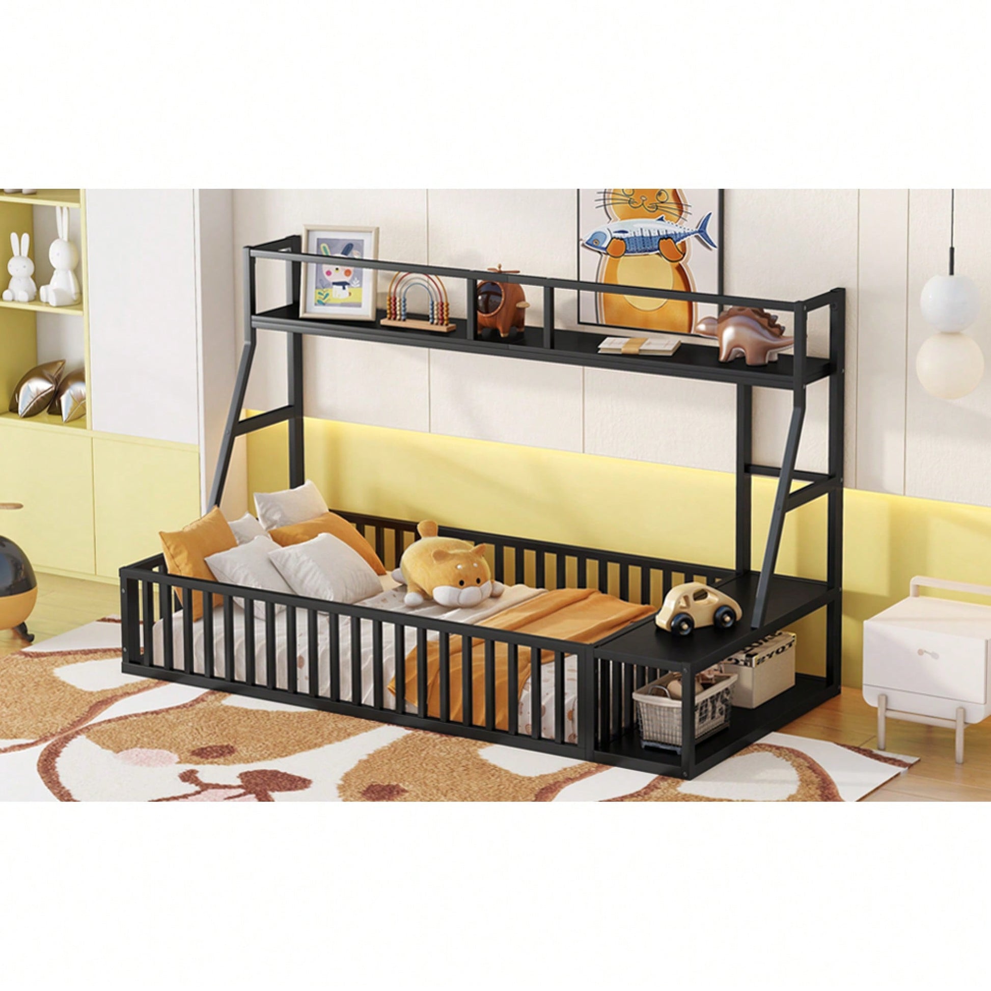 1. Features - Twin size floor bed with safety fence - Open-row design for versatile use as a bed or play space - Sturdy metal frame for stability and safety - Low height for easy access and reduced fall risk - Includes storage table and shelves for organization 2. Product Description This twin size floor bed with a safety fence is an ideal gift for children, designed to foster creativity and independence. The open-row design allows for multiple uses, such as a bed, play area, or reading nook. Constructed with a thickened metal frame, this bed offers enhanced stability and security, making it suitable for active play without wobbling. The low profile ensures easy access for kids, while the added headboard and footboard provide safety during sleep. Certified by the Children's Product Certificate (CPC), this floor bed is a reliable choice for parents. Additionally, it features a convenient storage table and shelves, perfect for organizing toys, books, and clothes. Assembly is straightforward with detailed instructions and numbered parts included. Specifications: - Bed Size: Twin - Material: Metal - Safety Certification: Children's Product Certificate (CPC) - Includes: Storage table and shelves