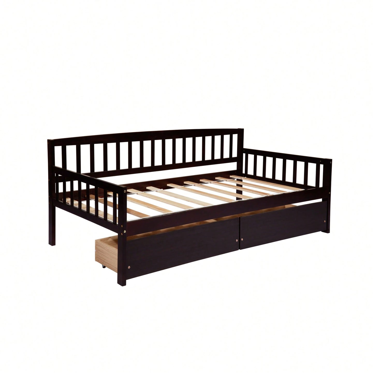 This twin-size pine wood daybed features two pull-out storage drawers underneath, providing ample space for clothes, pillows, toys, and other accessories, helping to keep your room organized. Its adaptable design makes it a perfect addition to any area of the house, functioning as a stylish sofa during the day and a comfortable bed at night. The bed is constructed from solid pine wood, ensuring lasting sturdiness and stability for a supportive experience. The minimalistic design allows it to blend seamlessly with various interior styles, and it comes in multiple classic colors to suit your decor. Assembly is straightforward, with all necessary hardware and instructions included for your convenience.
