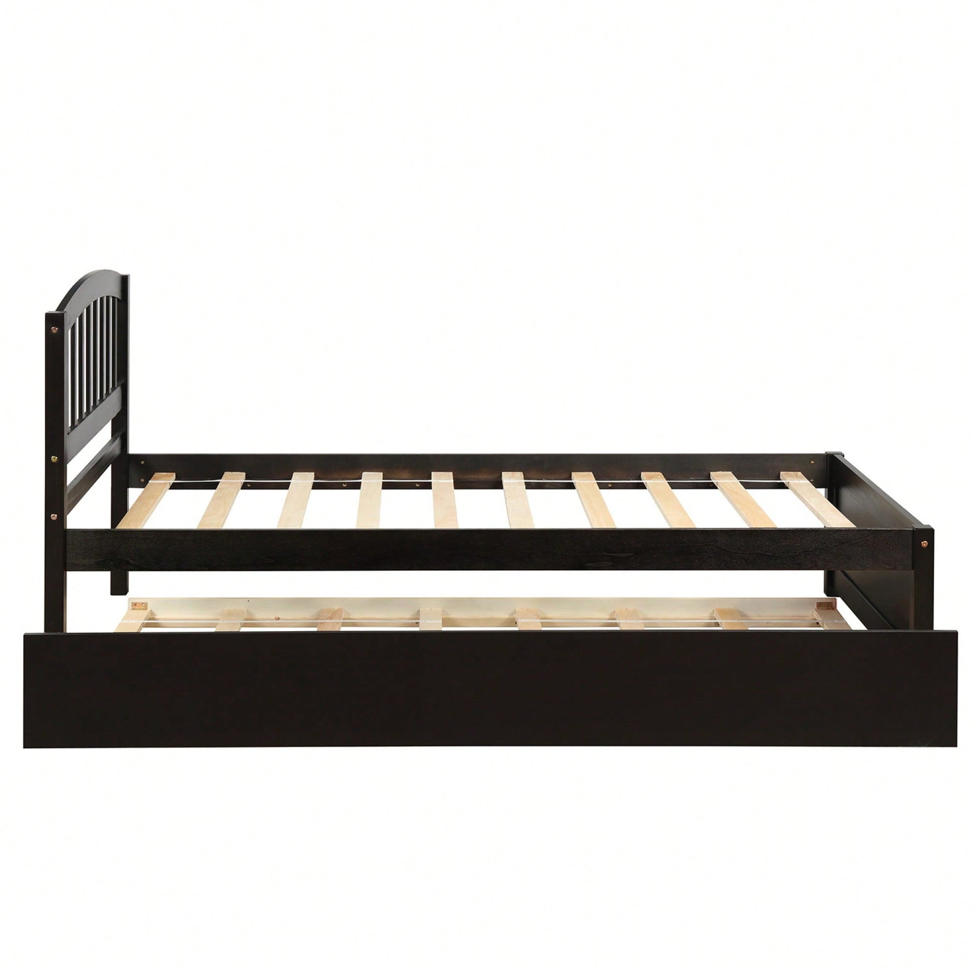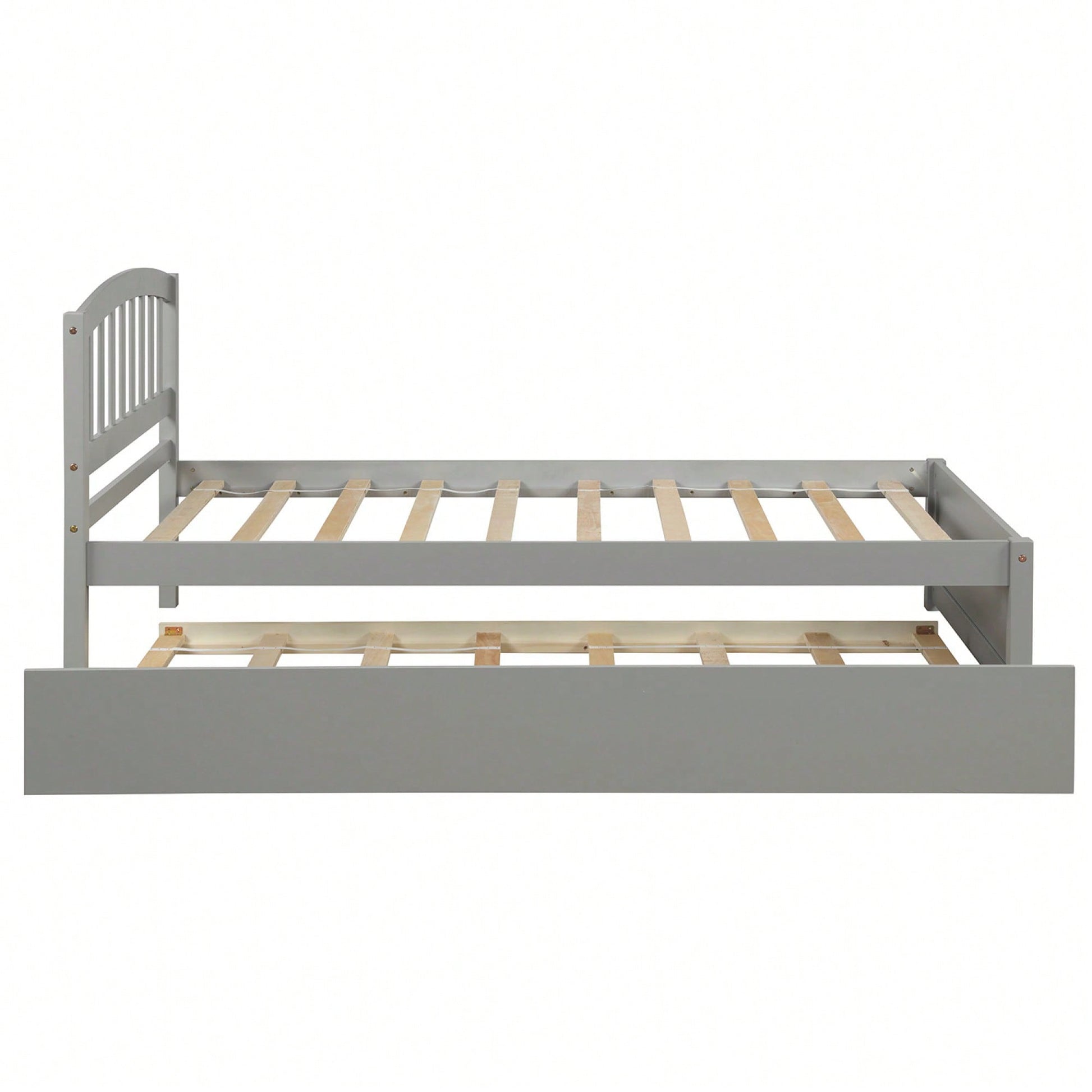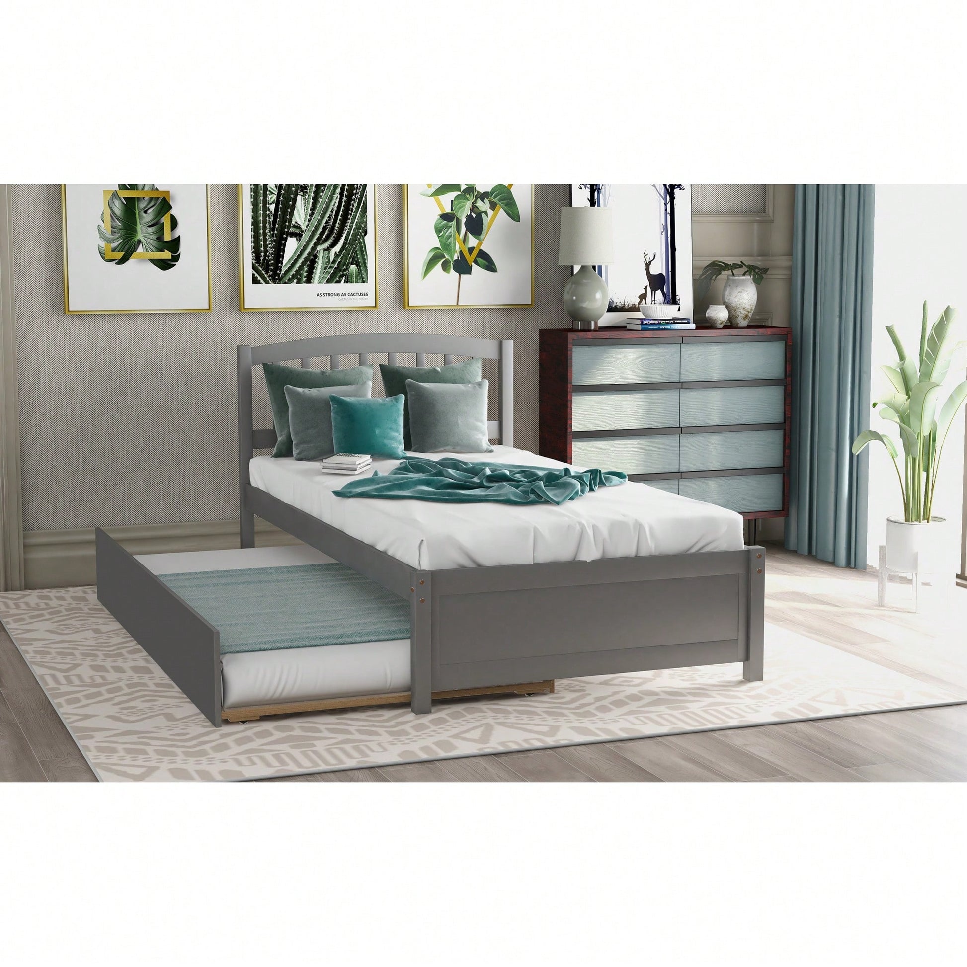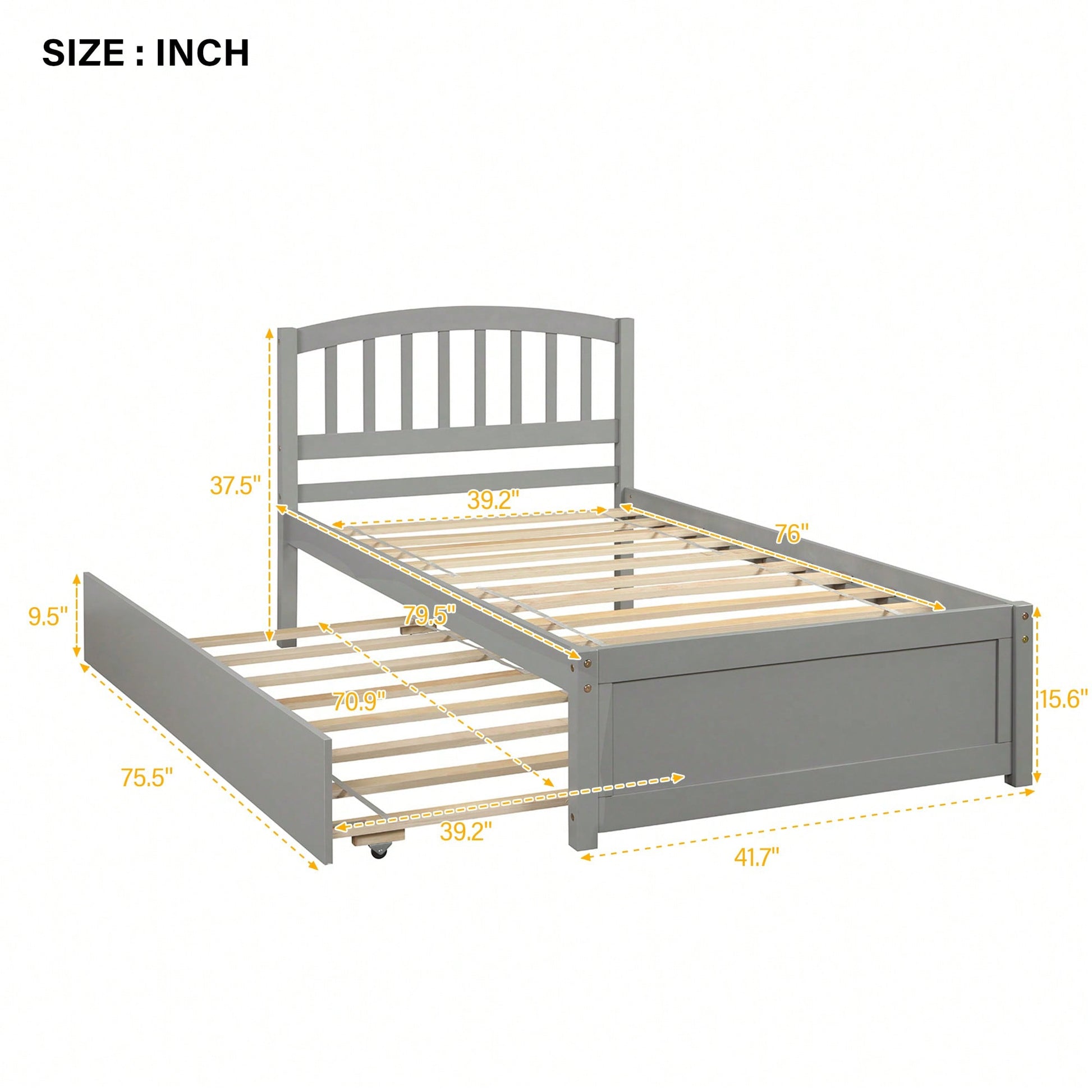 **Key Features:** - Elegant design with a clean silhouette, adding a modern yet timeless touch to any room - Crafted from high-quality solid pine wood for durability and sturdiness - Space-saving platform bed with a roll-out trundle for accommodating guests - No box spring or foundation required, with slats for extra mattress support - Promotes air circulation around the mattress for long-lasting freshness **Product Description:** This twin size platform bed frame features an elegant design that enhances the aesthetic of any bedroom. Made from solid pine wood, it offers a sturdy construction that ensures long-lasting use. The platform bed efficiently utilizes space, making it ideal for small rooms, while the convenient trundle provides an extra sleeping option for guests. With no need for a box spring, the bed supports your mattress with slats that allow for proper air circulation, keeping it fresh over time. Assembly is required, but clear instructions and tools are included for your convenience. **Specifications:** - Overall Product Dimensions: 79.5" L x 41.7" W x 37.5" H - Mattress not included - Some assembly required