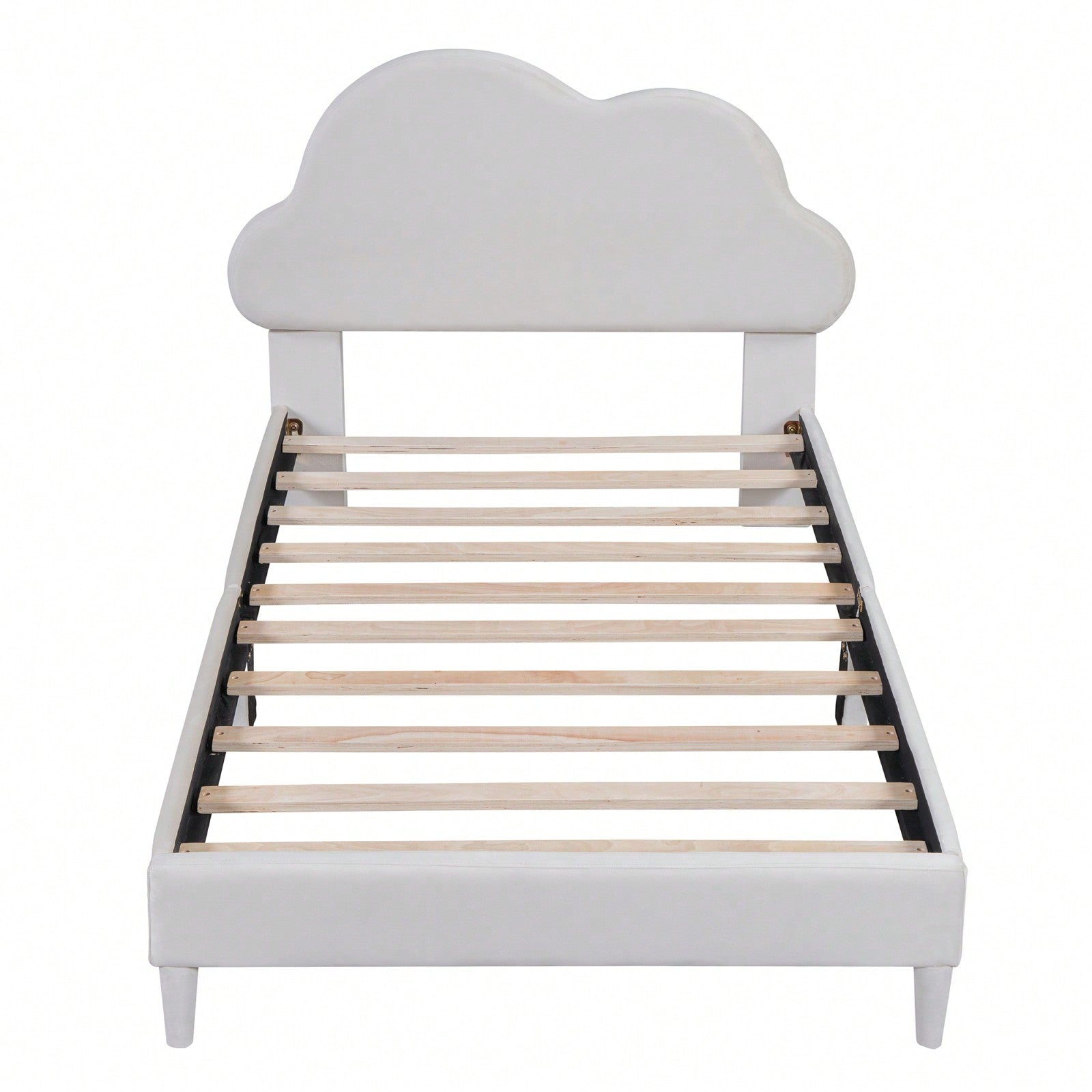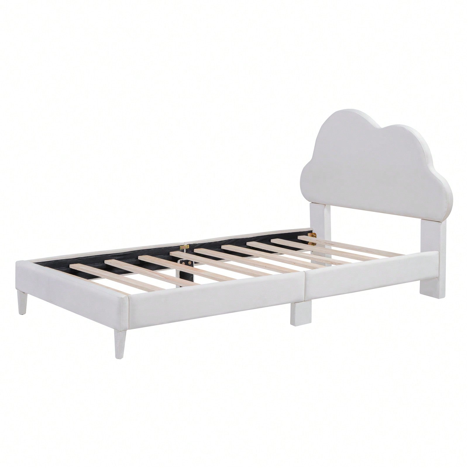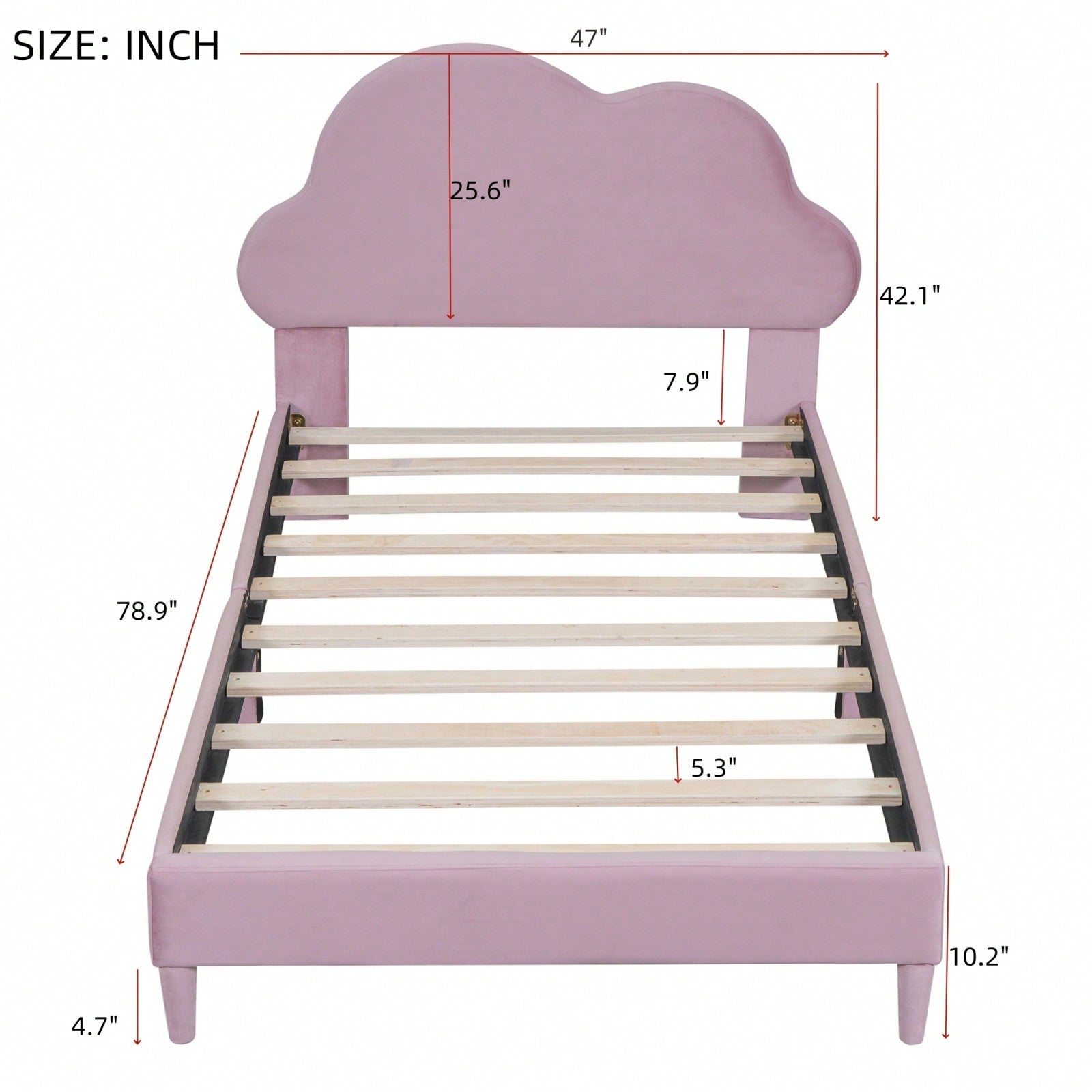 The Twin Size Upholstered Cloud-Shape Bed features a unique cloud-shaped headboard made of velvet, adding elegance to any bedroom. Made of MDF, plywood, and solid wood, this bed is sturdy and durable. With a weight capacity of 350LBS and 10 slats for support, this bed does not require a box spring. Assembly is required, but instructions and tools are provided. The overall dimensions are 78.9"L X 45"W X 42.1"H, suitable for a twin size mattress.