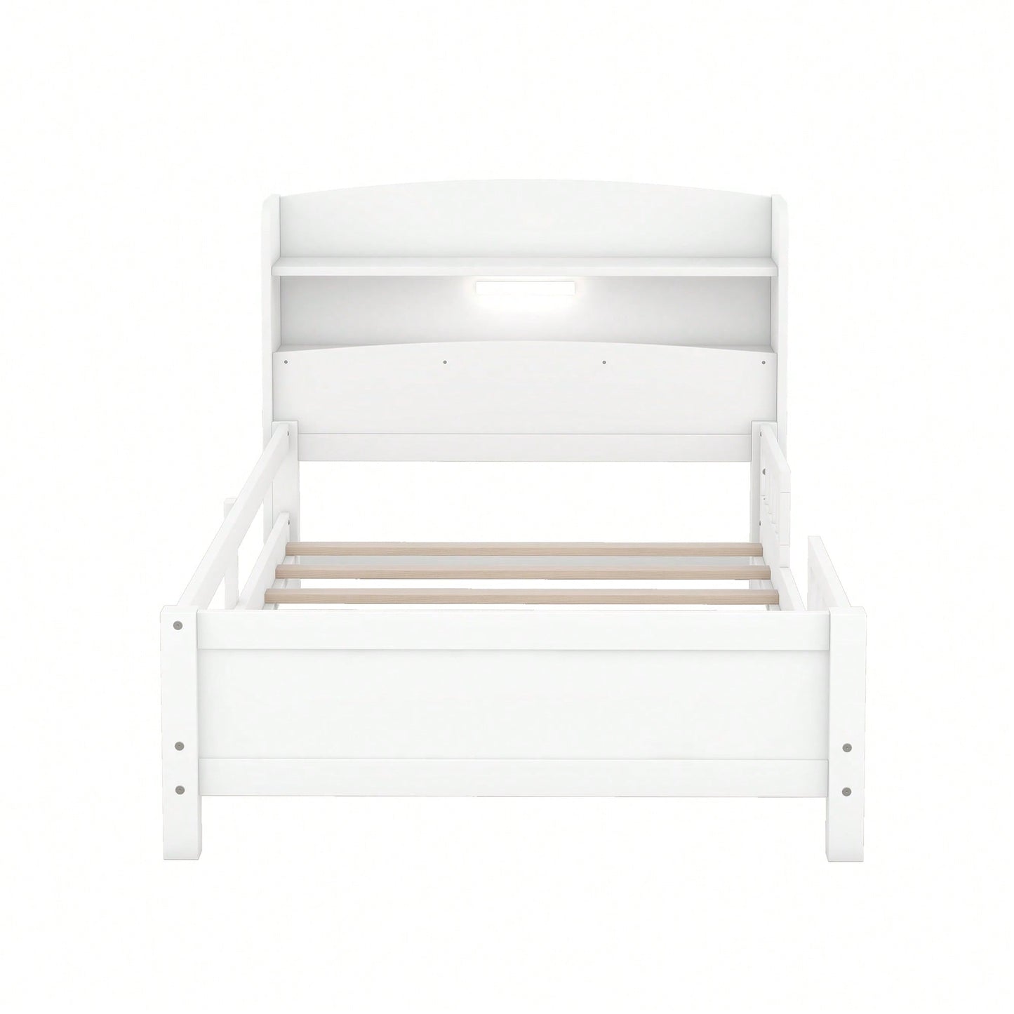 Twin Size Platform Bed With LED Lighting Storage Headboard And Safety Guardrail White