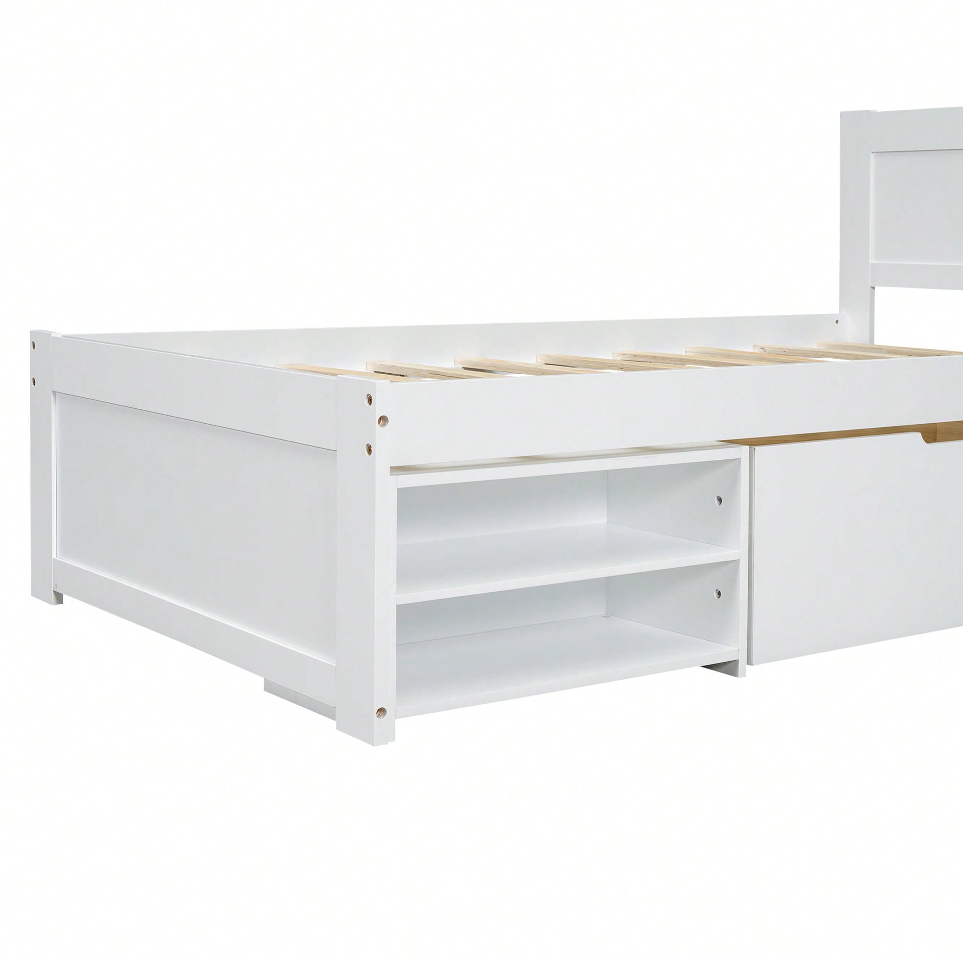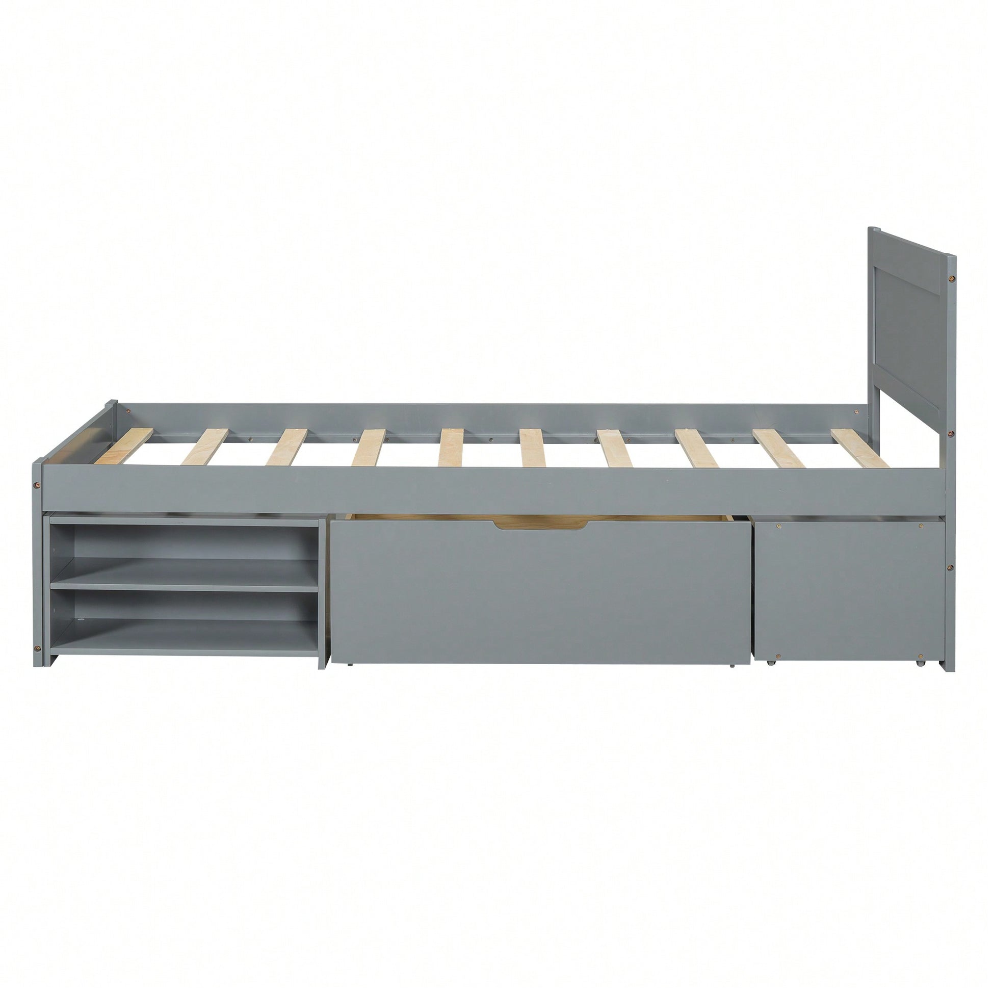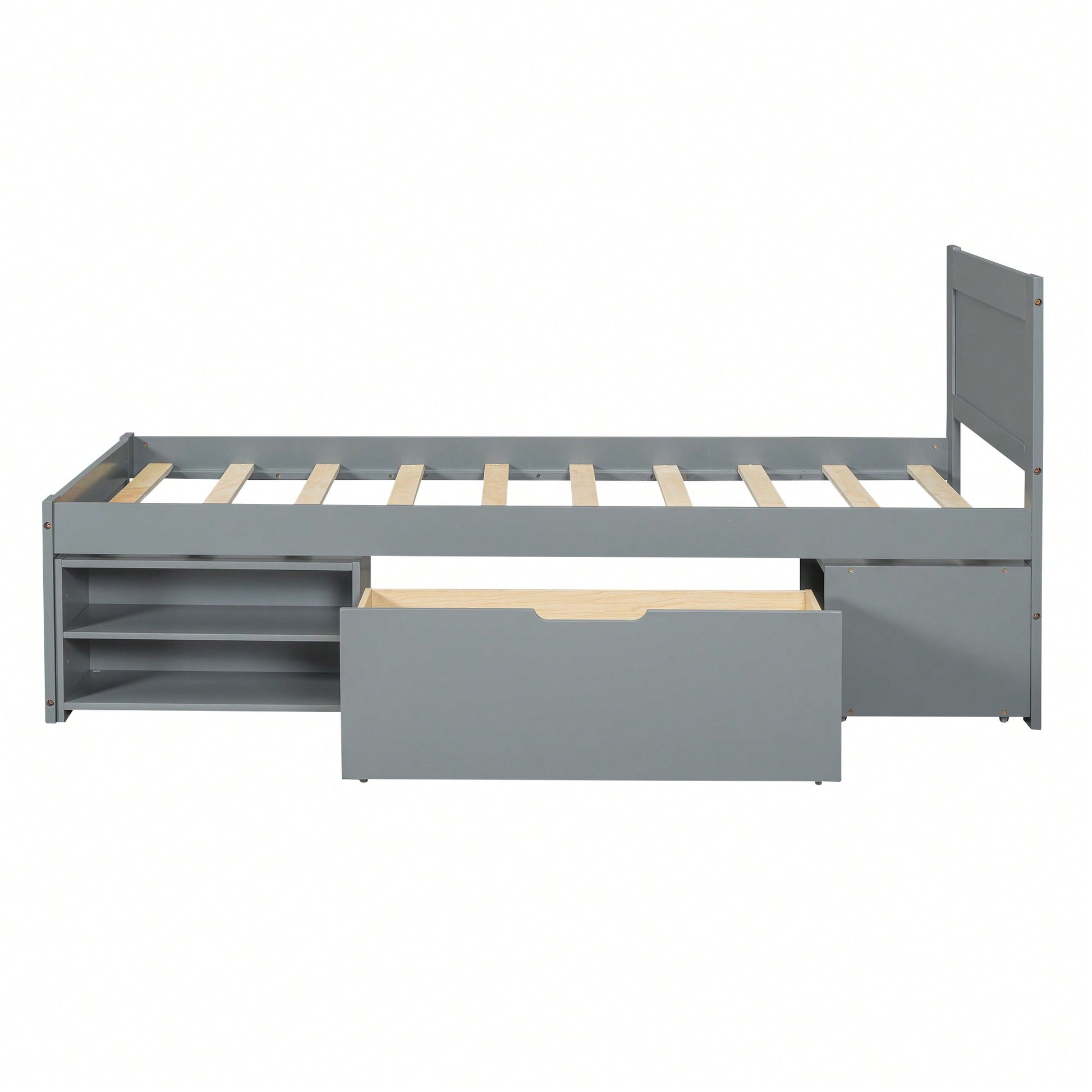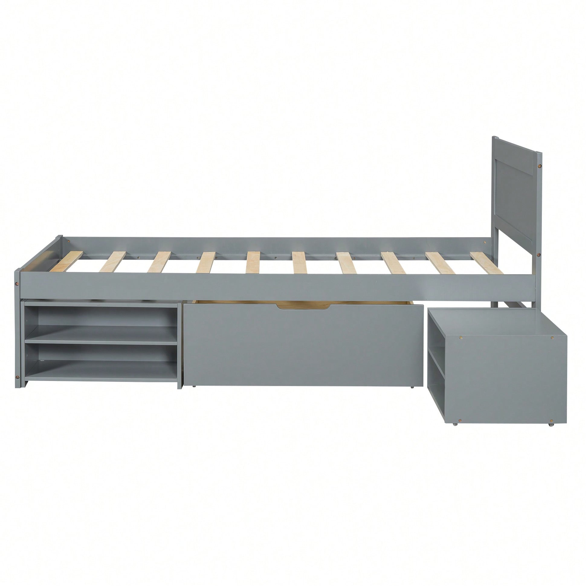 Twin Size Platform Bed With Storage Drawer And Two Shelves Gray
