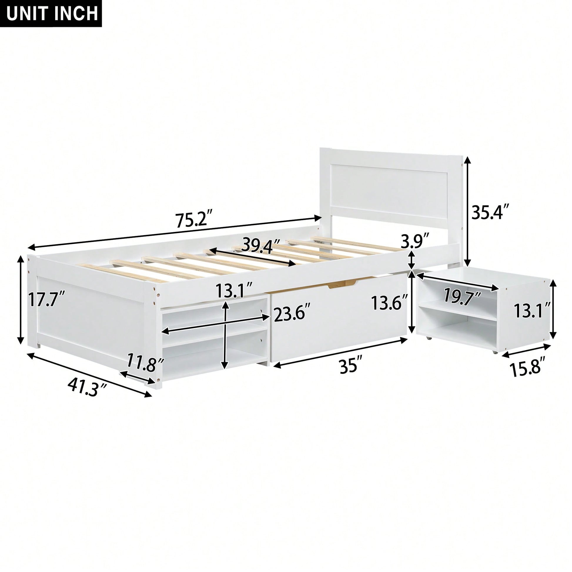 This twin size platform bed in gray offers a stylish and functional solution for your bedroom. It features a spacious drawer on wheels for convenient organization of your belongings, along with two double-layer storage shelves underneath to keep your room tidy. The sturdy frame is engineered for stability and noise reduction, ensuring a peaceful sleep environment. With wood slats that eliminate the need for a box spring, this bed supports your mattress effectively and enhances its longevity. Assembly is straightforward, thanks to the clearly labeled parts and step-by-step manual.