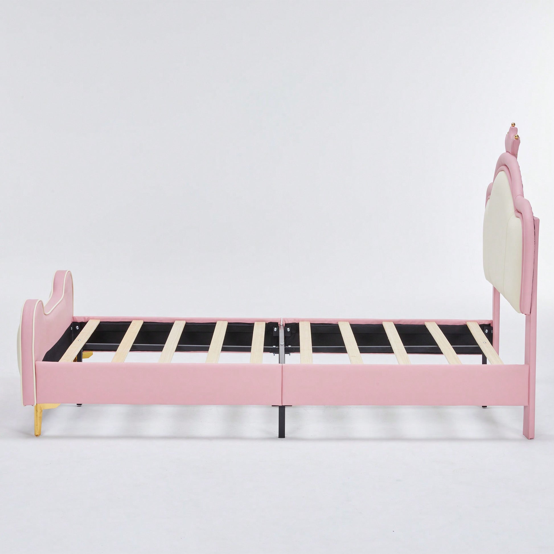 This twin size princess bed features a charming crown-shaped headboard, perfect for enhancing any child's bedroom decor. Crafted from high-quality pine wood, the bed frame is designed to withstand humidity changes and resist cracking. It includes strong legs, wide boards, and a slatted frame that provides excellent stability and support. The bed is upholstered in PU leather for a stylish finish and requires no box spring, making it a practical choice for kids. Assembly is straightforward, and all necessary tools are provided for a hassle-free setup.