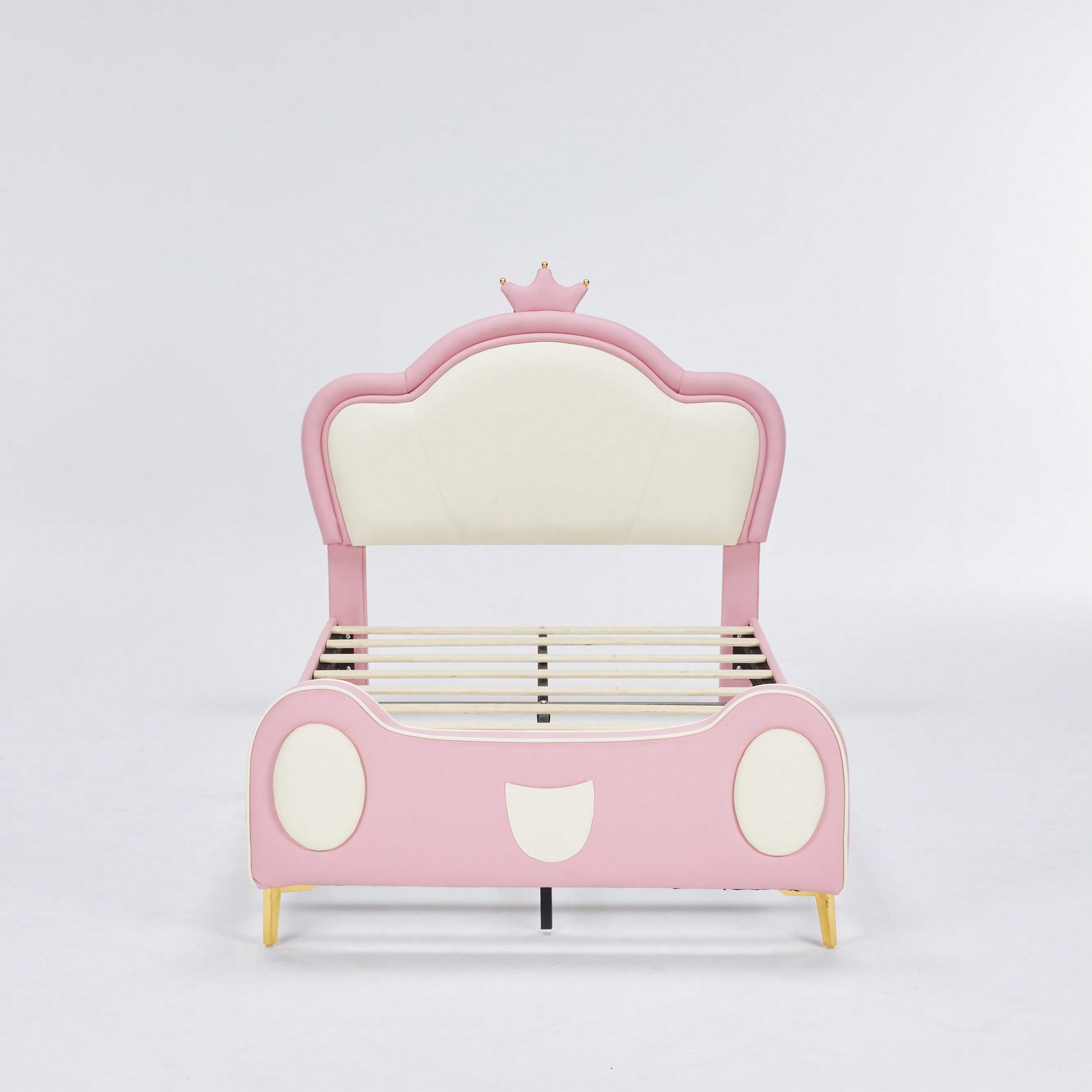 Twin Size Princess Bed With Crown Headboard And Storage Pocket, PU Upholstered Platform Bed For Kids, Easy Assembly, Pink