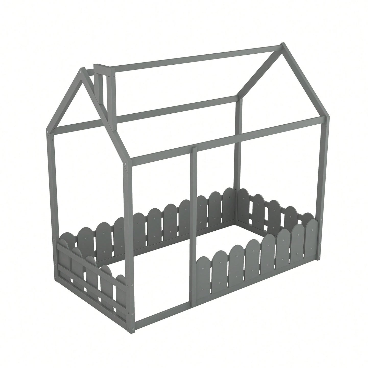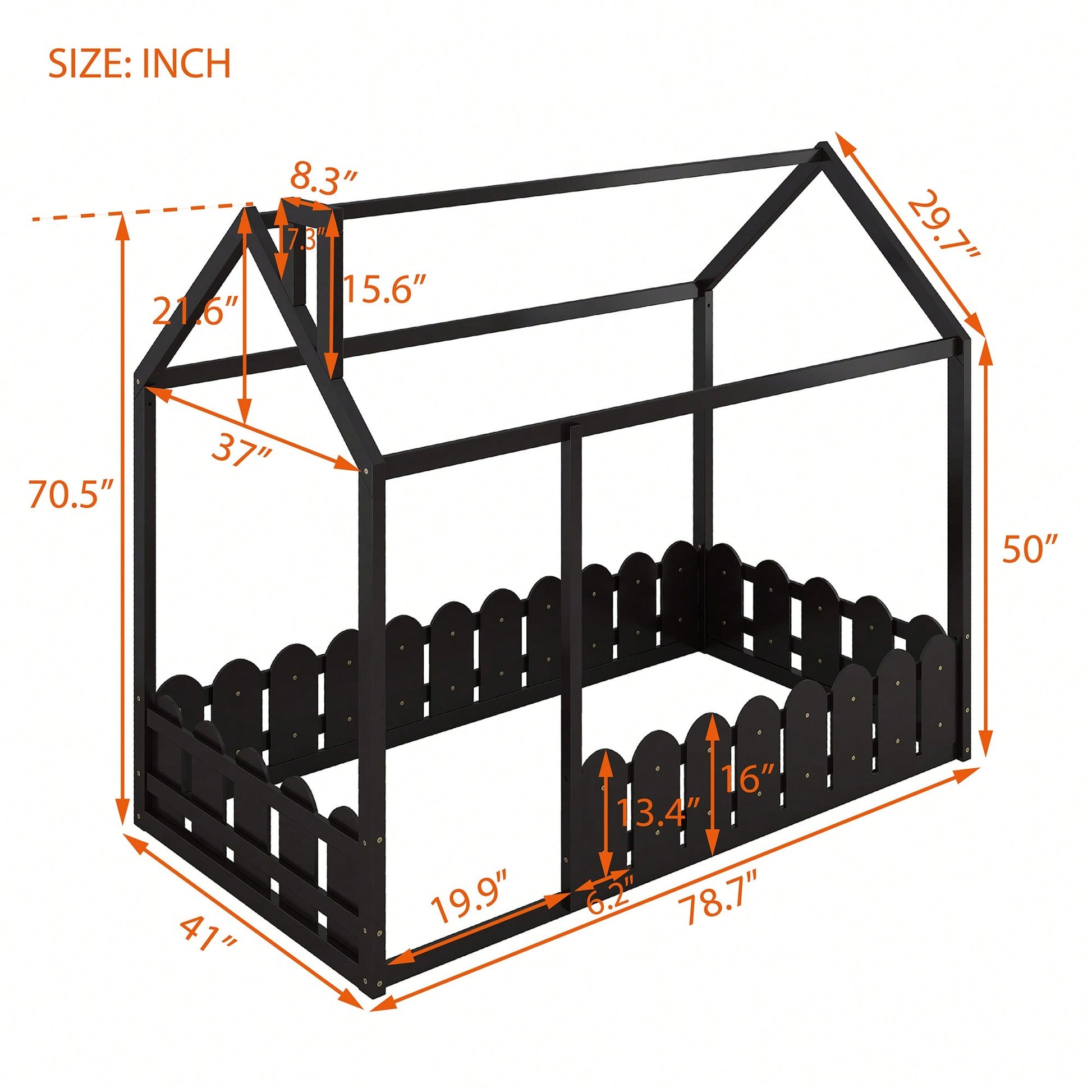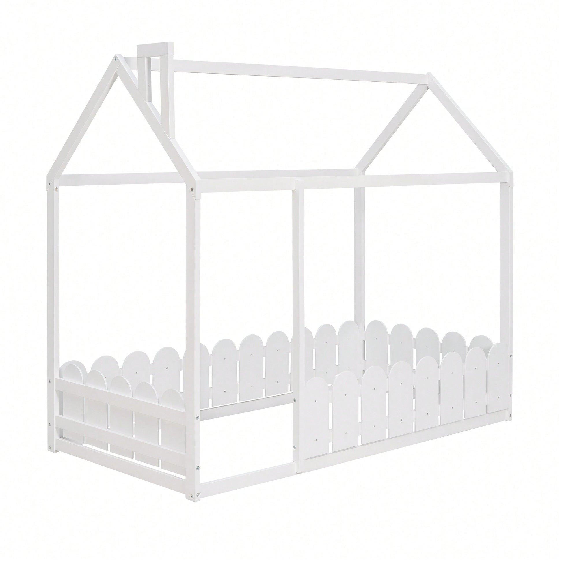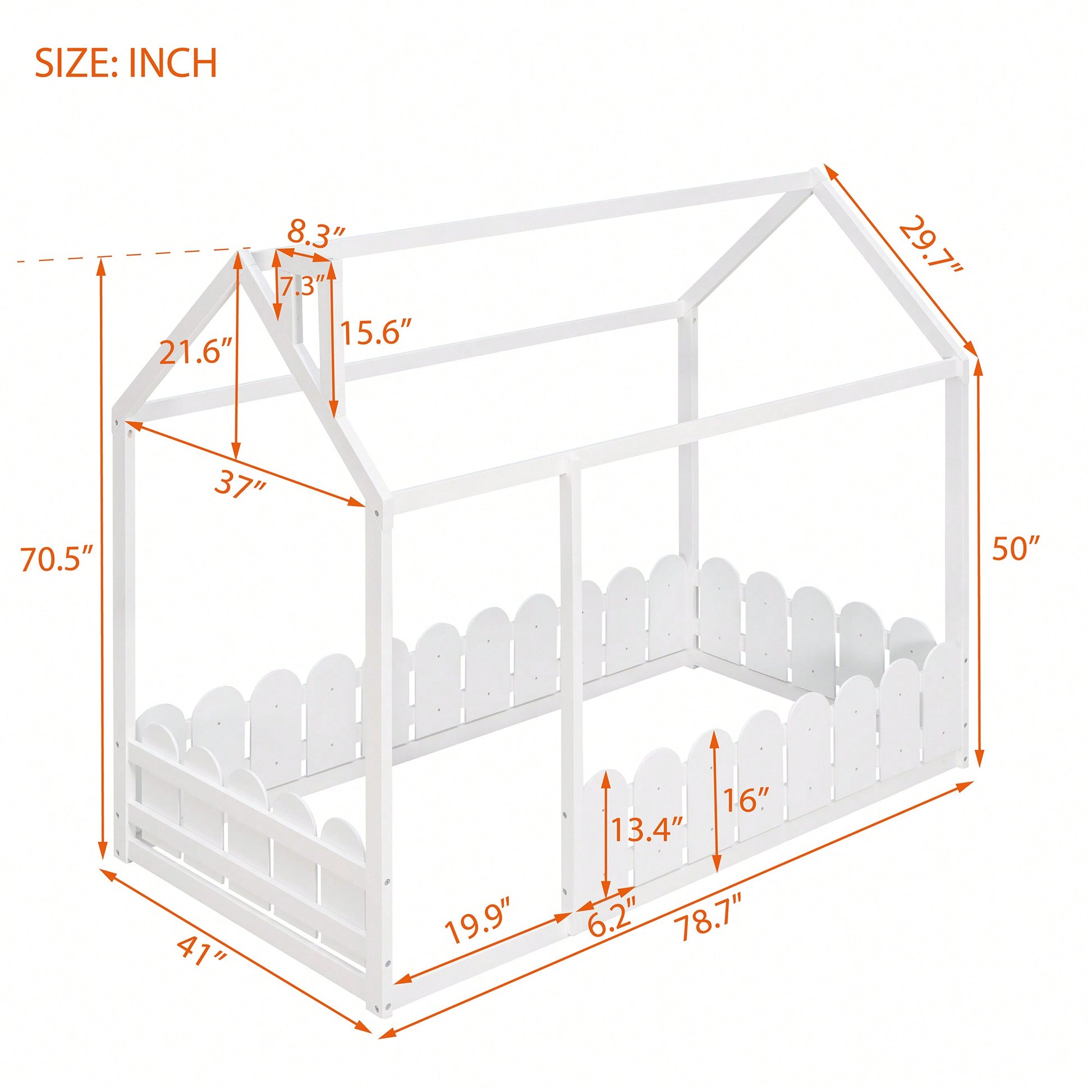 **Key Features** - Playhouse design with roof and fence for a fun sleeping and play area - Semi-enclosed space promotes a comforting atmosphere for better sleep - Sturdy pinewood frame ensures stability and durability - Slats are not included; requires box springs or foundations - Easy to assemble with clear instructions and hardware included **Product Description** This twin size wood house bed frame is perfect for kids and teens, offering a playful yet functional design. The unique playhouse style not only provides a cozy sleeping area but also encourages imaginative play. The semi-enclosed structure enhances the sleeping environment, creating a comforting space while ensuring proper air circulation. Crafted from high-quality pinewood, this bed frame is built to last, providing stability and durability for years to come. Please note that slats are not included, so a box spring or foundation is required for use. **Specifications** - Overall dimensions: 78.7" x 41" x 70.5" (L x W x H) - Weight capacity: no limit - Package includes: 1 package with clear instructions and hardware