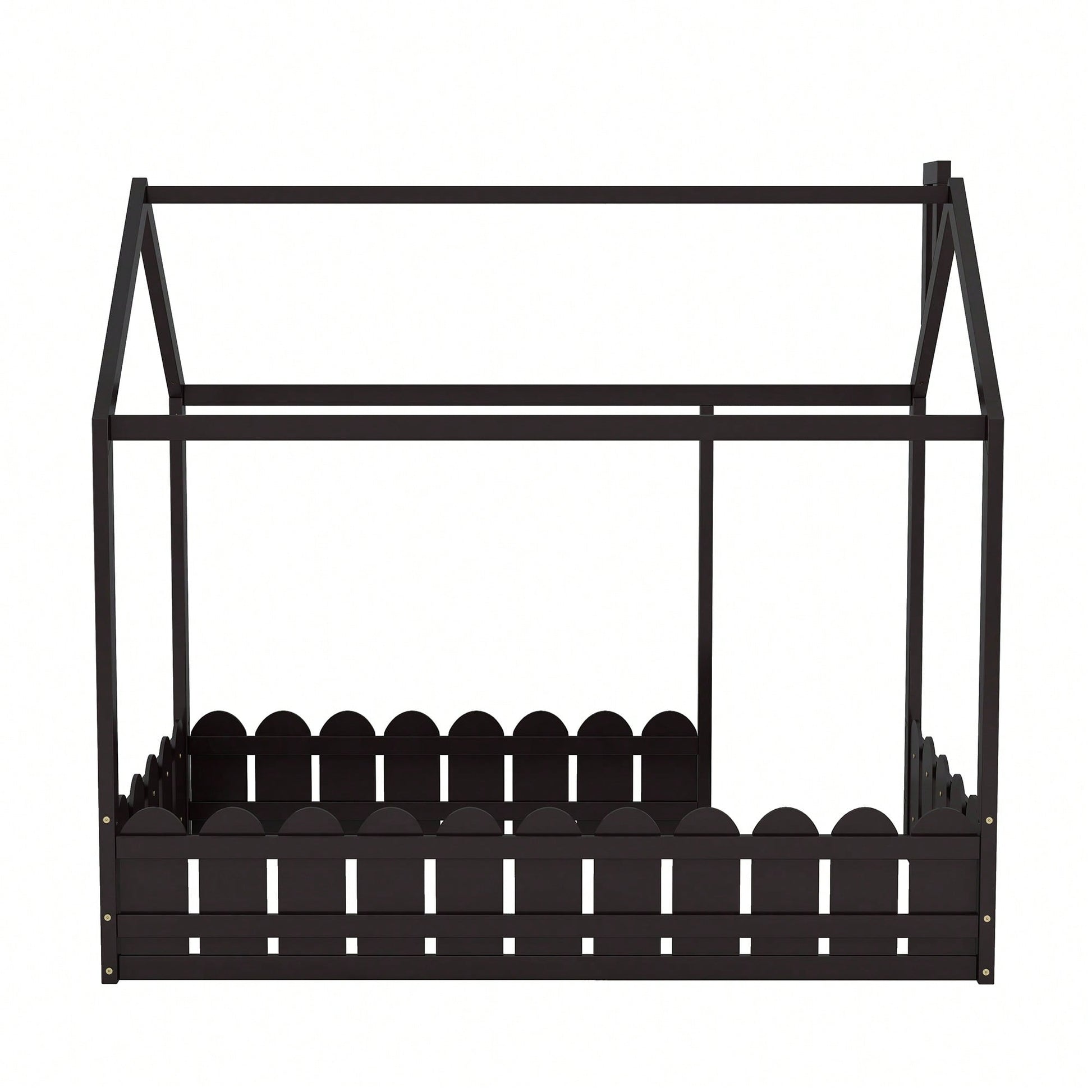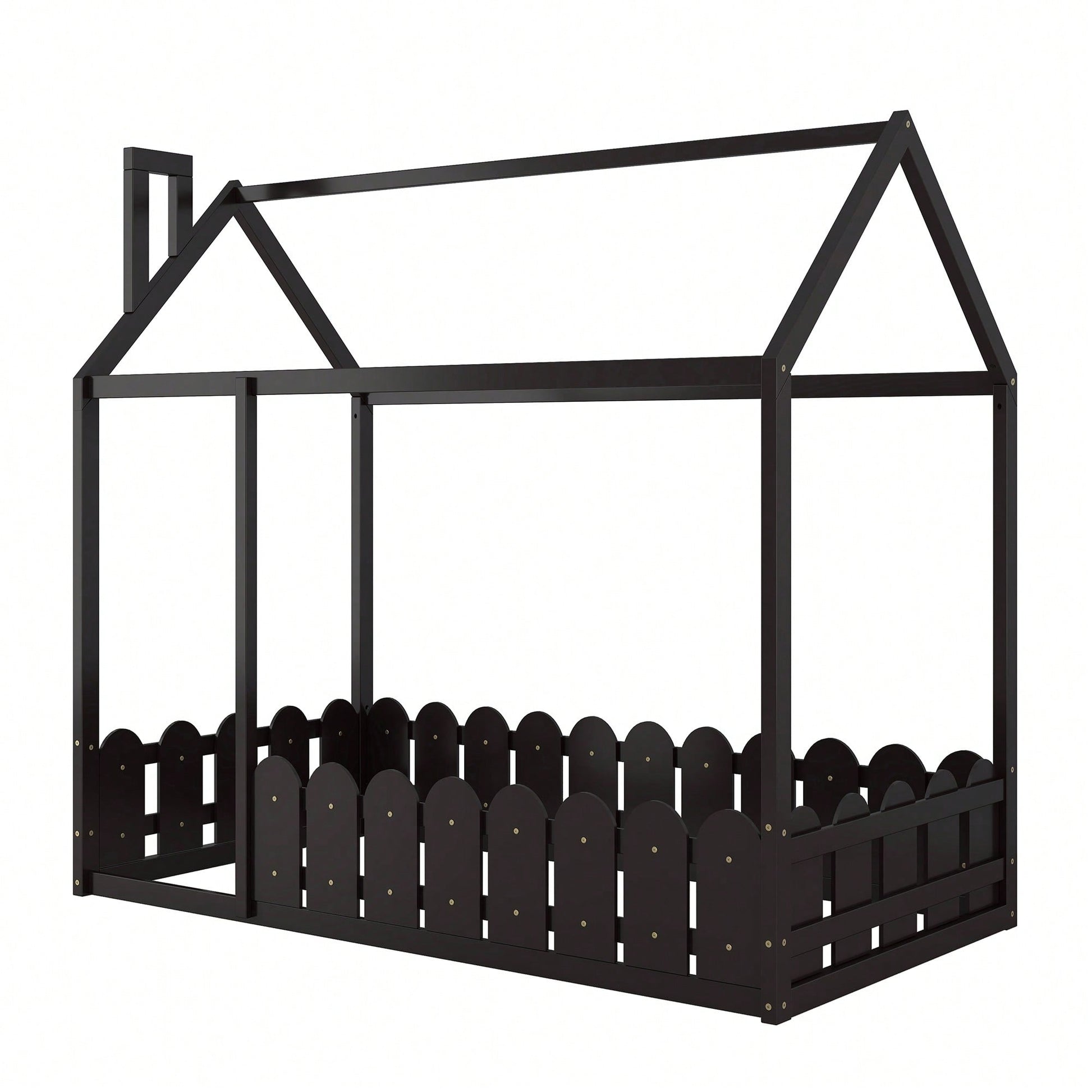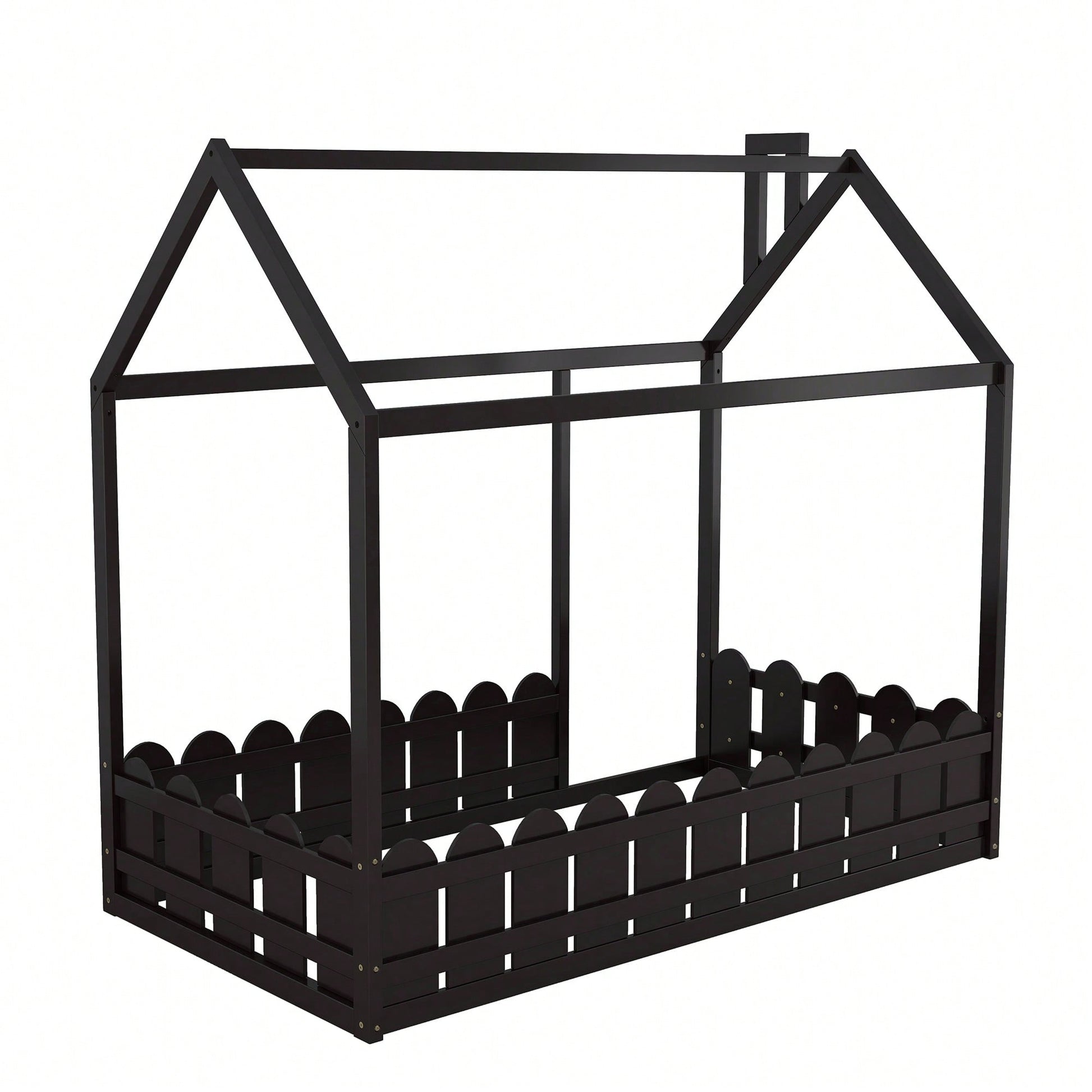 Twin Size Wooden House Bed Frame With Fence For Kids And Teens In Espresso Finish