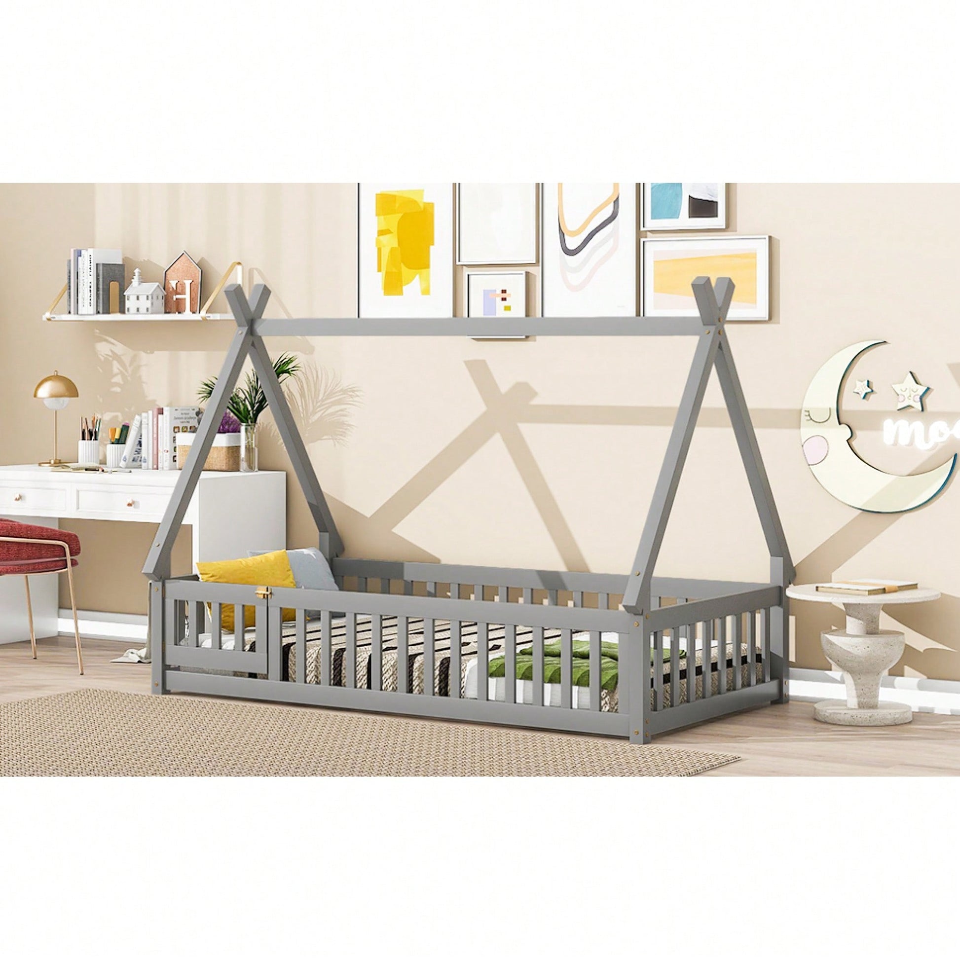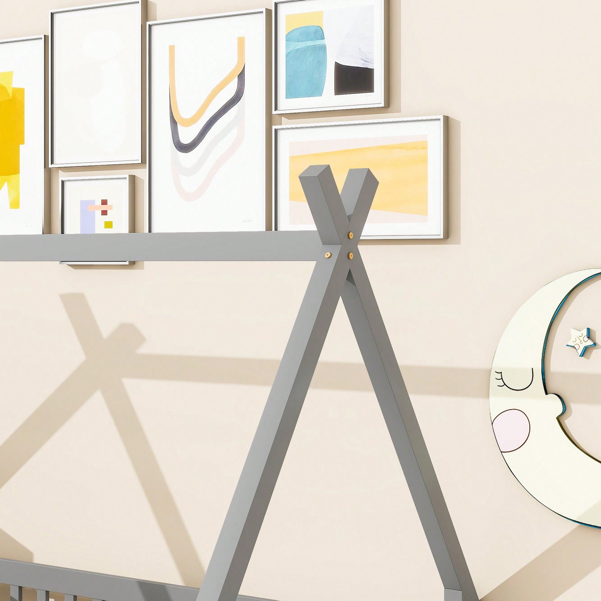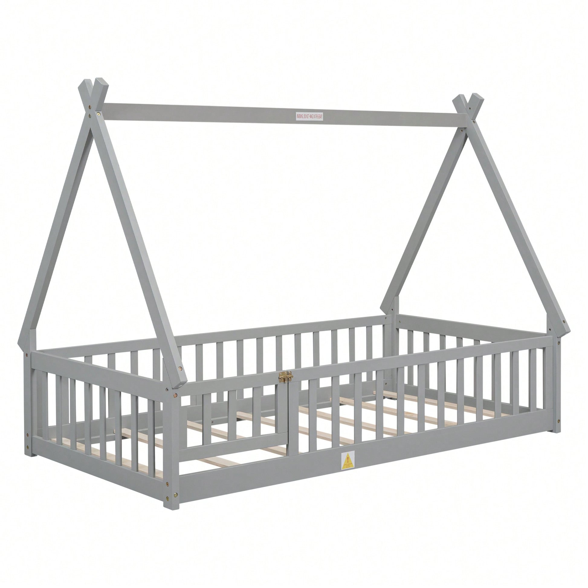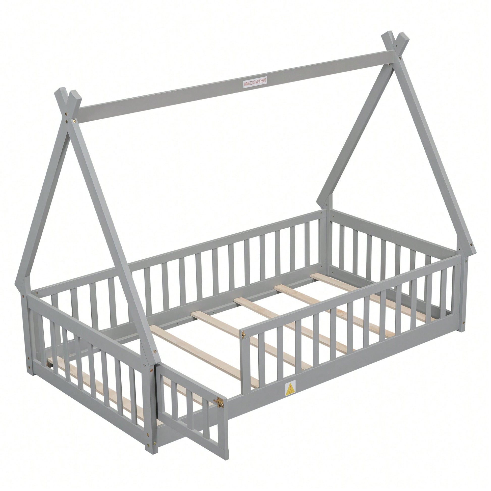 Twin Tent-Shaped Floor Bed With Guardrails And Slats In Grey For Safe And Cozy Sleep Space