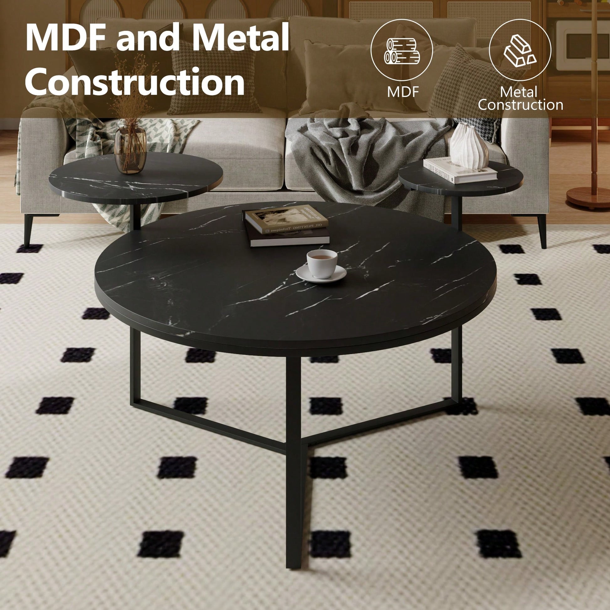 This modern coffee table effortlessly elevates your living space with its sleek design and practical features. Its two open shelves provide ample space for displaying books, decorative items, or keeping essentials within reach. The faux marble surfaces exude sophistication and blend seamlessly with various decor styles. Supported by a sturdy tripod-inspired base, this coffee table offers both stability and visual intrigue. Its rounded tabletop edges add a touch of softness and enhance safety.