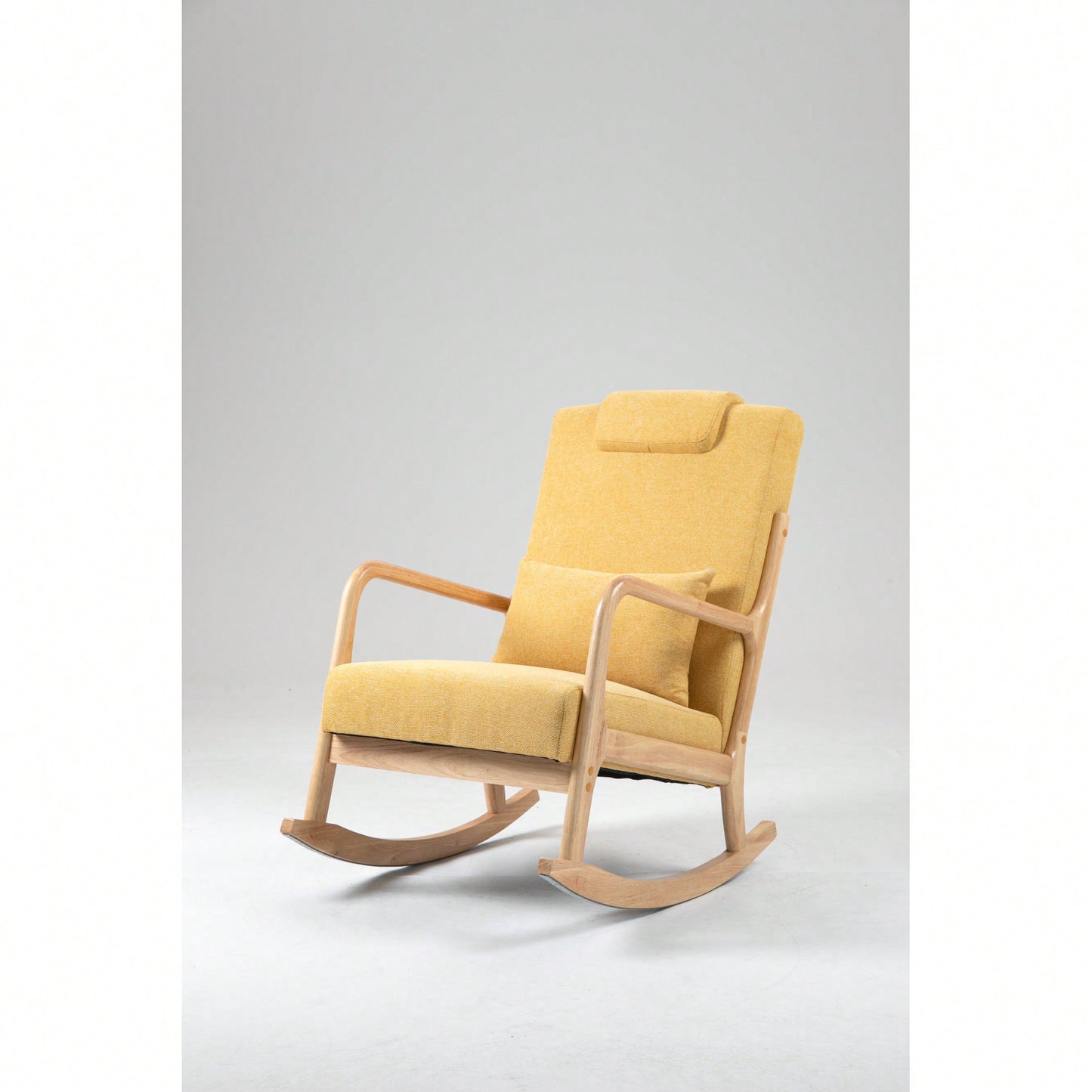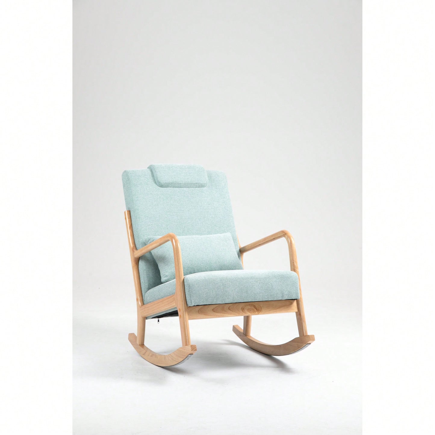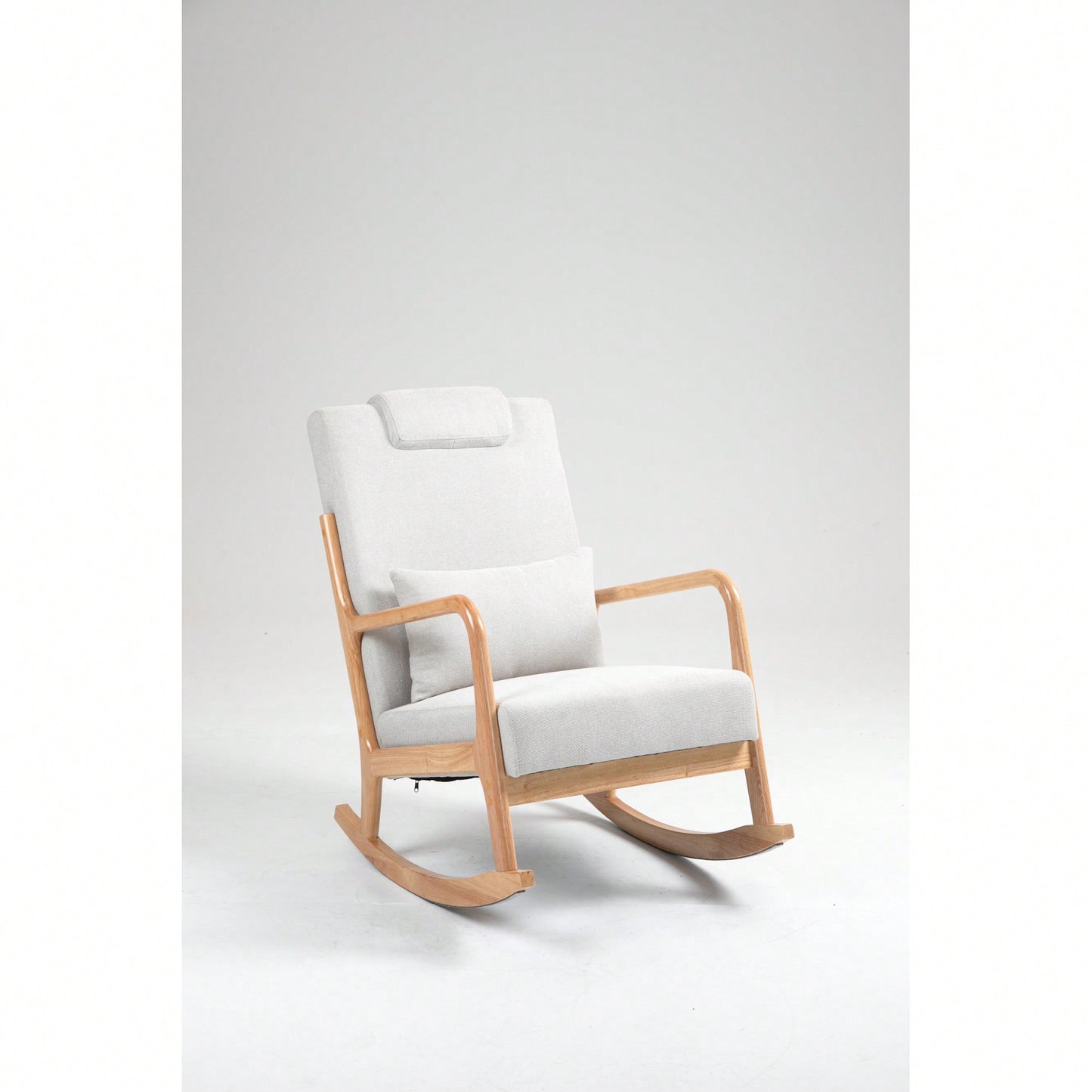 **Key Features:** - Firm solid wood base supports up to 300 pounds - Cushioned seats with high-density foam for comfort - Ergonomically designed high backrest and armrests for relaxation - Smooth swinging function for a soothing experience - Modern design complements both traditional and contemporary decor **Product Description:** This upholstered fabric rocking armchair is perfect for indoor use, featuring a high backrest and lumbar pillow for added support. The chair's solid wood base is not only firm but also enhances durability, while the cushioned seats and high-density foam ensure a comfortable seating experience. The ergonomic design allows you to relax your arms and hands, making it an ideal choice for your living room. Its modern aesthetic seamlessly blends with various decor styles, making it a versatile addition to any space. **Specifications:** - Weight capacity: 300 pounds - Material: Solid wood base, iron backrest frame, high-density foam - Includes: Lumbar pillow - Design: Ergonomic high backrest with armrests