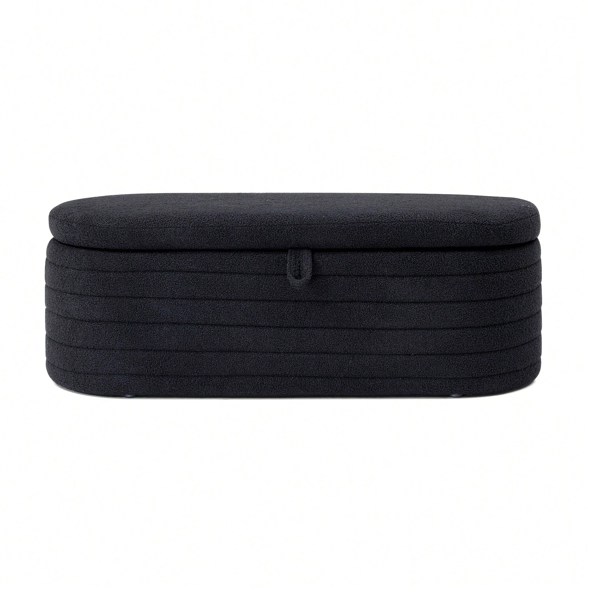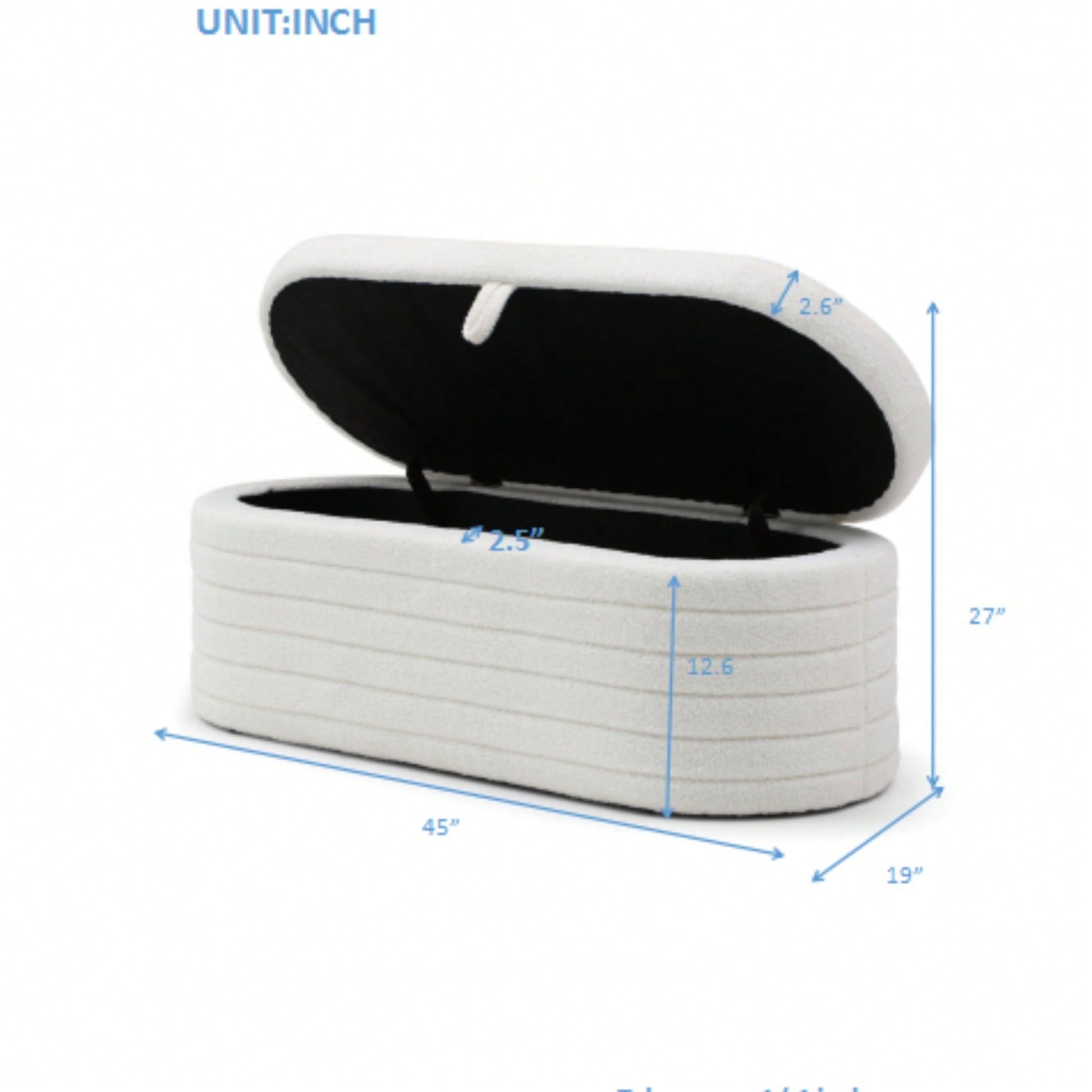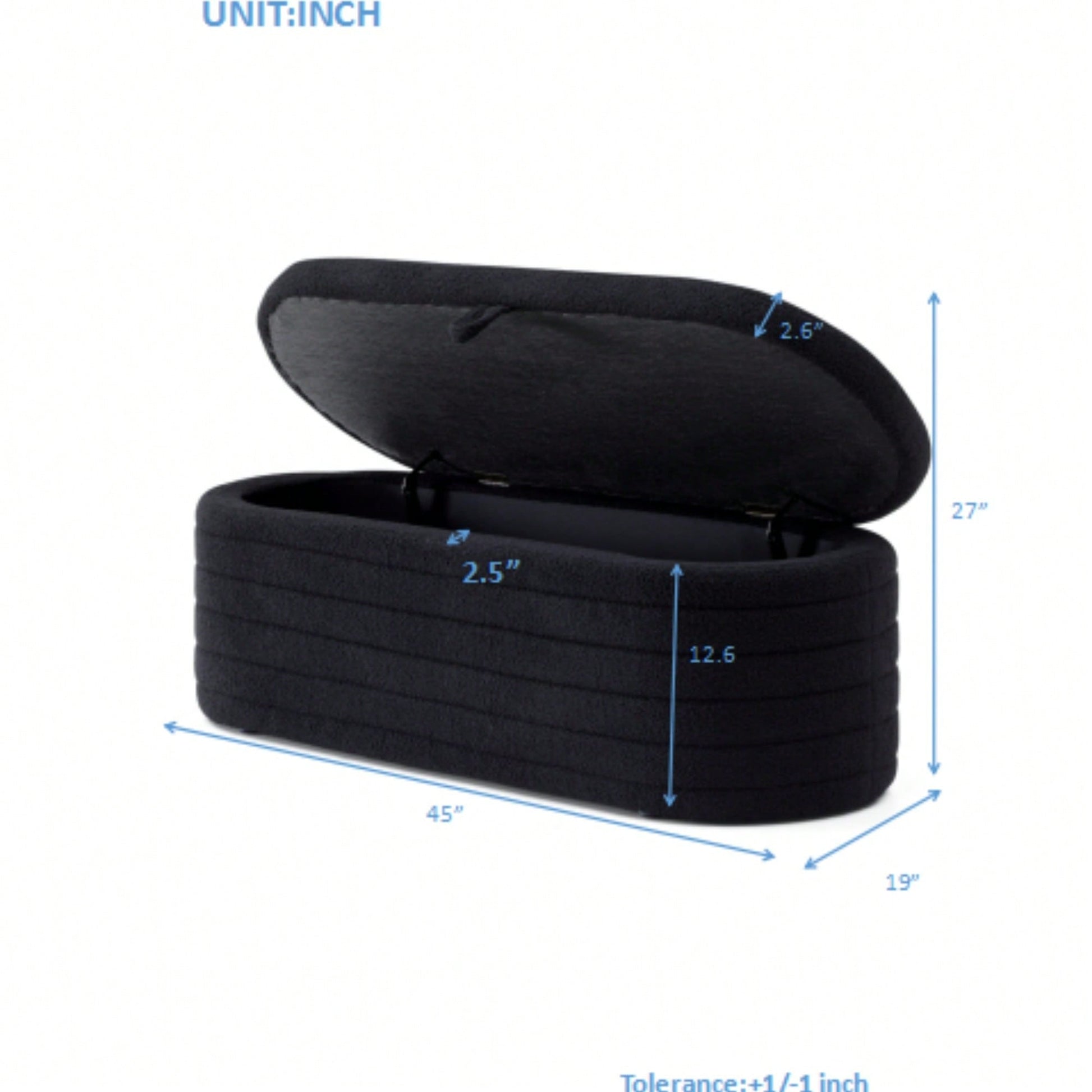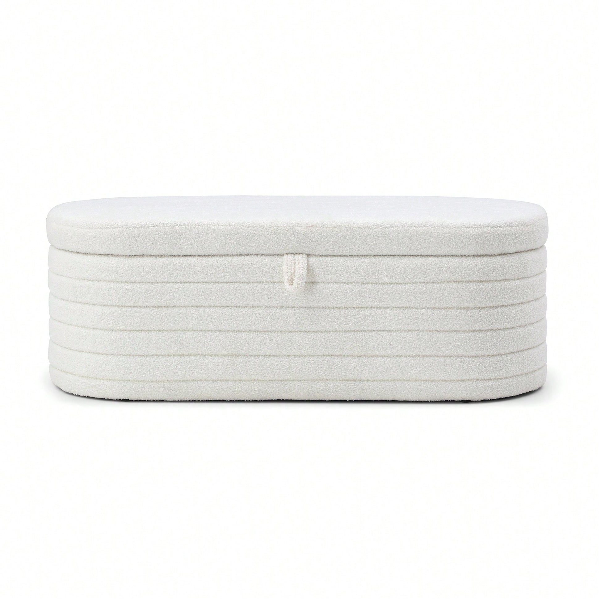 1. Key Features: - Modern silhouette with large pleats and soft curves - Ample storage space with pull ring for easy access - Versatile use as ottoman, coffee table, footstool, or extra seating - Stylish addition to bedroom, living room, or entryway - Upholstered in soft sherpa fabric for comfort and elegance 2. Product Description: This modern end of bed bench combines functionality and style, featuring a sleek design with artistic pleats and soft curves. The large storage compartment is perfect for organizing toys, shoes, or blankets, and the convenient pull ring allows for easy opening. Its versatile nature makes it suitable for various uses, whether as an ottoman, coffee table, or extra seating for guests. The bench is upholstered in soft sherpa fabric, adding a touch of comfort and elegance to any room. Specifications: - Material: Sherpa fabric - Dimensions: Large storage capacity - Color: Beige