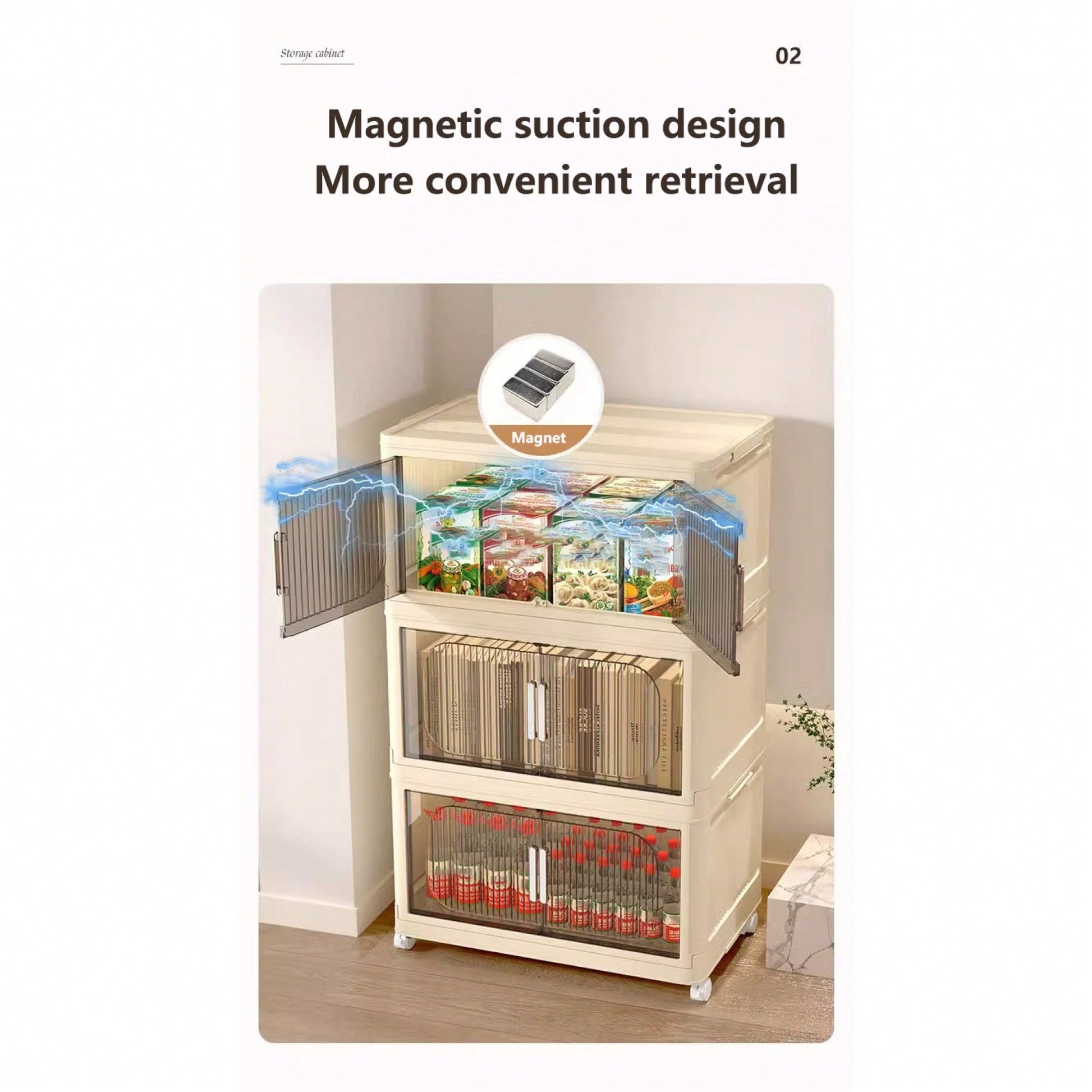 3-Tier Collapsible Storage Cabinet with Magnetic Doors and Rolling Bins for Home Organization
