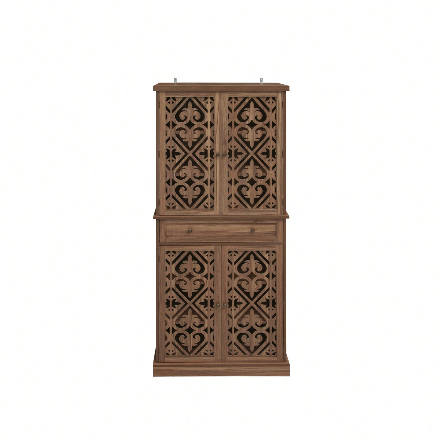 1. Features - 4 door cabinet with 1 drawer - 4 adjustable inner shelves for versatile storage - Estimated load capacity of 210 pounds - Carved door panel with a symmetrical pattern for aesthetic appeal - Metal hinges allow for 180-degree door opening 2. Product Description This stylish storage cabinet combines functionality with elegant design. Featuring a segmented structure, it is easy to assemble and includes 4 adjustable inner shelves, allowing for customized storage options. The cabinet is crafted using triamine material, enhancing its scratch resistance and waterproof capabilities. The beautifully carved door panel not only adds to its charm but also ensures good air permeability. Equipped with metal hinges for smooth operation and anti-toppling accessories for safety, this cabinet is a practical choice for any home. Specifications - Material: Triamine - Load Capacity: 210 pounds - Number of Shelves: 4 adjustable inner shelves - Assembly: Easy segmented structure