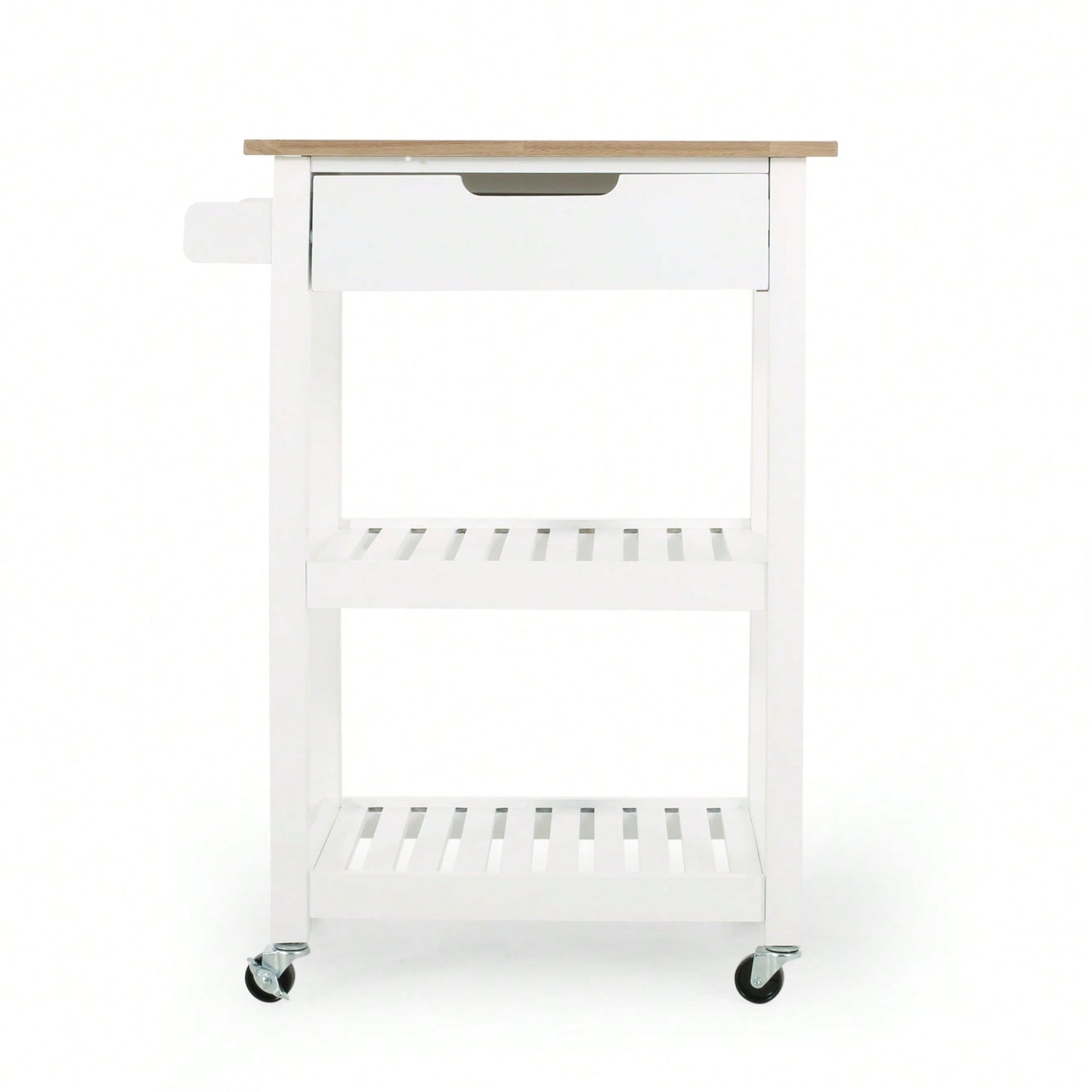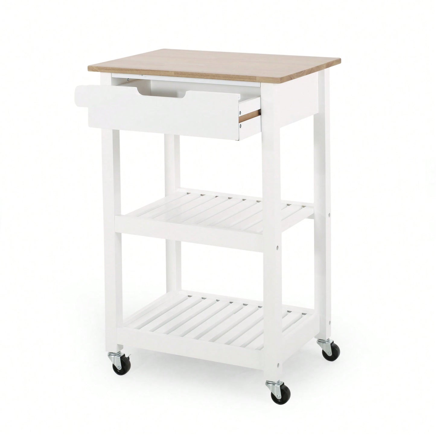 This kitchen cart combines style and functionality, making it an excellent addition to any home. The cart features a contemporary design characterized by clean lines and sleek open slat shelving, perfect for upgrading your kitchen space. With a long drawer and two additional shelves, it provides ample storage options for organizing kitchen accessories. The rubberwood top adds a touch of elegance with its natural grain, and the overall structure emphasizes comfort and ease of use. Ideal for smaller living spaces, this cart's compact dimensions make it a practical choice for limited areas. Additionally, it is equipped with rolling casters that can be locked in place for safety and convenience.