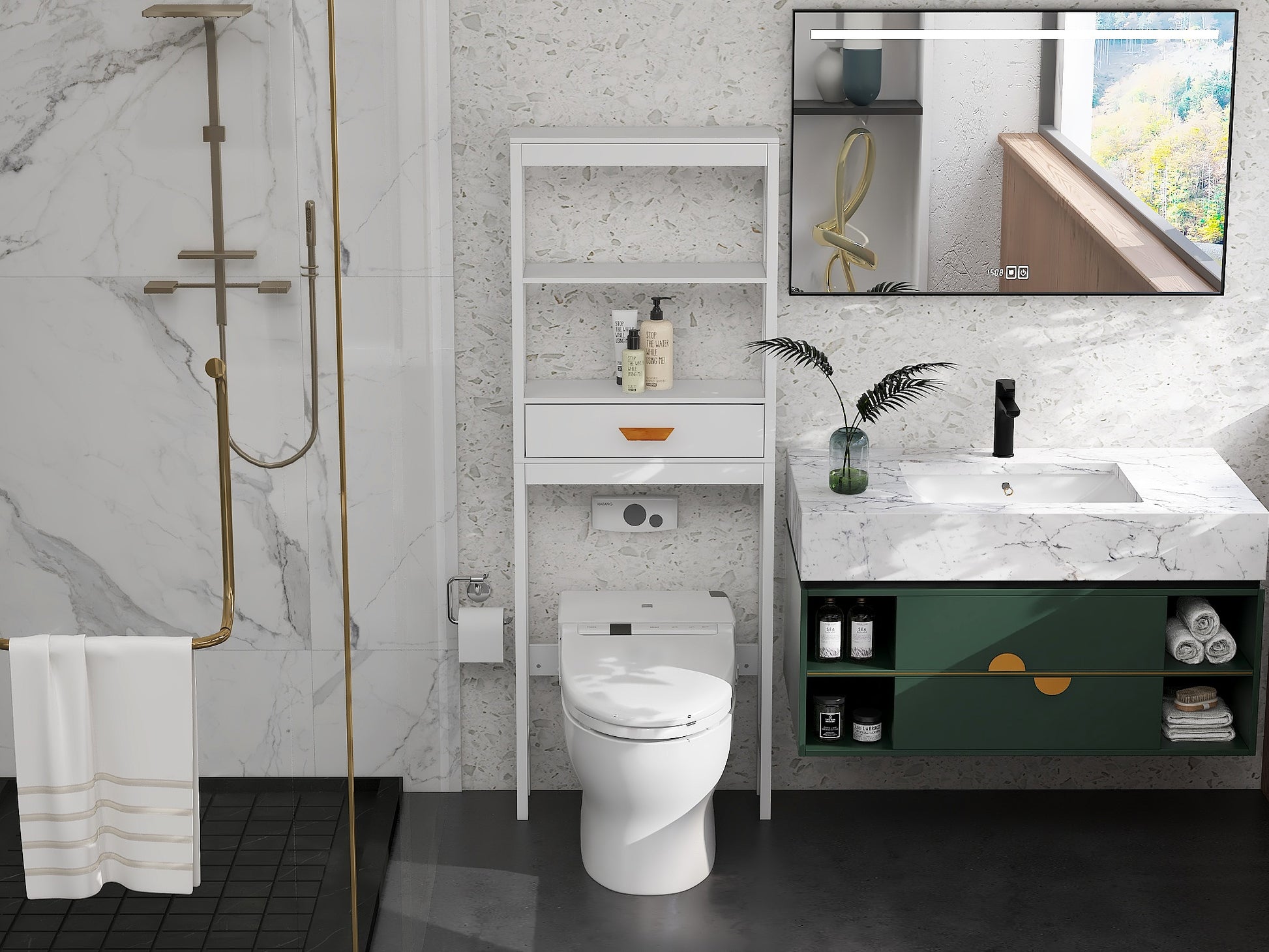 This over-the-toilet storage cabinet is designed to maximize bathroom space while providing an elegant and functional solution for your storage needs. With its stylish and modern appearance, it seamlessly fits into any bathroom decor while ensuring you have easy access to essential bath items.